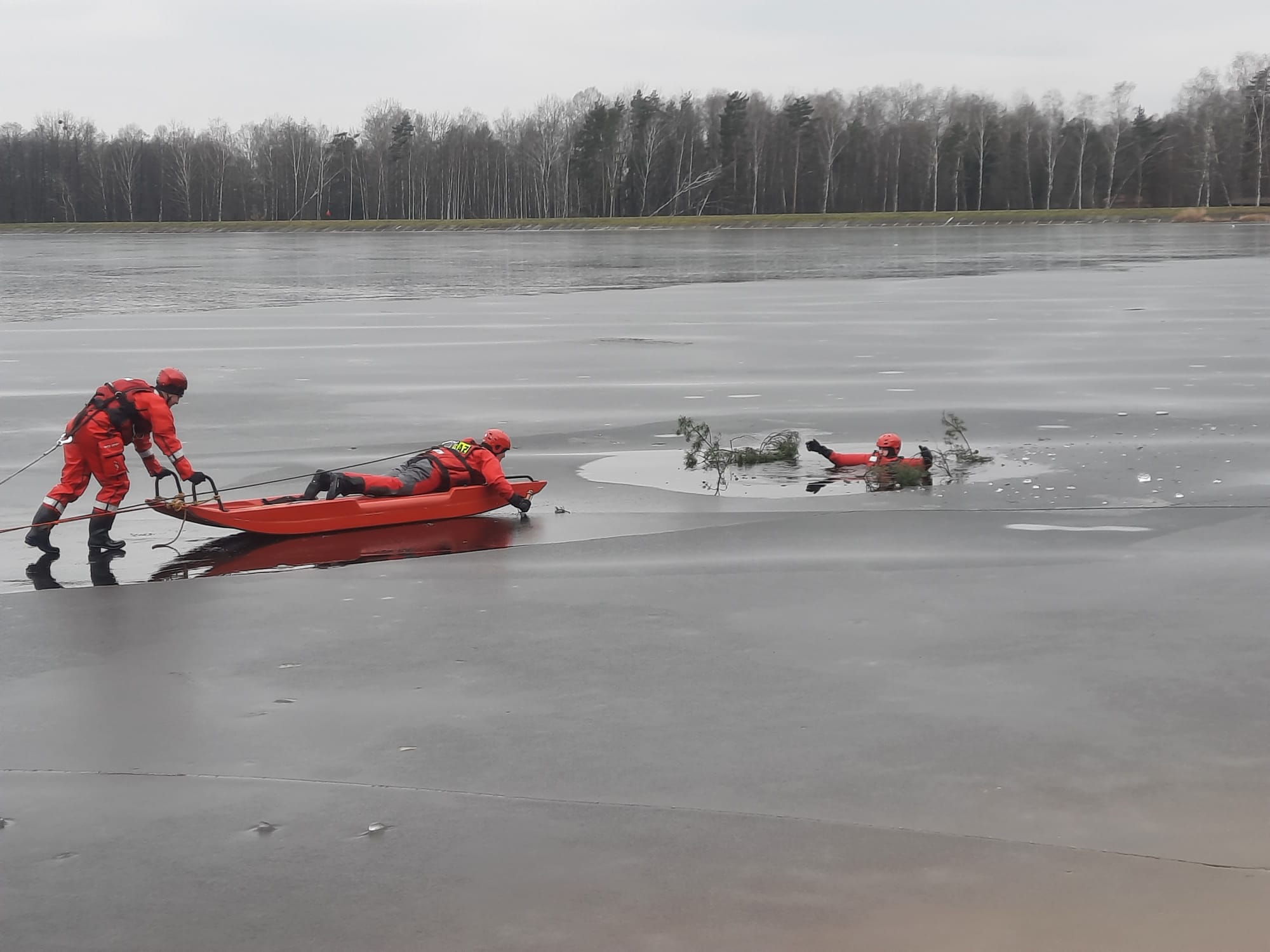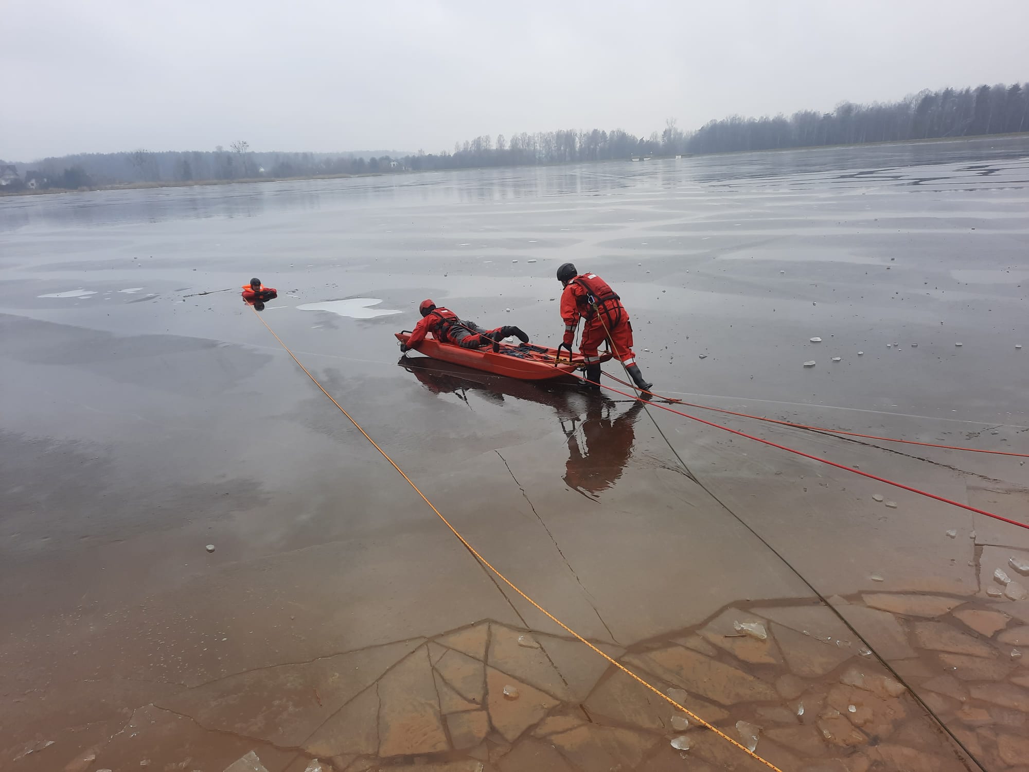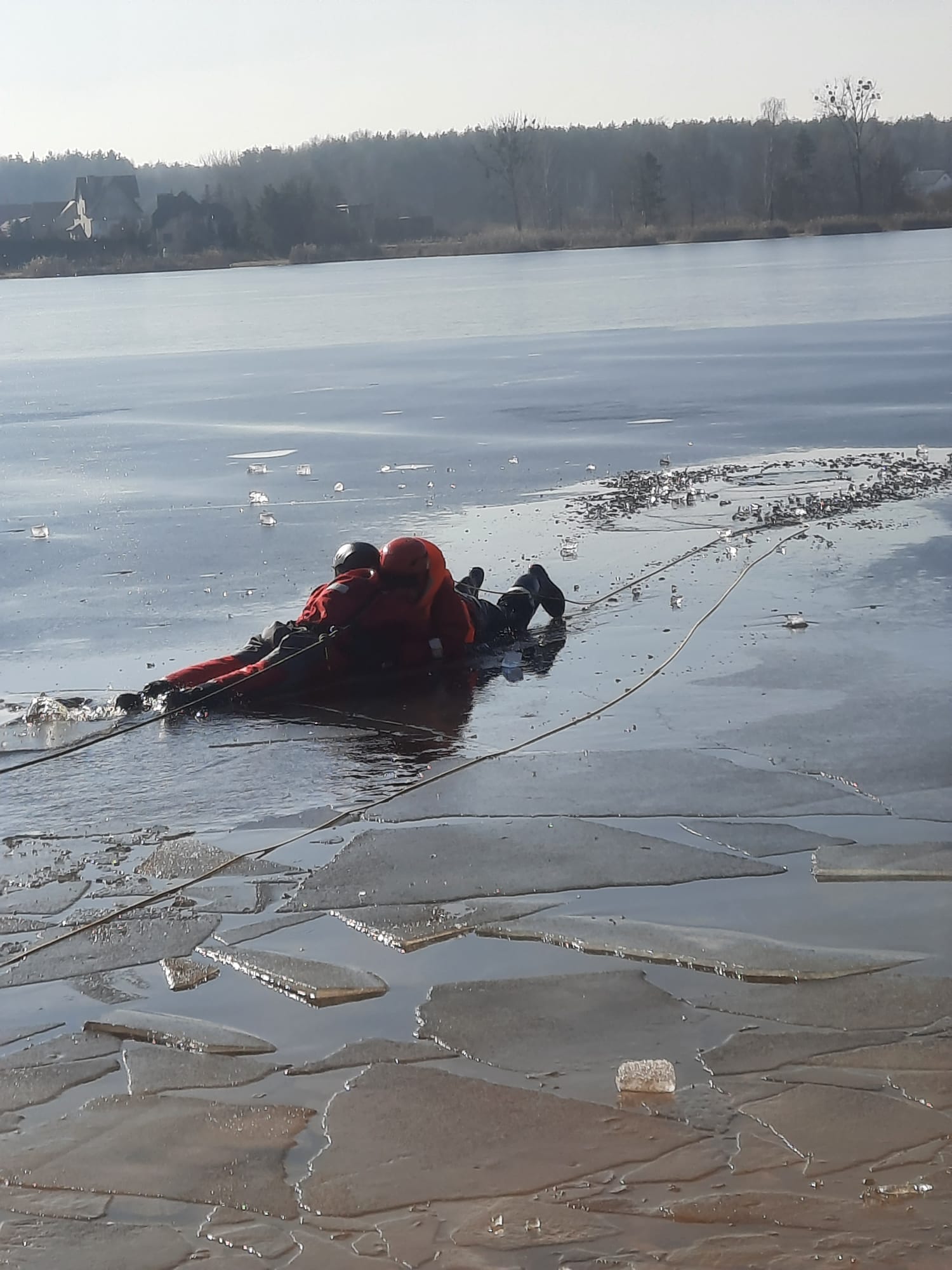 Druga część czyli zajęcia praktyczne zrealizowaliśmy na jeziorze Chechło w Trzebini. Przećwiczyliśmy techniki dotarcia do poszkodowanych przy zastosowaniu różnych metod ze szczególnym naciskiem na pracę zespołową oraz w sposób praktyczny sprawdziliśmy możliwości posiadanego przez nas sprzętu. Porównaliśmy jak w działaniach ratowniczych zachowują się: sanie lodowe, drabiny pożarnicze, koło ratunkowe czy deska ortopedyczna.