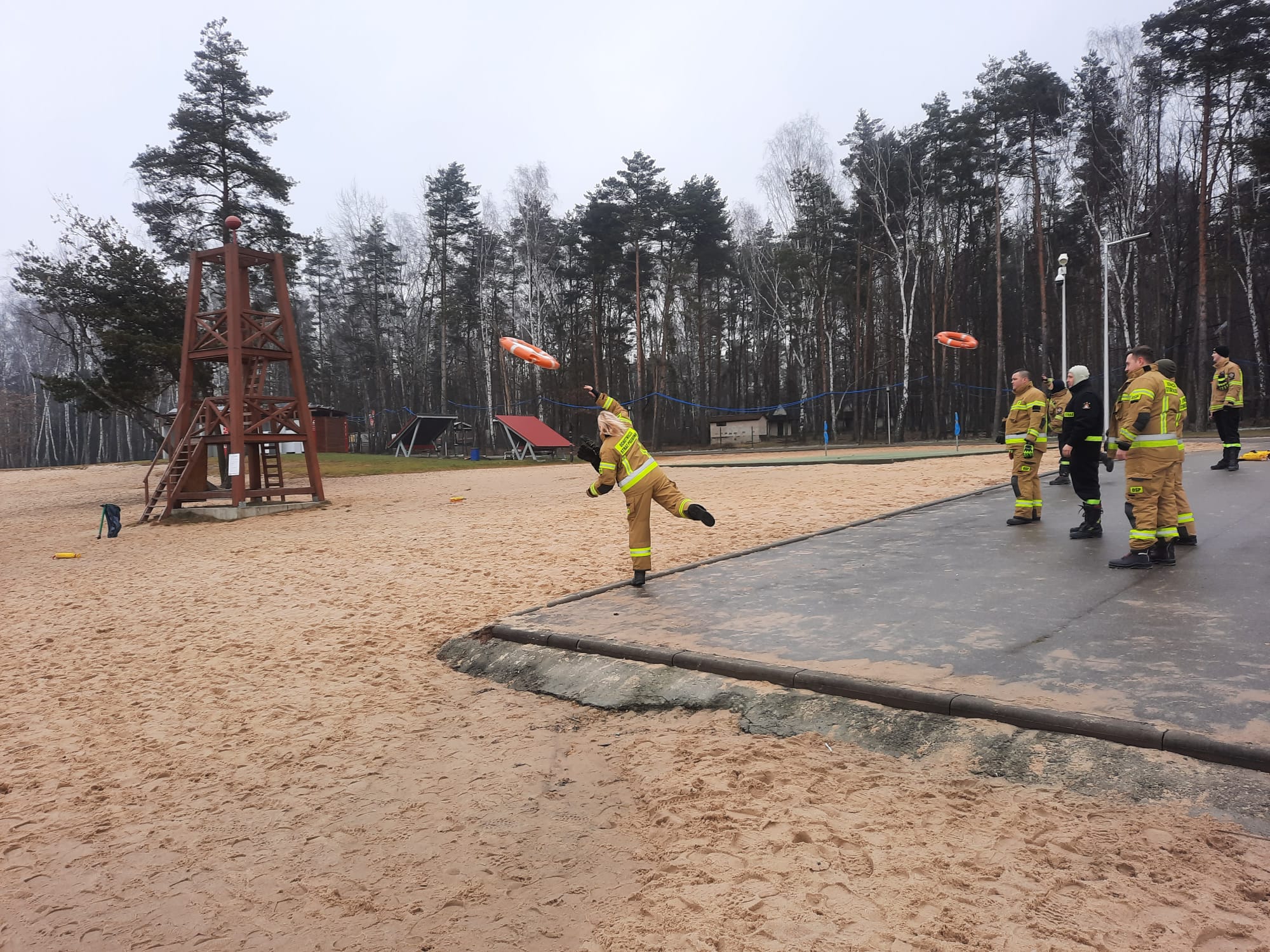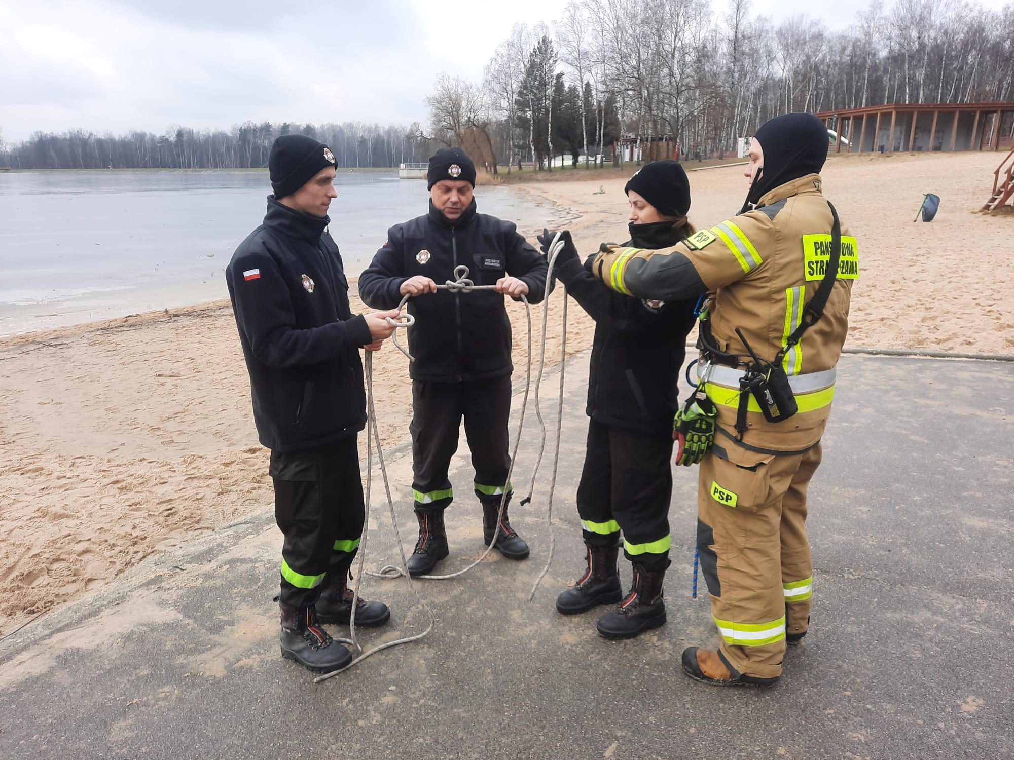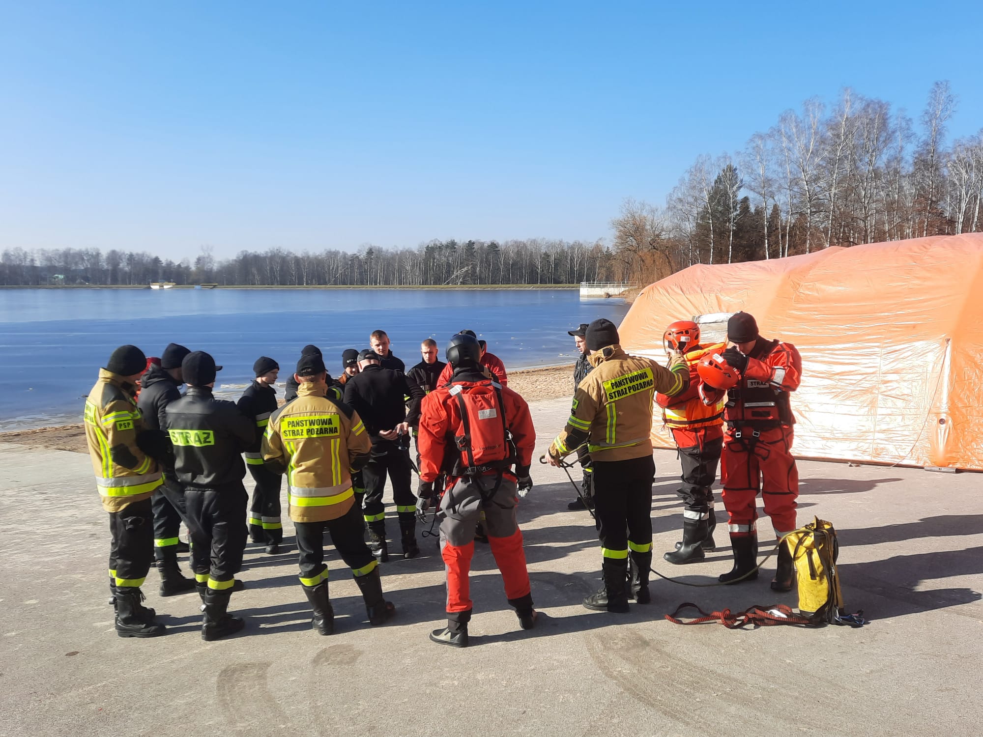 Pierwsza część zrealizowana były w tutejszej komendzie i polegała na omówieniu technik ratowniczych, sprzętu osobistego i ratowniczego wykorzystywanego do tego typu działań, jego konfigurację oraz najczęściej popełniane błędy podczas używania. Przypomnieliśmy sobie procedury postępowania kpp u osób w hipotermii oraz w przypadku tonięcia a także alternatywne sposoby zabezpieczenia poszkodowanego po wyciągnięciu