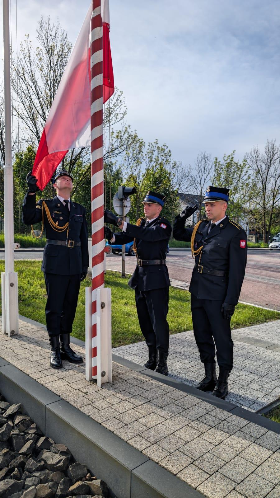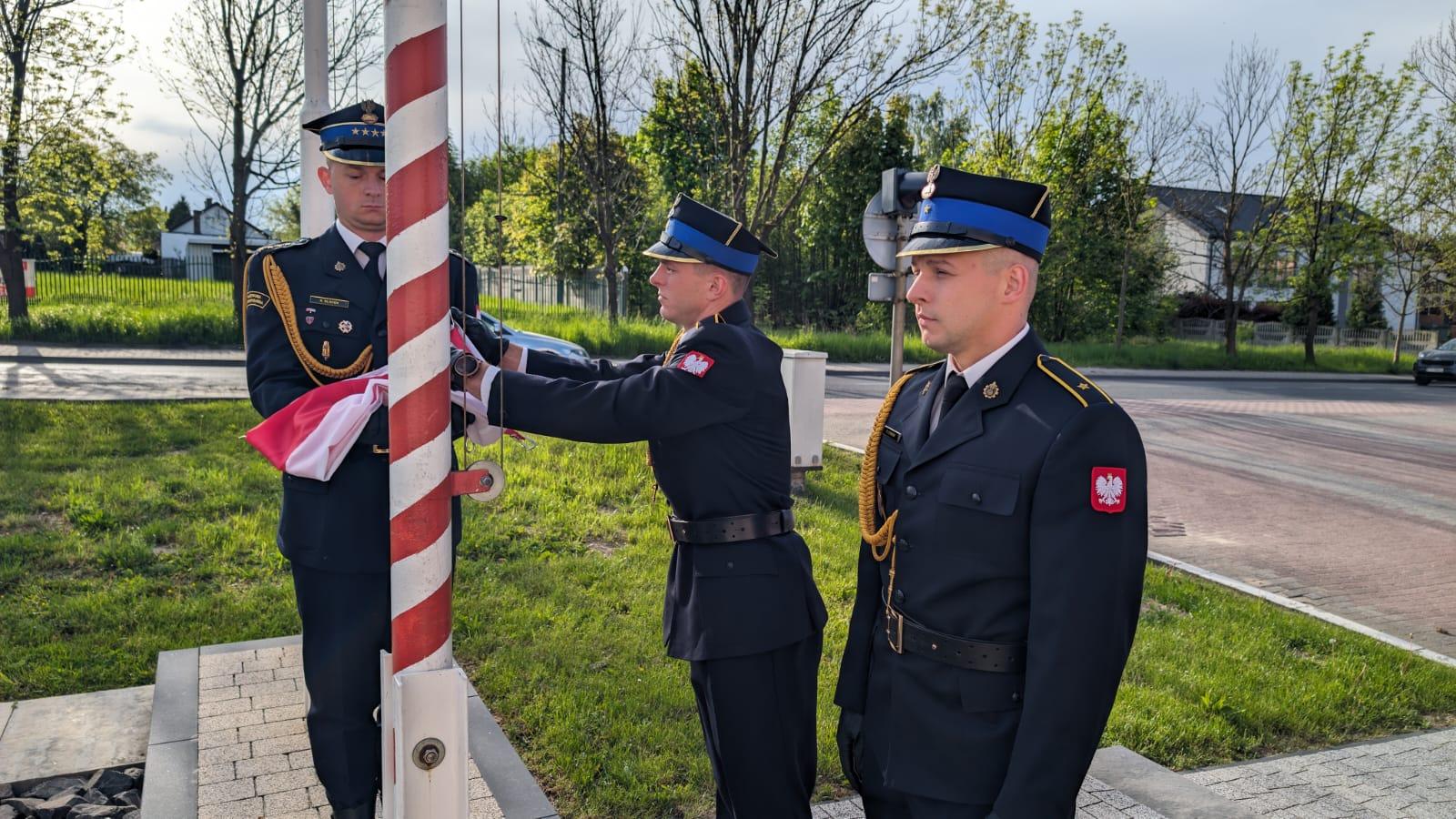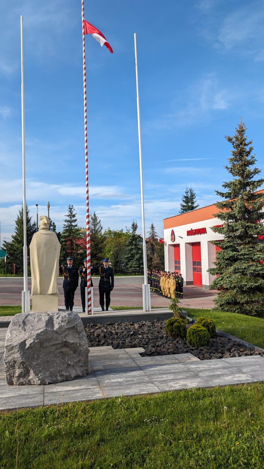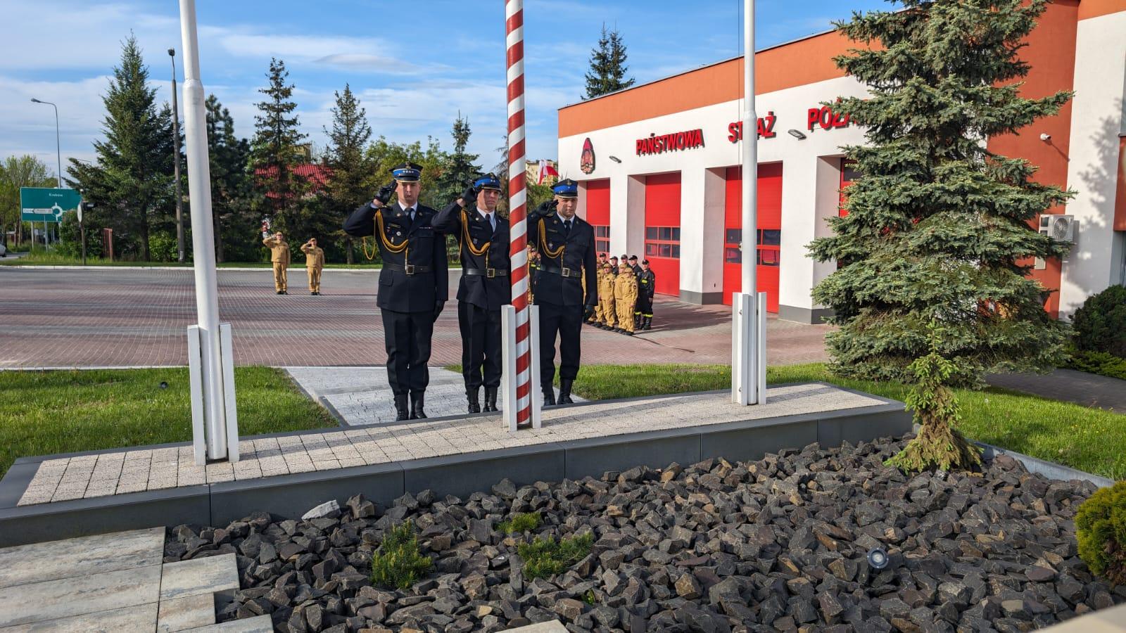 O godz. 8 w Komendzie Powiatowej PSP w Chrzanowie strażacy pełniący służbę w tym dniu podczas uroczystej zbiórki wciągnęli flagę na maszt.