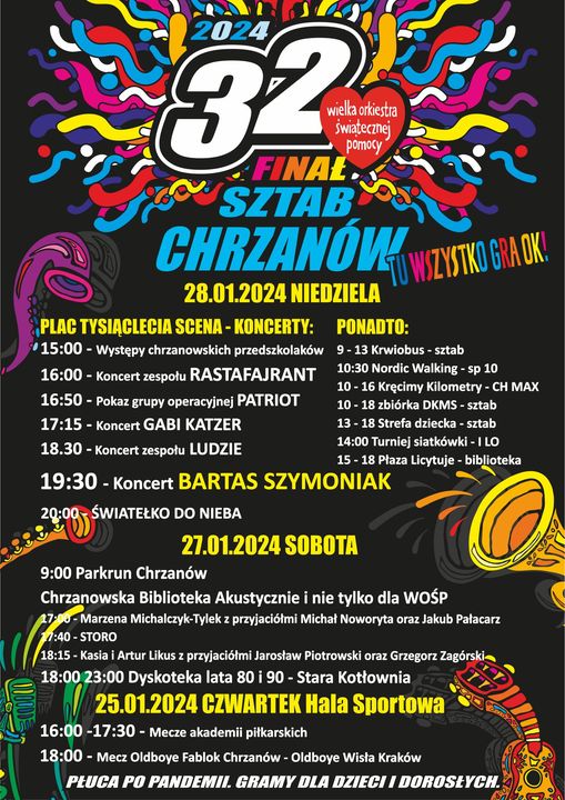 Serdecznie zapraszamy do udziału w Chrzanowskim Finale Wielkiej Orkiestry Świątecznej Pomocy, który odbędzie się w dniu 28 stycznia 2024 r. na chrzanowskim Placu Tysiąclecia.