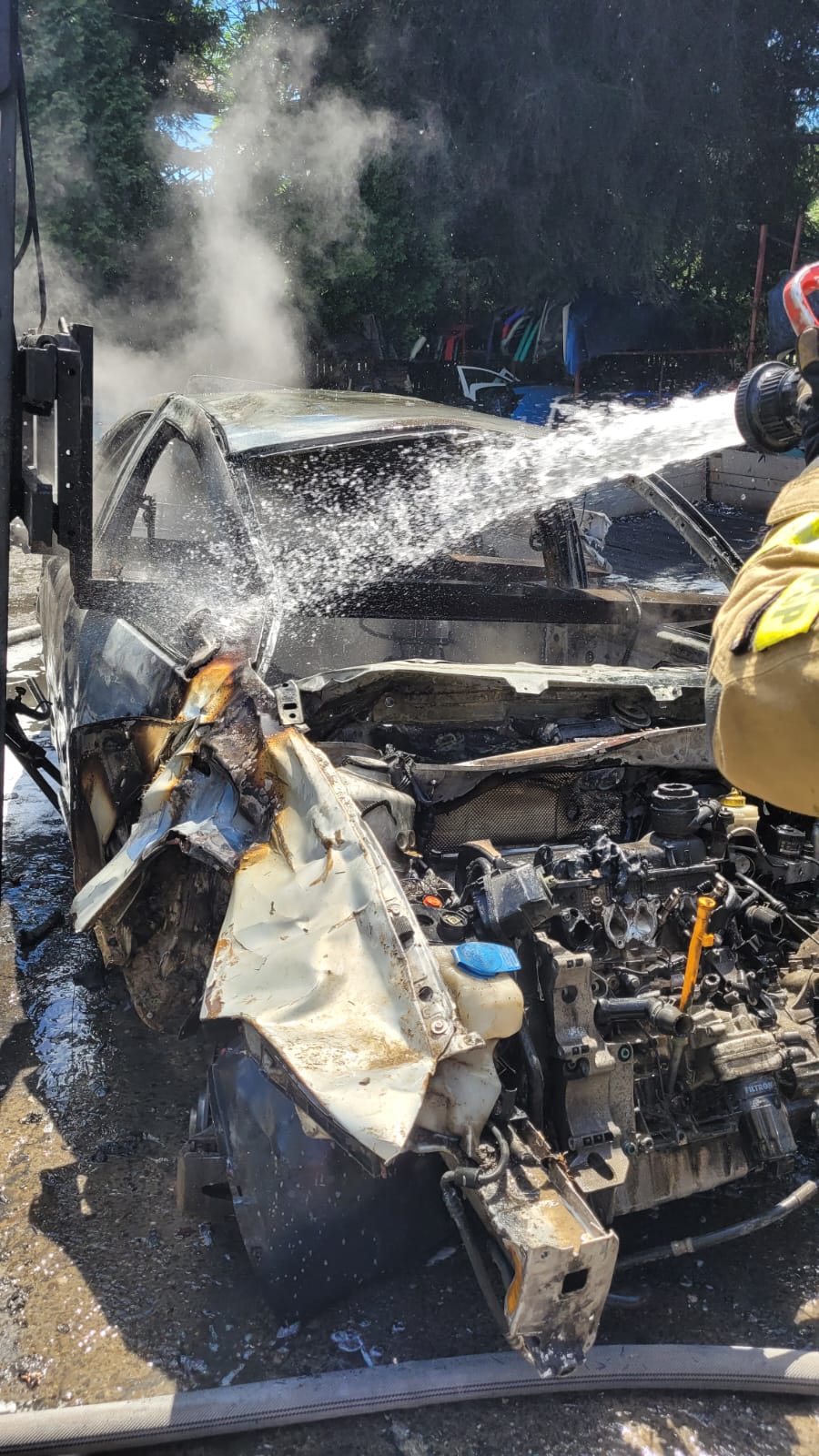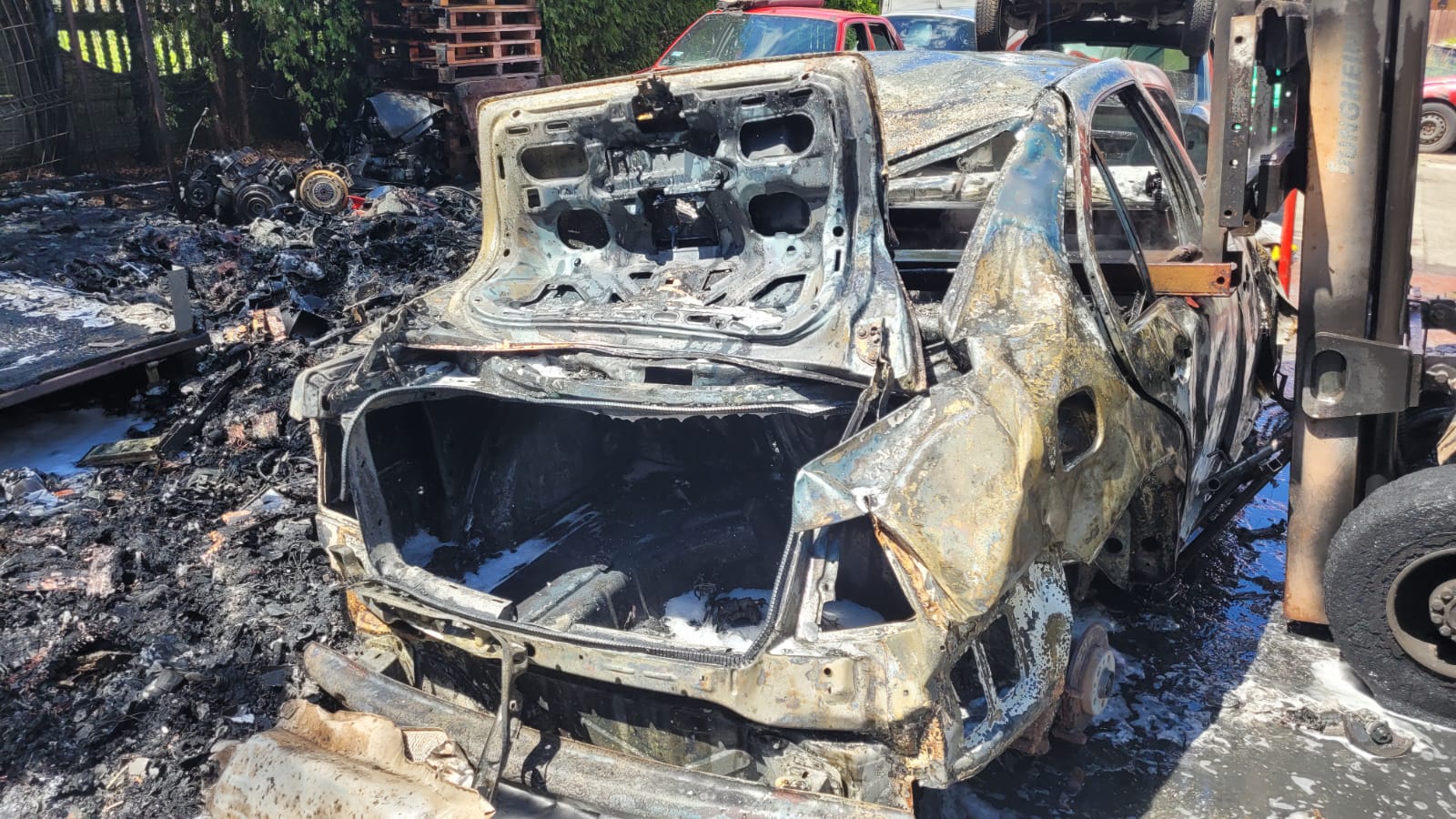 Po przybyciu na miejsce zdarzenia i przeprowadzeniu rozpoznania stwierdzono pożar wózka widłowego oraz demontowanego pojazdu będącego na widłach wózka widłowego, rozebranych części samochodowych oraz drzew przy ogrodzeniu. Ratownicy zabezpieczyli miejsce zdarzenia i w sprzęcie ochrony dróg oddechowych podali 2 prądy (jeden prąd wody i jeden prąd piany) na palący się wózek widłowy z pojazdem oraz pobliskie drzewa. Wózek widłowy był napędzany butlą z gazem LPG - butla została zdemontowana i oddalona z miejsca zdarzenia przez pracowników zakładu przed przybyciem jednostek ochrony przeciwpożarowej. Teren pogorzeliska sprawdzono kamerą termowizyjną. W działaniach brały udział 3 zastępy Państwowej Straży Pożarnej i 3 zastępy Ochotniczej Straży Pożarnej.