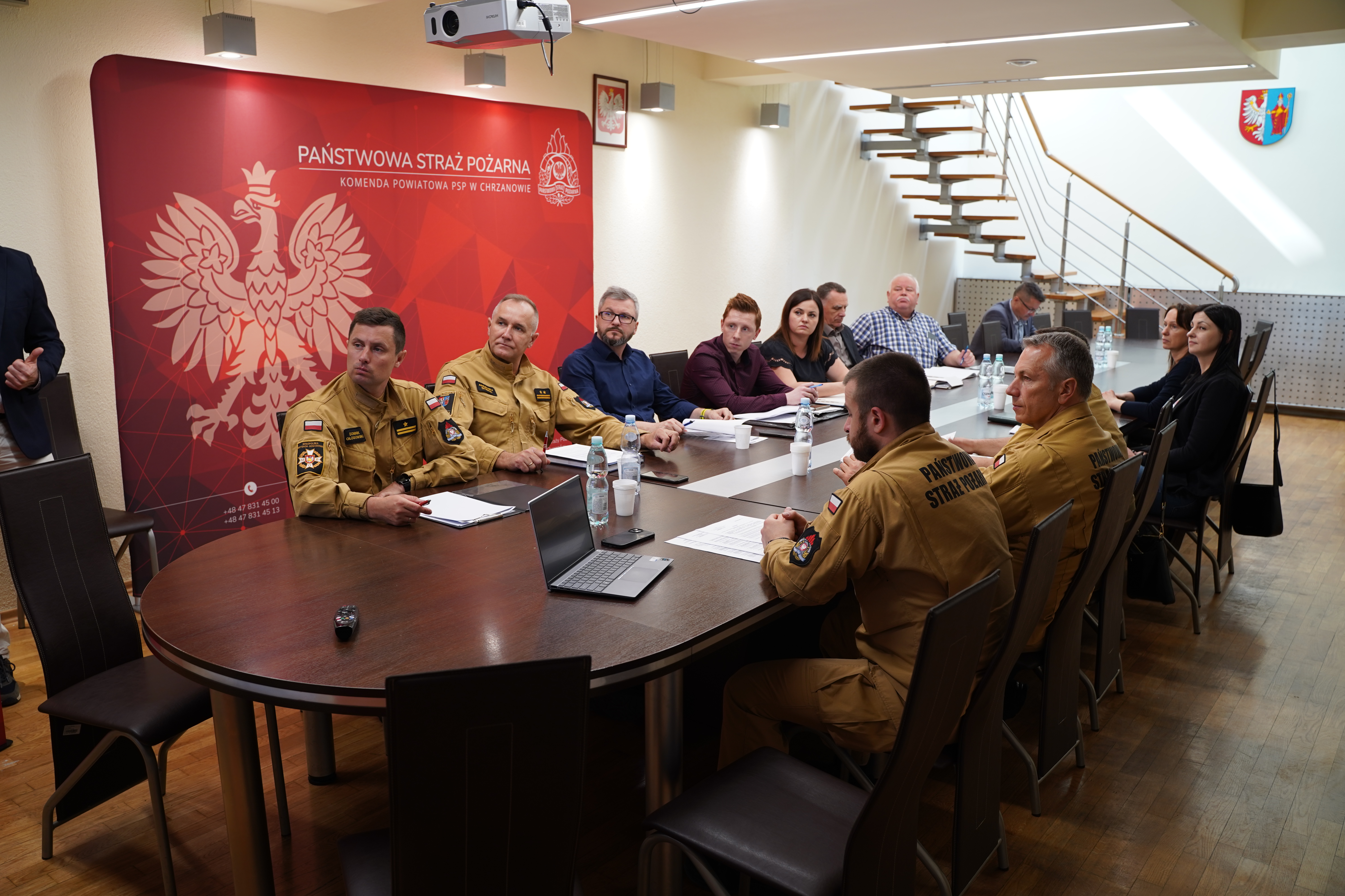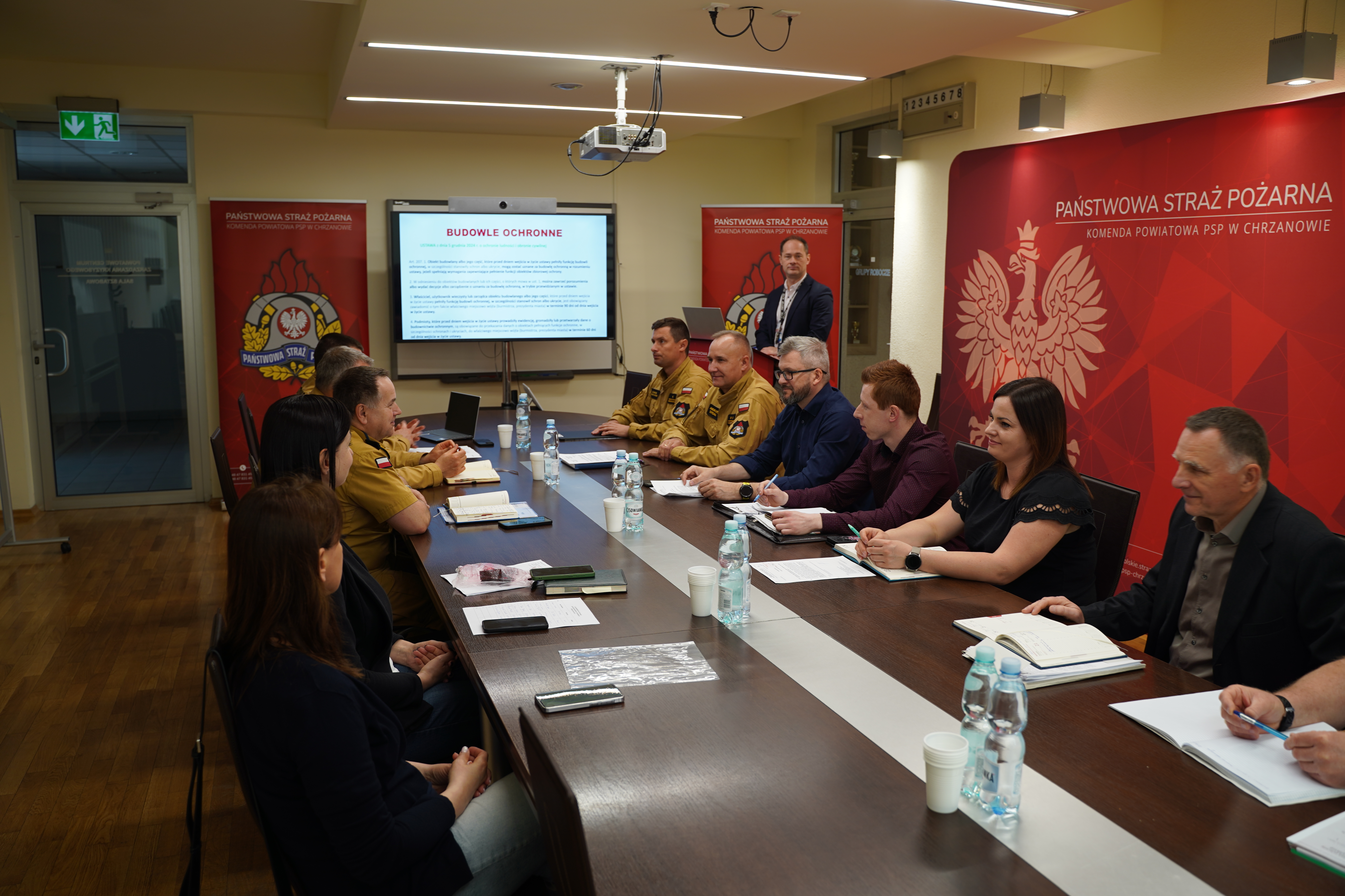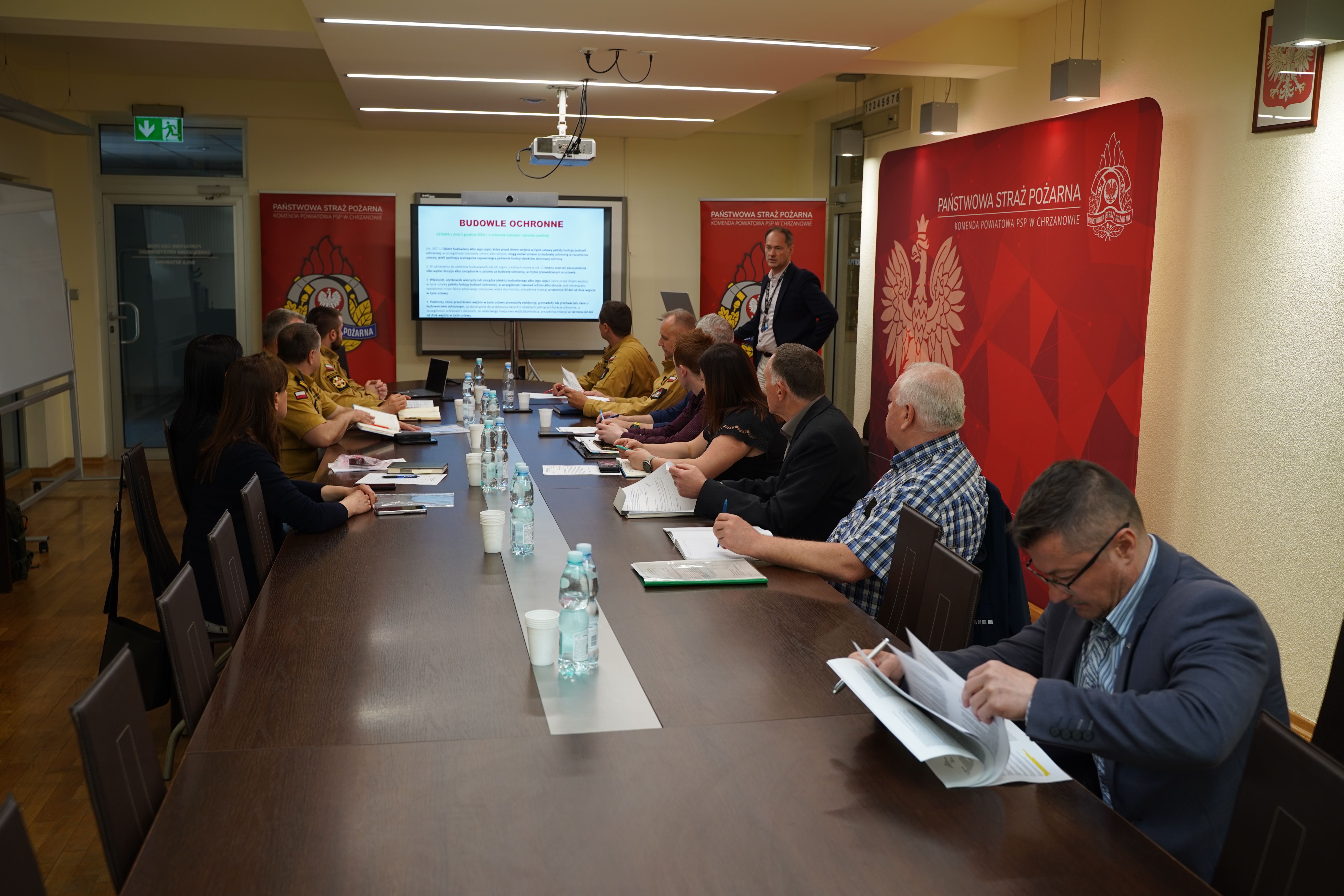 W dniu 23.04.2025 r. w siedzibie Komendy Powiatowej Państwowej Straży Pożarnej w Chrzanowie odbyło się spotkanie robocze dotyczące ustalenia zasad sprawdzania budowli ochronnych, pod względem spełniania warunków dla obiektów zbiorowej ochrony. W spotkaniu udział wzięli funkcjonariusze Komendy Powiatowej Państwowej Straży Pożarnej w Chrzanowie, Pracownicy Wydziału Zarządzania Kryzysowego i Spraw Obronnych Starostwa Powiatowego w Chrzanowie, Powiatowy Inspektor Nadzoru Budowlanego w Chrzanowie, przedstawiciele samorządów pracujący w wydziałach Zarządzania Kryzysowego w poszczególnych gminach.