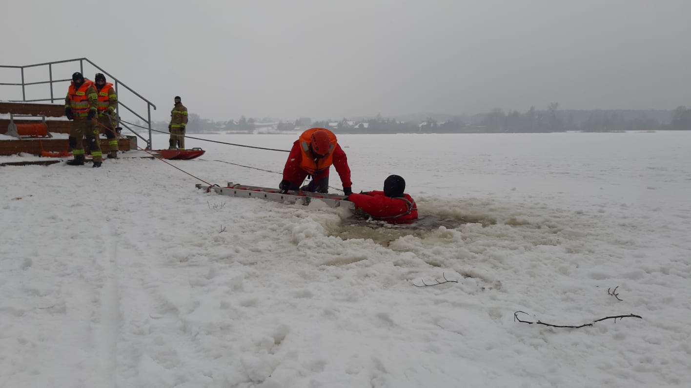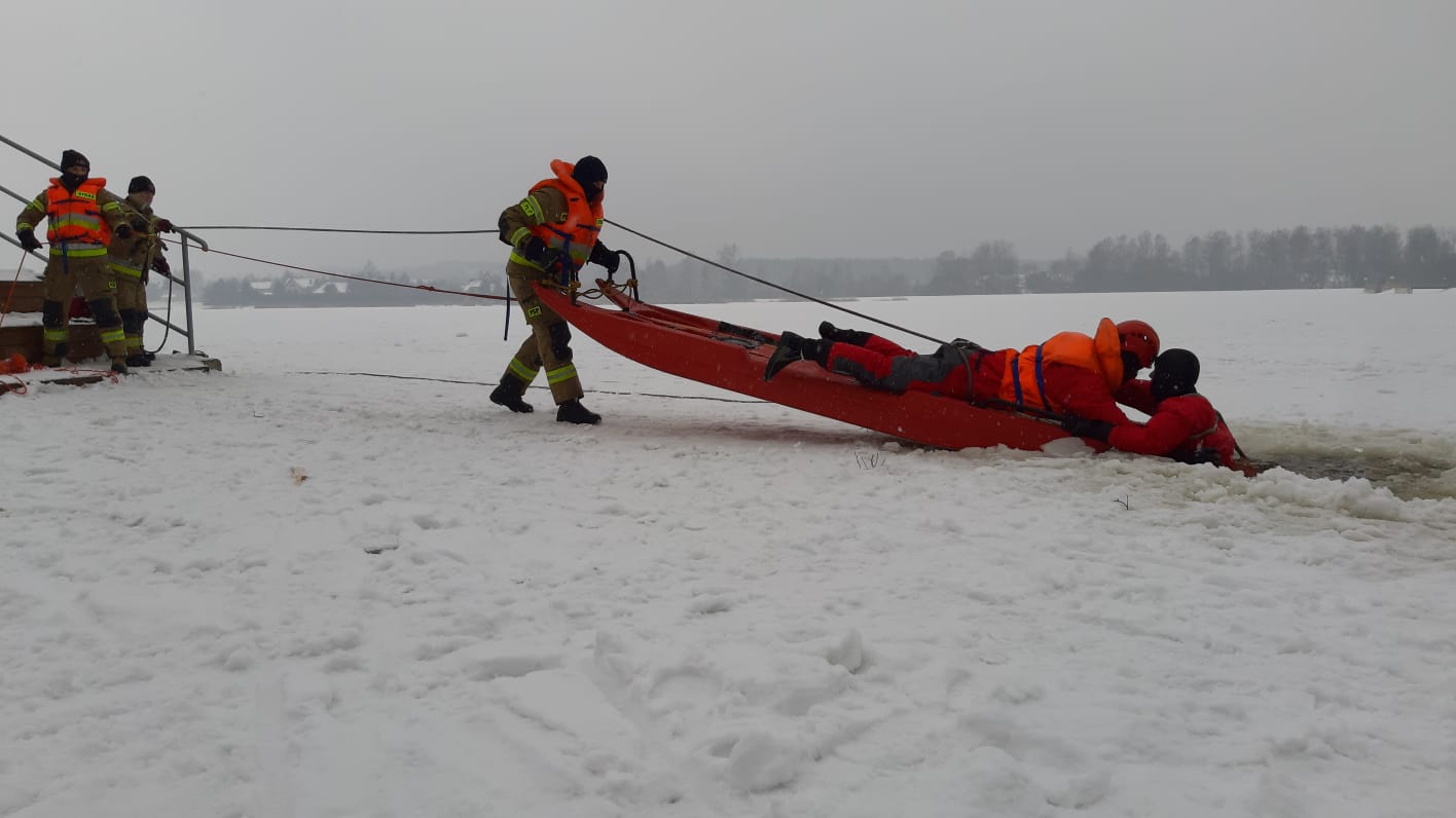W związku ze wzrostem temperatur warstwa lodu na akwenach wodnych będzie się sukcesywnie zmniejszać. Przestrzegamy przed wchodzeniem na lód, ponieważ może skończyć się to tragicznie. Szczególnie niebezpieczne są zbiorniki przepływowe, tj. takie przez które przepływa jakiś ciek wodny. W miejscach pod lodem, gdzie są intensywniejsze prądy wody, lód może zmniejszać swoją grubość znacznie szybciej niż przy brzegu. Co zrobić, gdy załamie się pod nami lód? Przede wszystkim trzeba zachować spokój! Gwałtowne ruchy w zimnej wodzie powodują szybsze wychładzanie się organizmu i wzrost zagrożenia hipotermią. Jeżeli nie wpadliśmy całkowicie do wody, jak najszybciej spokojnie należy połóżyć się na lodzie rozkładając nacisk ciała na większą powierzchnię i turlać się w kierunku brzegu. Kiedy wpadniemy do wody, przydatny może być każdy element, który pozwoli utrzymać się nam na wodzie lub wezwać pomoc. Jeżeli jesteśmy świadkami takiego zdarzenia, jak najszybciej wezwijmy służby ratownicze. Czas dojazdu w warunkach zimowy się wydłuża, a szybkość podjęcia poszkodowanego z wody ma kluczowy wpływ na mozliwość jego uratowania. Aby zmniejszyć czas podjęcia skutecznych działań ratowniczych, strażacy JRG Chrzanów ćwiczyli w środę 17.02.2021 r. podejmowanie tonącego w przeręblu pozoranta w różnych wariantach z wykorzystaniem: drabiny, gałęzi, rzutki ratowniczej oraz tak zwanych sań lodowych. Mimo niesprzyjających warunków atmosferycznych strażacy realizowali ćwiczenia przez kilka godzin mając świadomość, że w realnym zagrożeniu każda sekunda ich działania ma znaczenie, a wymagający trening poprawi skuteczność w prawdziwym zdarzeniu.