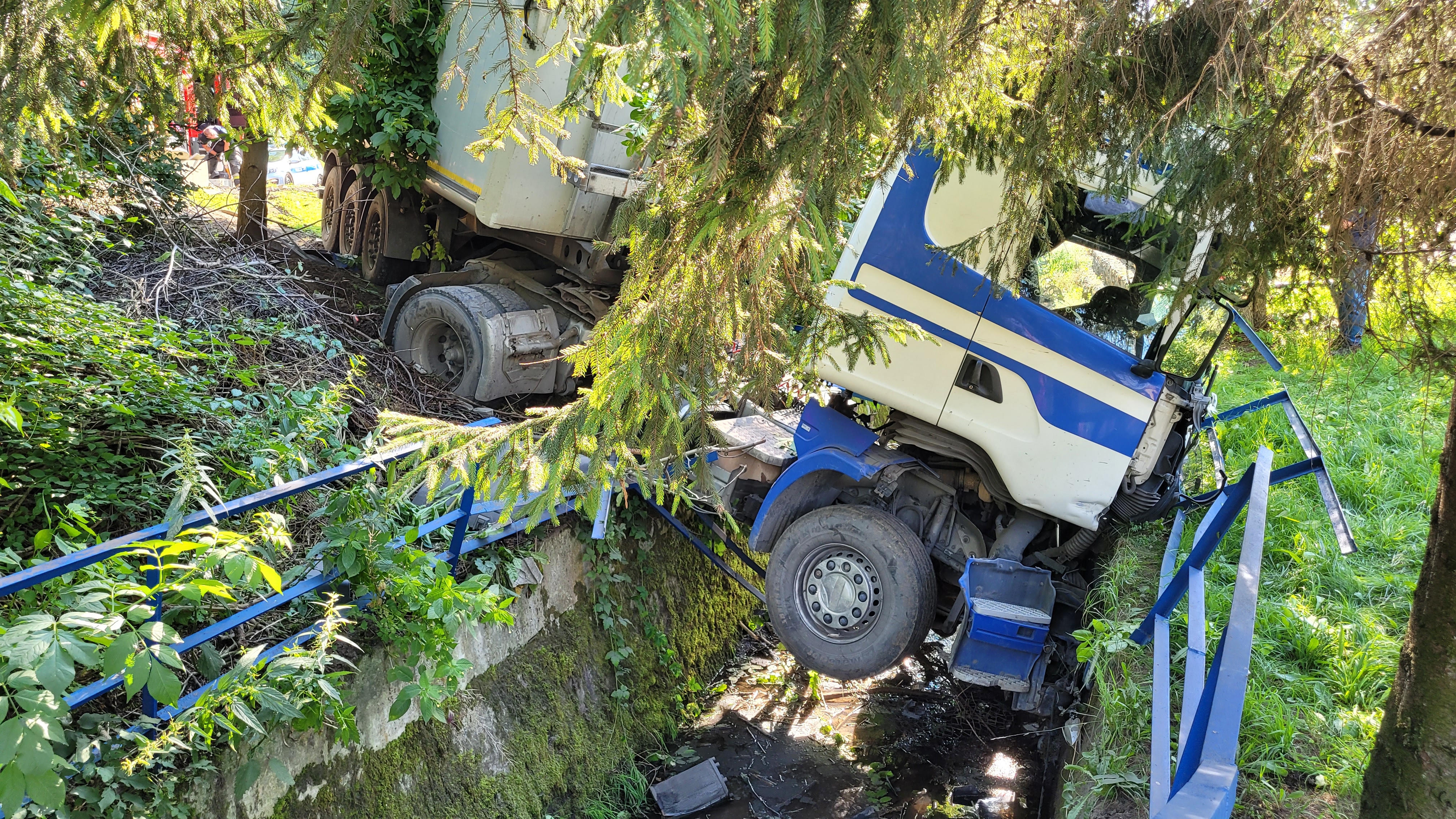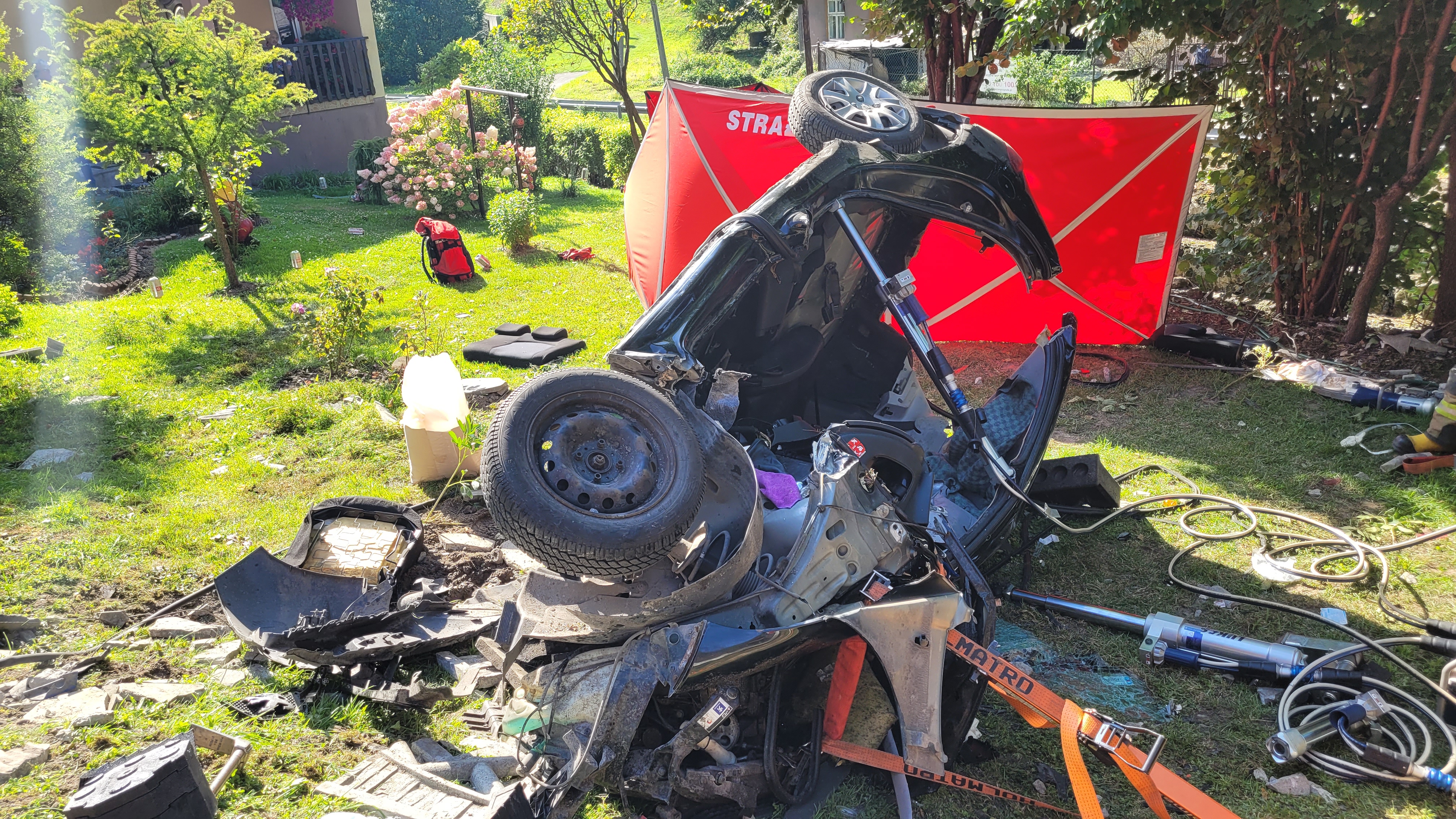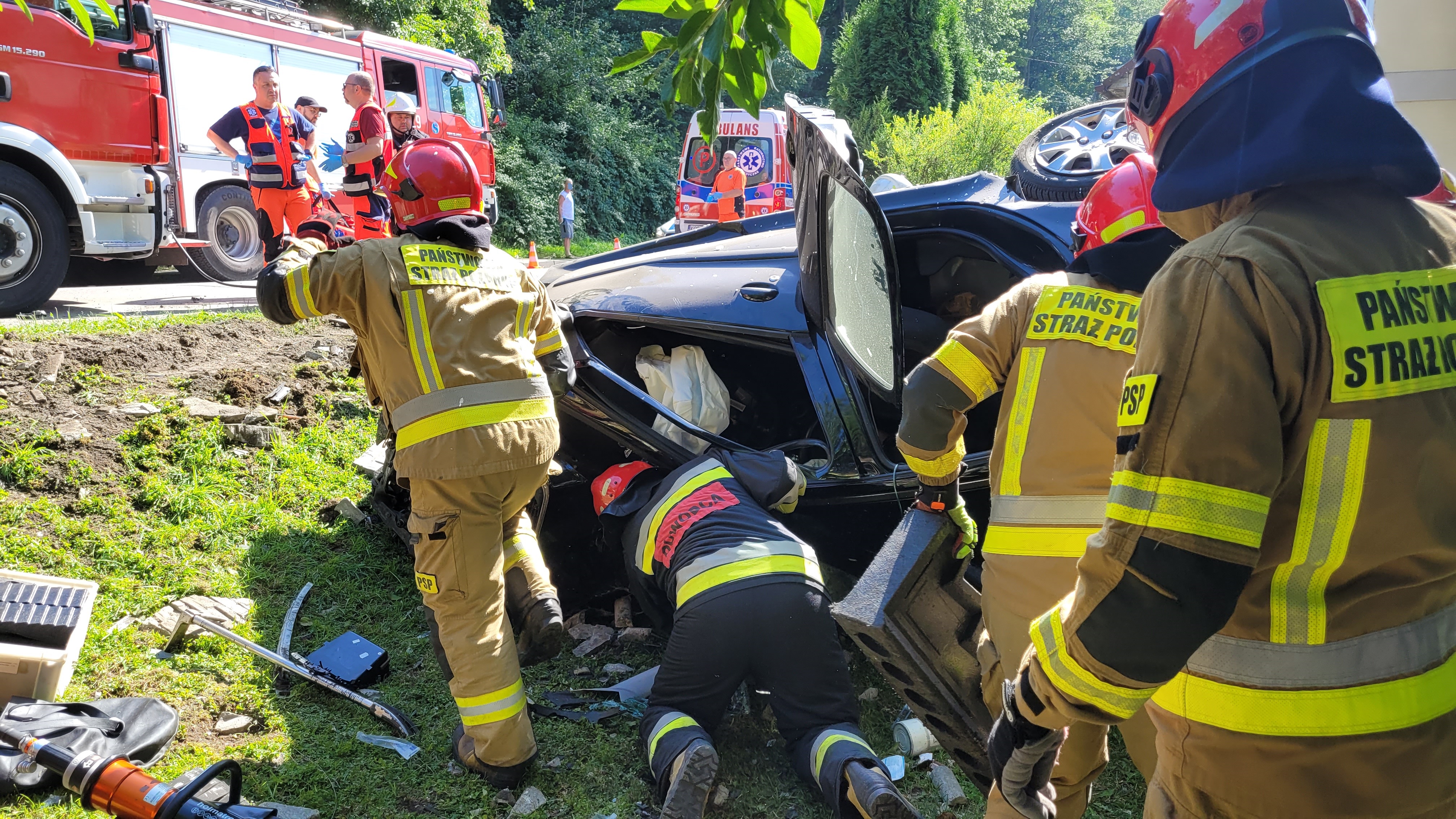 Po przybyciu na miejsce zdarzenia stwierdzono samochód osobowy i ciężarowy poza pasem jezdni. Samochód osobowy znajdował się częściowo na boku, częściowo na dachu, samochód ciężarowy zawisł nad potokiem Płazianka. Pojazdami podróżowali tylko kierowcy. Kierowca pojazdu ciężarowego nie odniósł obrażeń. Ratownicy zabezpieczyli miejsce zdarzenia i przystąpili za pomocą narzędzi hydraulicznych do uwalniania kierującej pojazdem osobowym. Po ewakuacji poszkodowanej z pojazdu przybyły na miejsce zespół Lotniczego Pogotowia Ratunkowego stwierdził zgon kobiety.