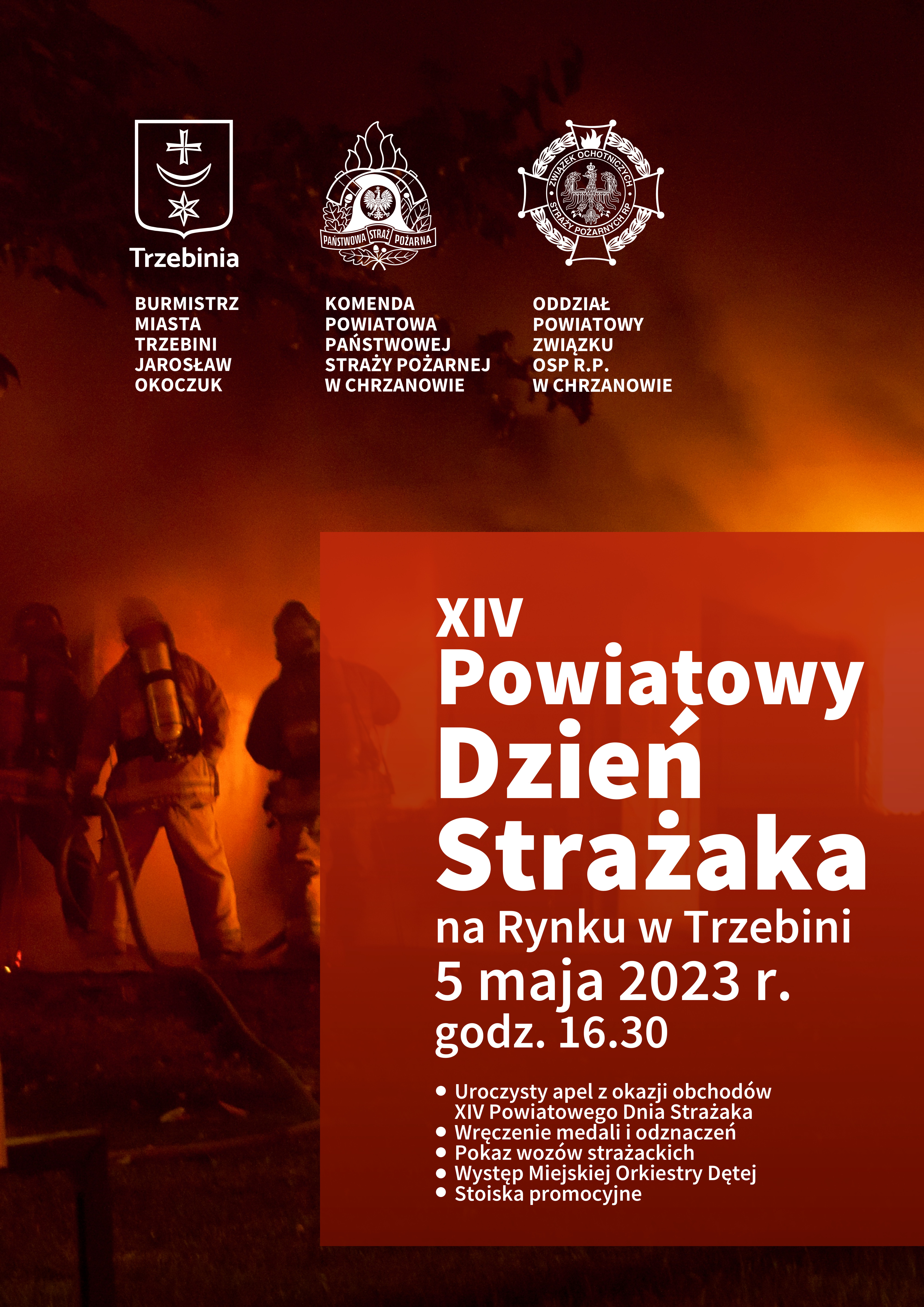 mają zaszczyt zaprosić na XIV Powiatowy Dzień Strażaka, który odbędzie się w dniu 5 maja 2023 r. o godzinie 16:30 na Rynku w Trzebini.