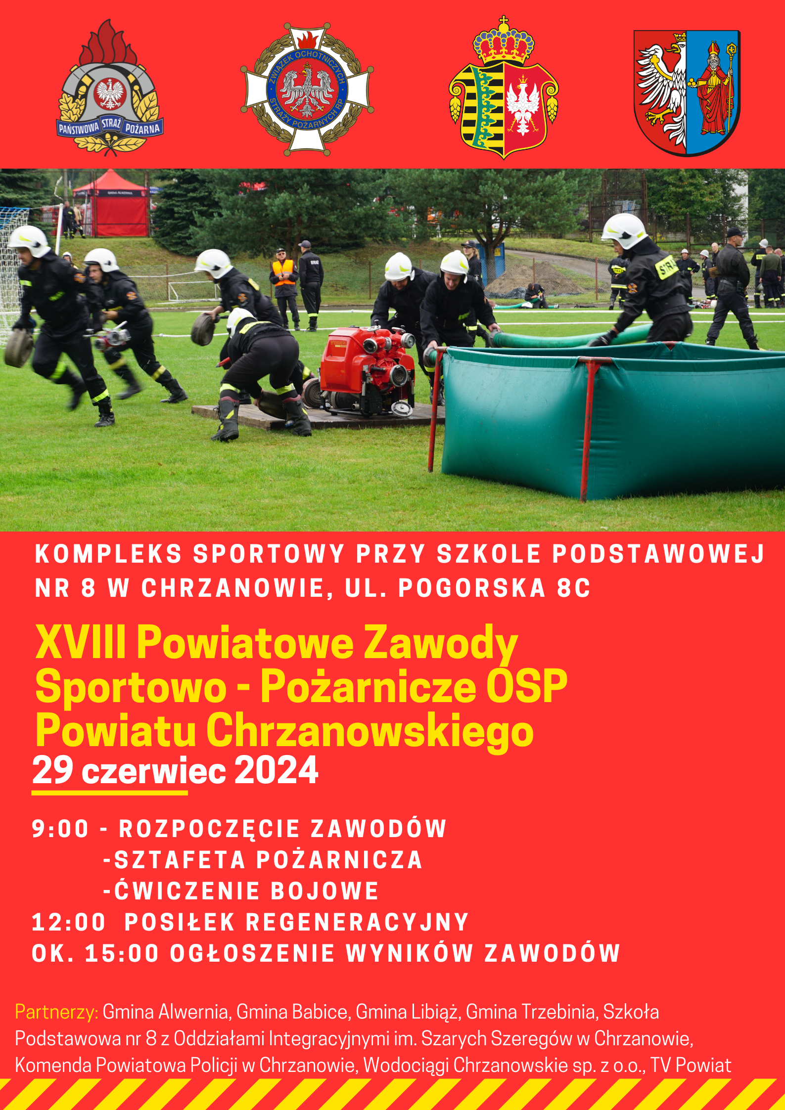W imieniu organizatorów serdecznie zapraszamy na XVIII Powiatowe Zawody Sportowo – Pożarnicze OSP powiatu chrzanowskiego. Zawody odbędą się 29 czerwca 2024 r. na terenie Kompleksu Sportowego przy Szkole Podstawowej nr 8 w Chrzanowie, ul. Pogorska 8 C.