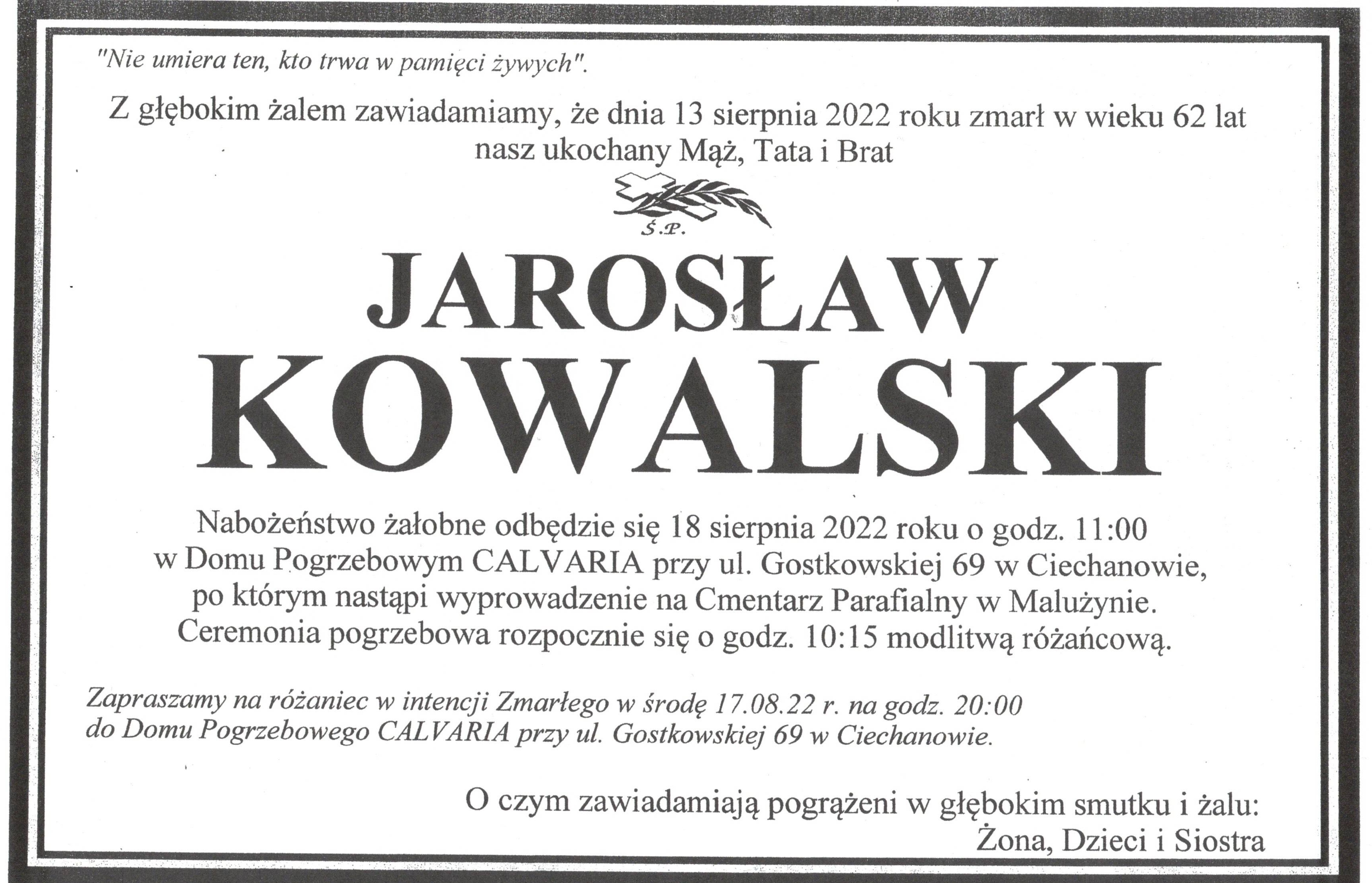 Nabożeństwo żałobne odbędzie się 18 sierpnia 2022 roku o godz. 11:00 w Domu Pogrzebowym CALVARIA przy ul. Gostkowskiej 69 w Ciechanowie, po którym nastąpi wyprowadzenie na Cmentarz Parafialny w Malużynie. Ceremonia pogrzebowa rozpocznie się o godz. 10:15 modlitwą różańcową.