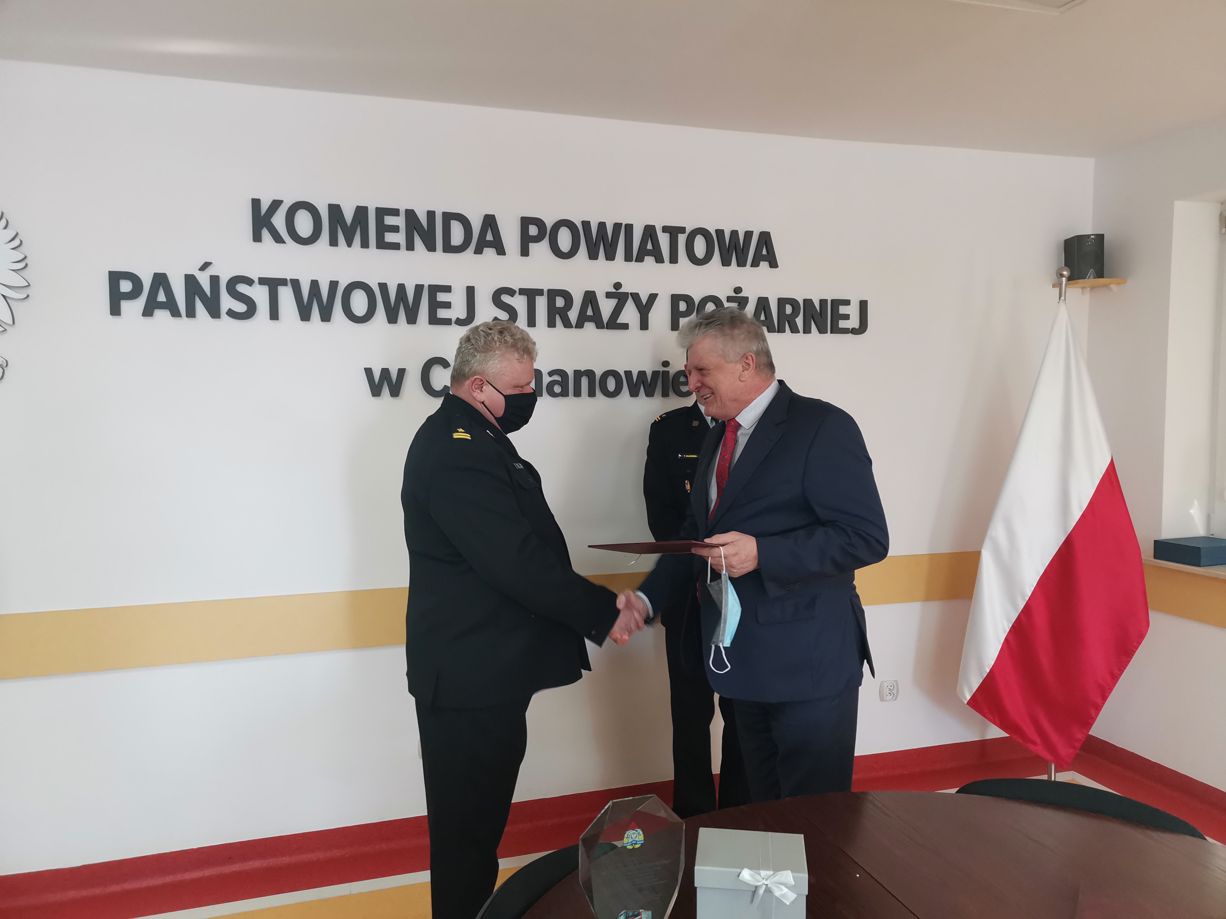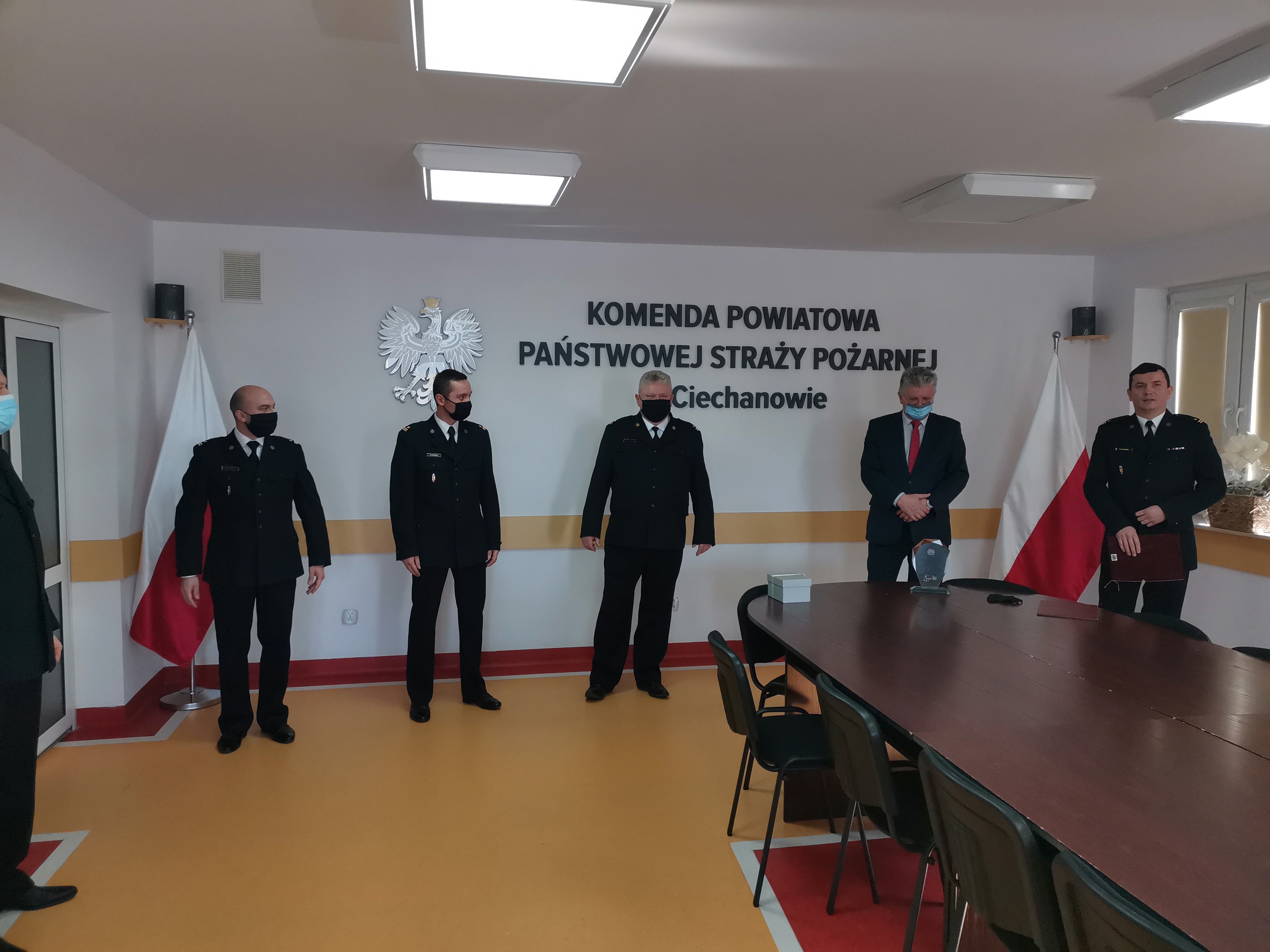22 lutego 2021 roku w Komendzie Powiatowej Państwowej Straży Pożarnej w Ciechanowie odbyła się uroczysta zbiórka z okazji przejścia na zaopatrzenie emerytalne wieloletniego funkcjonariusza tut. Komendy mł. bryg. Jarosława Głuszkowskiego. W trakcie uroczystości Komendant Powiatowy Państwowej Straży Pożarnej w Ciechanowie mł. bryg. Tomasz Gajewski podziękował za zaangażowanie oraz służbę i poświęcenie w codziennej realizacji obowiązków służbowych.