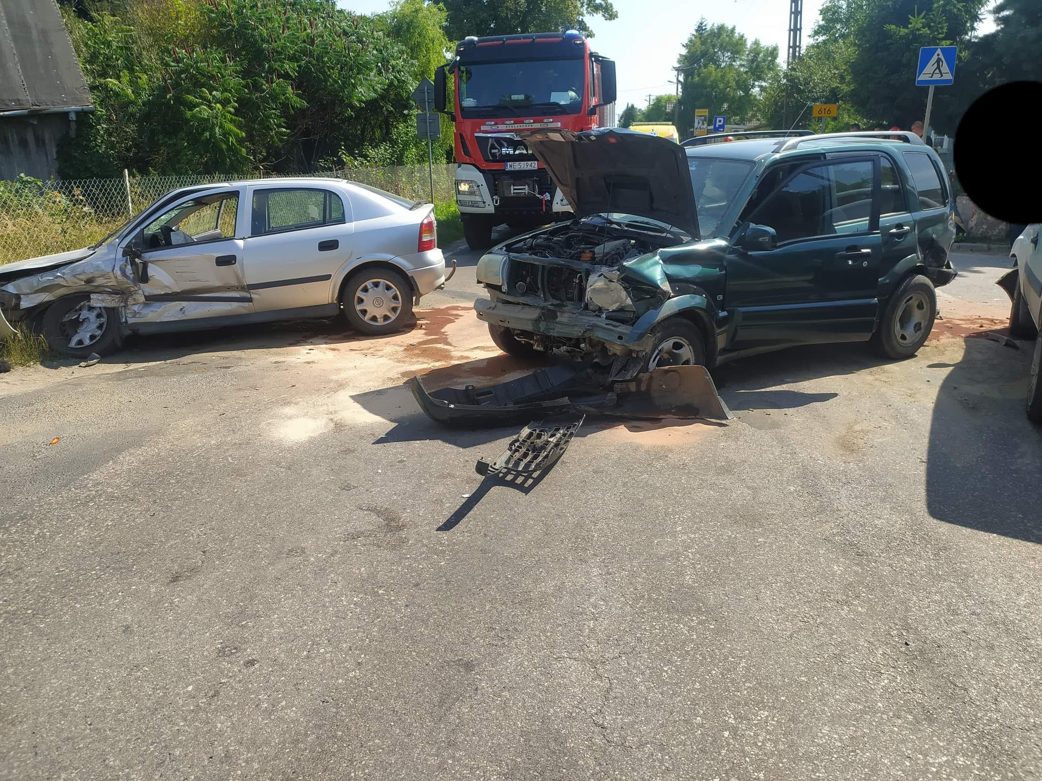 21 lipca o godz. 13:55 otrzymaliśmy informację o zdarzeniu drogowym na DW nr 616 w m. Szulmierz. Na miejscu zdarzenia strażacy zastali wypadek dwóch samochodów osobowym i samochodu dostawczego. Pojazdami podróżowały łącznie cztery osoby. Wszyscy podróżujący pojazdami opuścili je o własnych siłach przed przybyciem straży pożarnej. Droga była całkowicie zablokowana. Razem z zastępami straży pożarnej przybyła na miejsce karetka pogotowia ratunkowego, której załoga zajęła się osobami poszkodowanymi. Działania straży pożarnej polegały na zabezpieczeniu miejsca zdarzenia. W uszkodzonych pojazdach odłączono akumulatory. Powstały wyciek płynów eksploatacyjnych zasypano sorbentem. W trakcie działań ruch na drodze był całkowicie wstrzymany. Ze względu na brak innych zagrożeń na tym działania zakończono. Na miejscu pozostał patrol Policji. W działaniach trwających 1h28min udział brały trzy zastępy straży pożarnej.