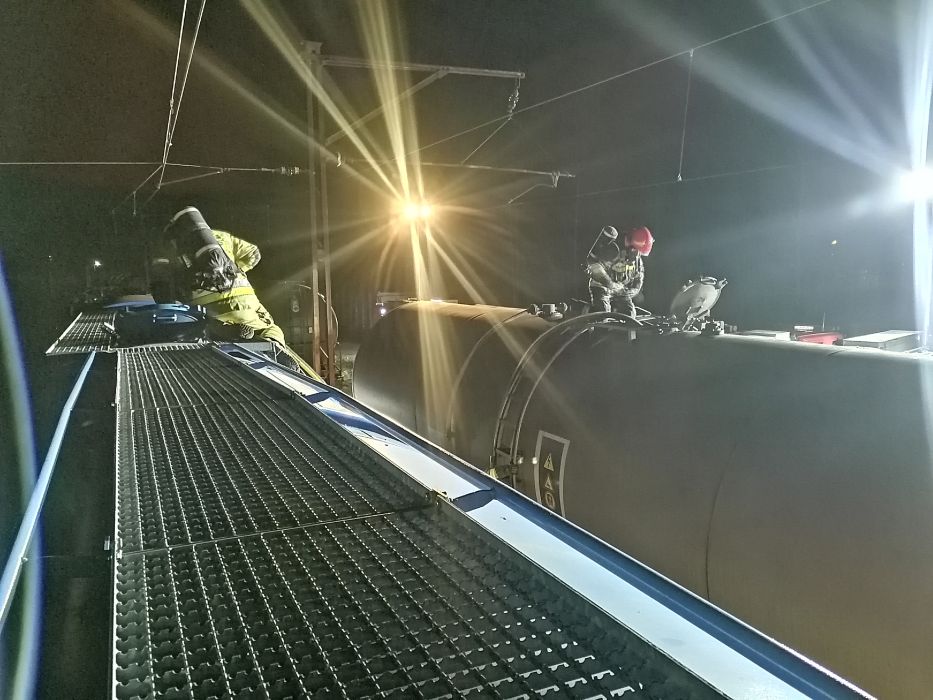 Dokonano pomiarów atmosfery wybuchowej za pomocą mierników, a następnie podłożono pojemnik w celu wychwytywania wyciekłej substancji . Podjęto próbę doraźnego uszczelnienia zaworu za pomocą foli typu stercz. Niestety działania te nie przyniosły pożądanego efektu. Podjęto decyzję o zadysponowaniu pustej cysterny na miejsce działań celem przepompowania medium. Zorganizowano oświetlenie terenu działań oraz przygotowano miejsce do działań dla specjalistycznej grupy ratownictwa chemicznego, zadysponowanej na miejsce. Po dojeździe pustej cysterny kolejowej i przybyciu na miejsce grupy ratownictwa chemicznego z Bielska-Białej przystąpiono do przepompowania substancji.
