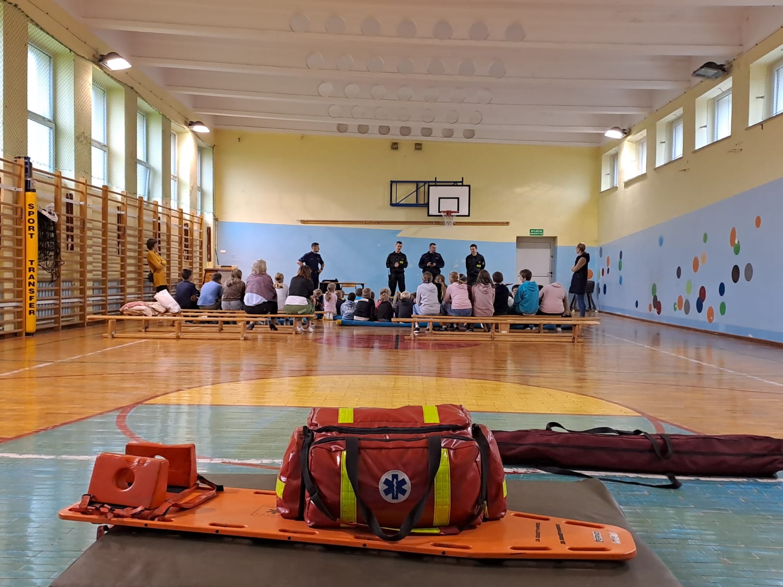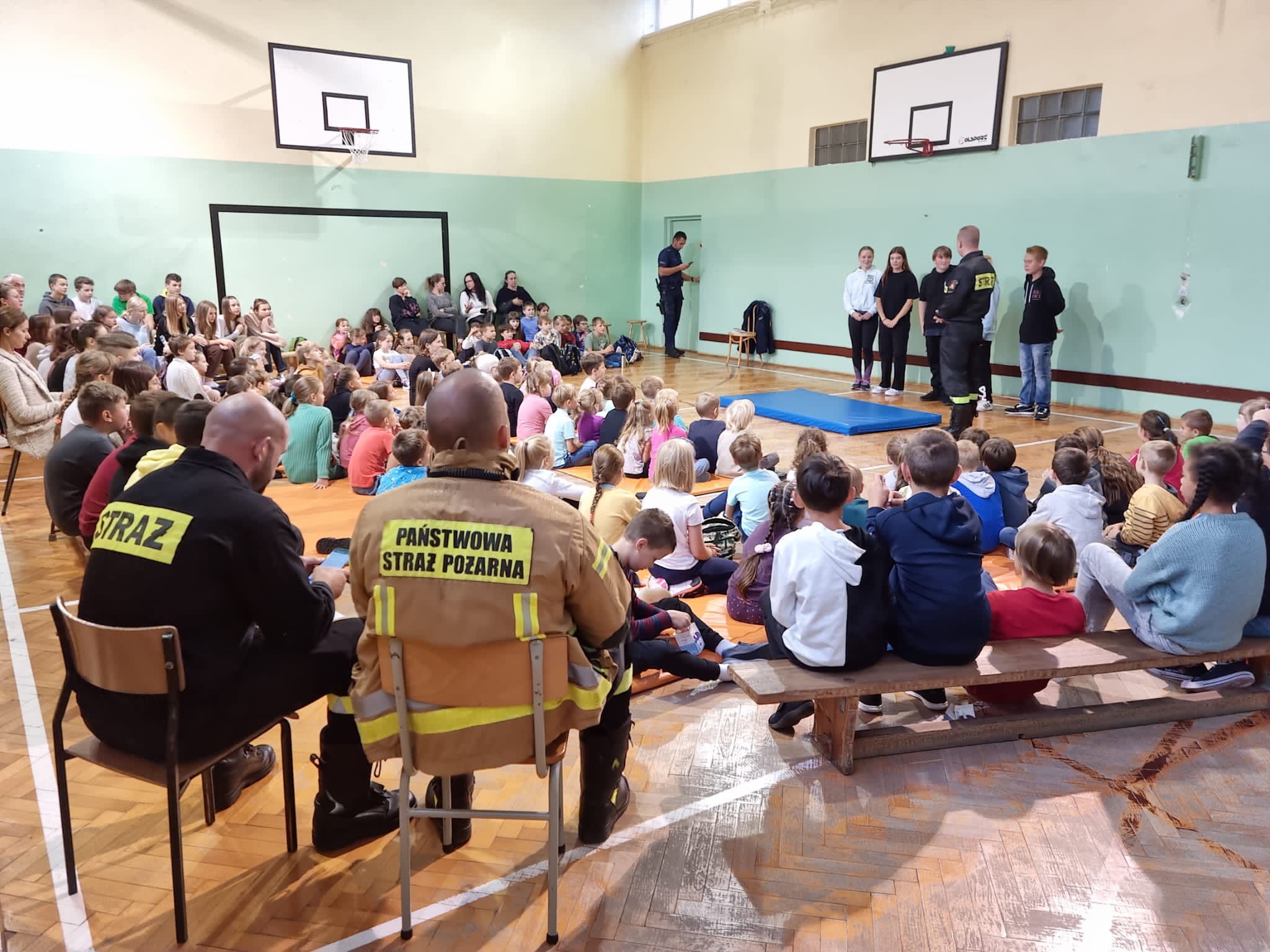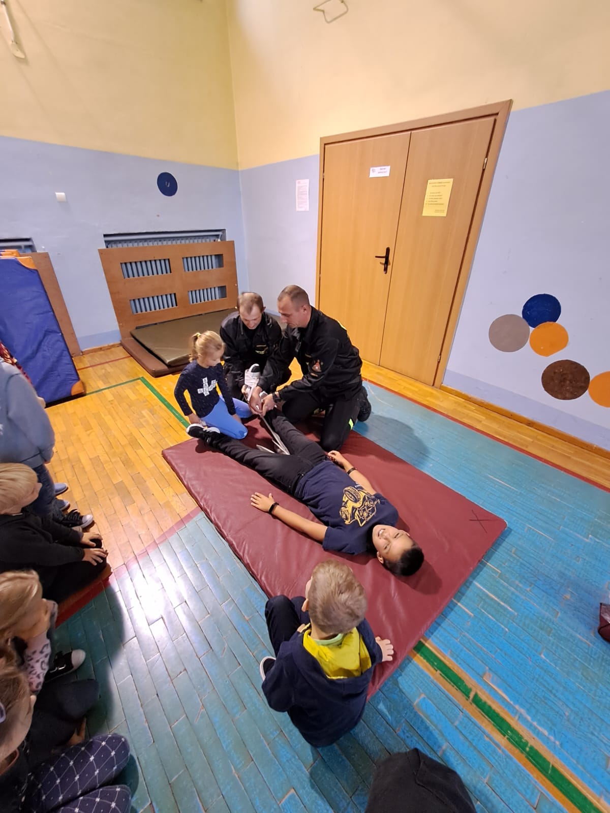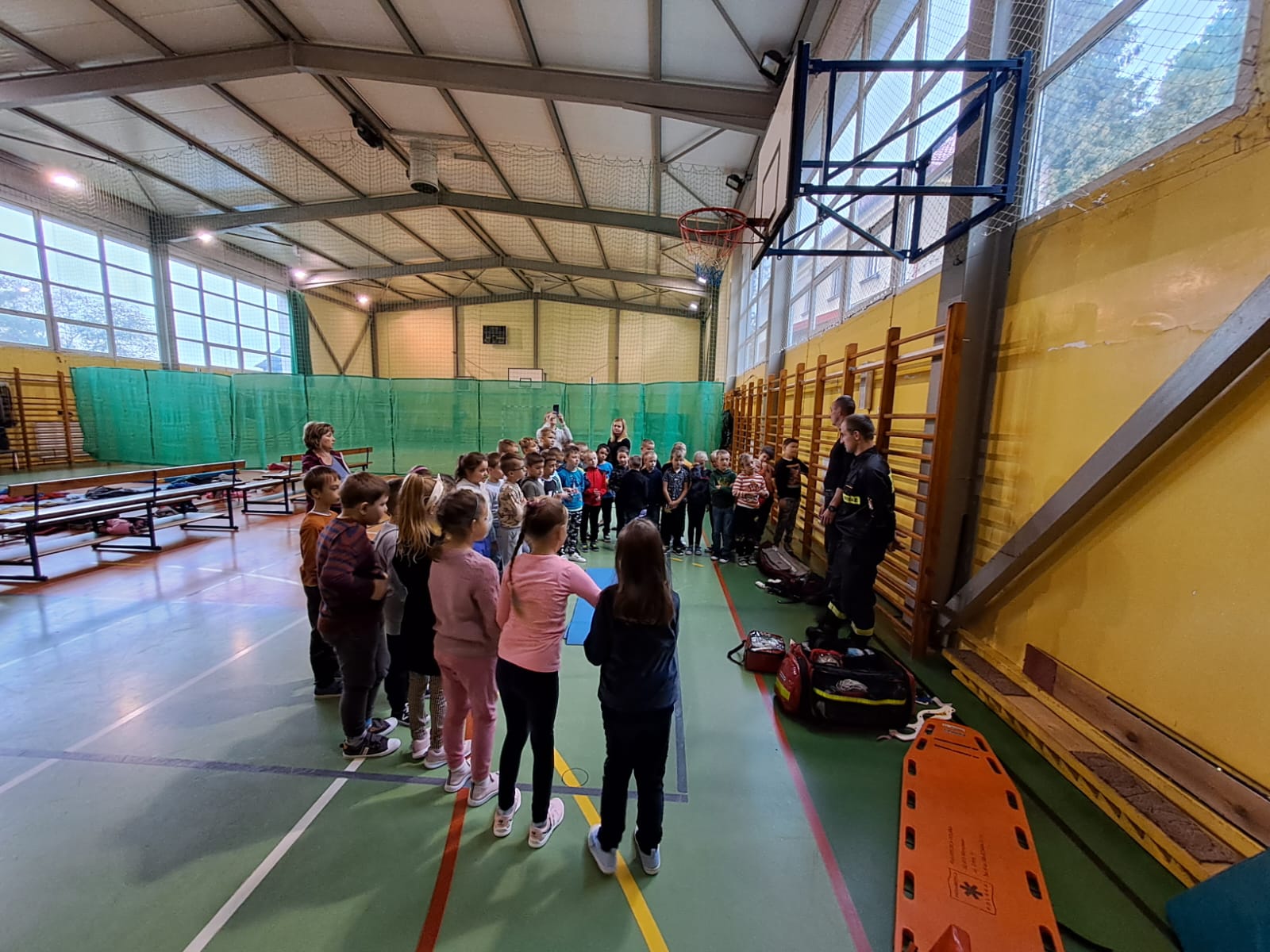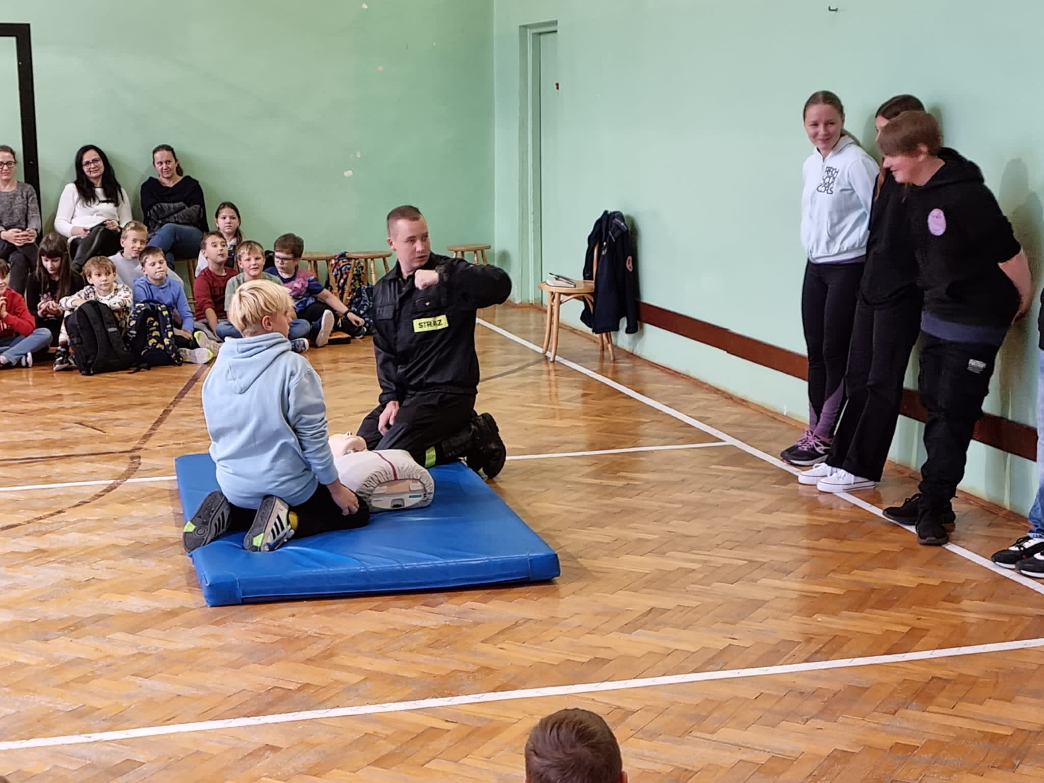 Podczas prelekcji dzieci mogły zapoznać się ze sprzętem jakim posługują się straży oraz spróbować własnych sił przy prowadzeniu resuscytacji krążeniowo-oddechowej prowadzonej na manekinie ćwiczebnym.