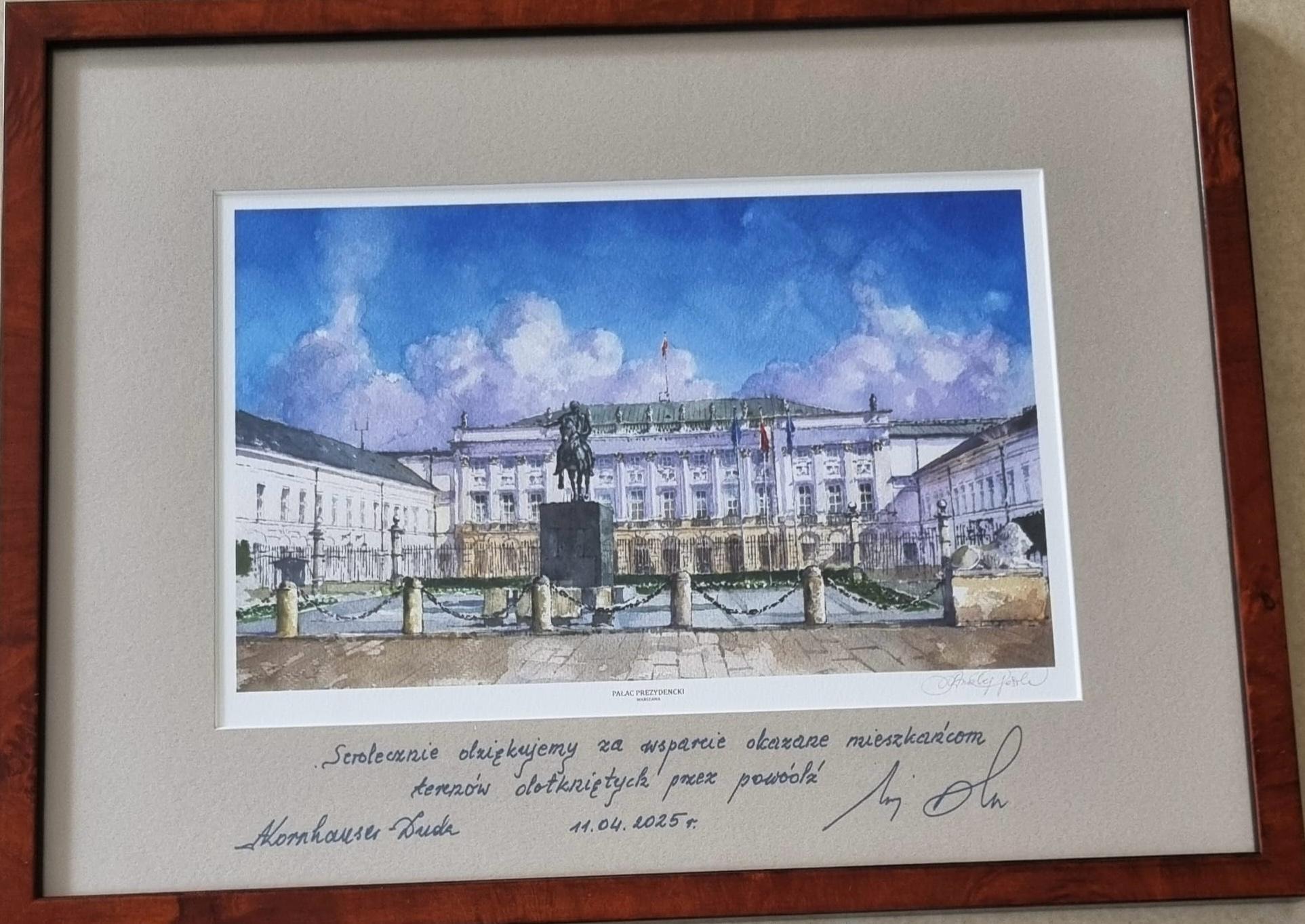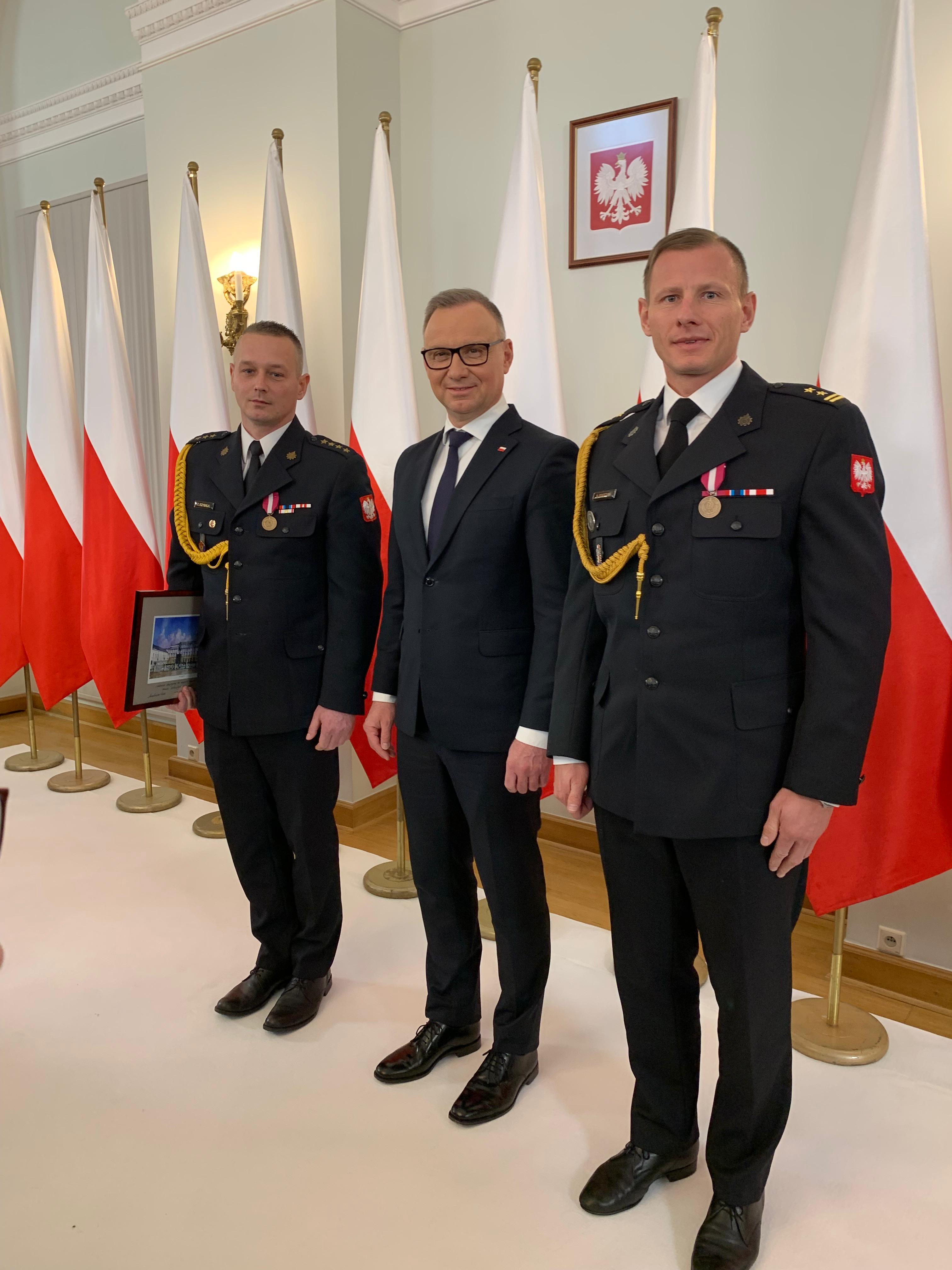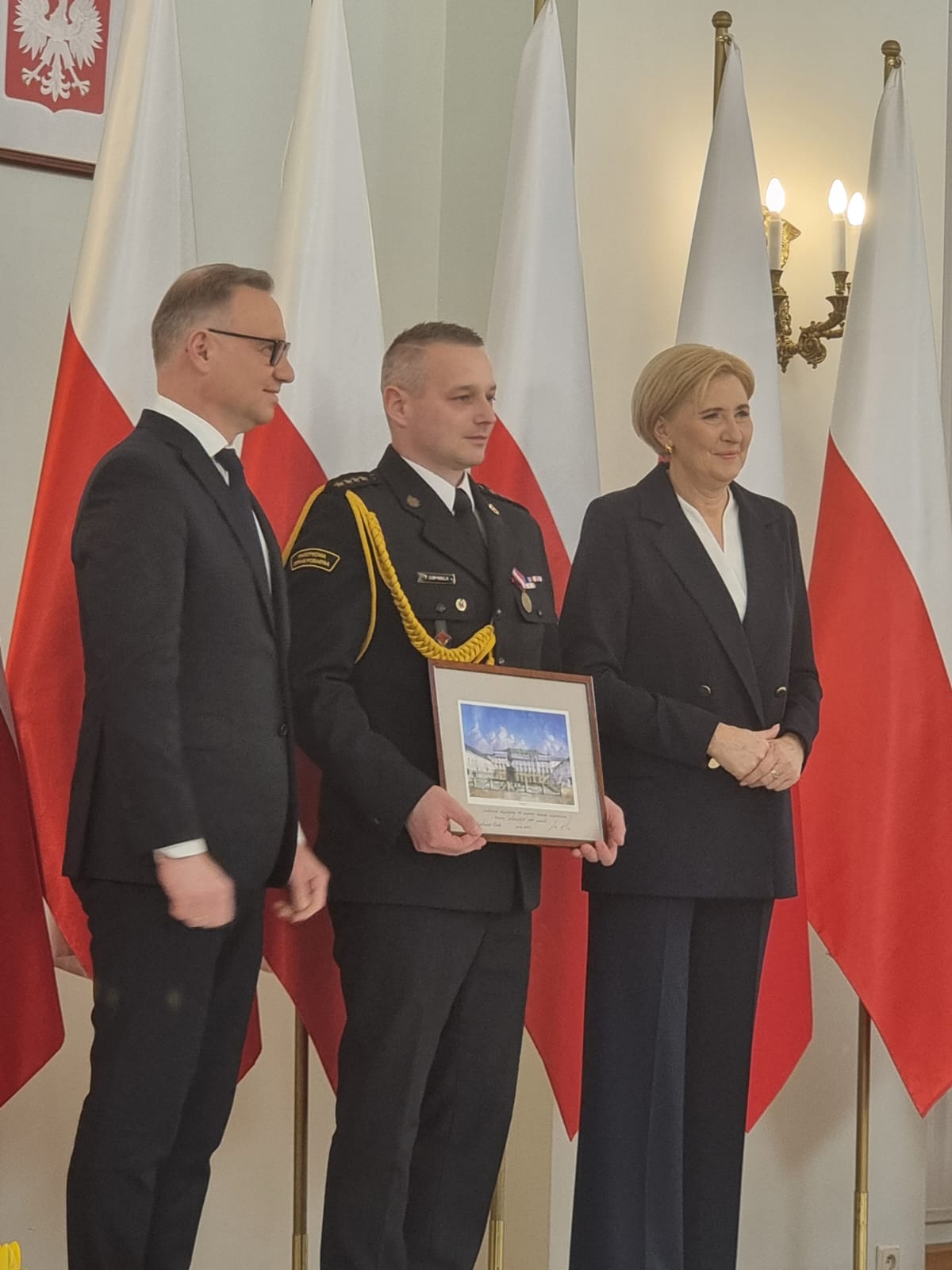 Z rąk Prezydenta RP Pana Andrzeja Dudy oraz Małżonki Prezydenta RP, Pani Agaty Kornhauser–Dudy, Komendant Powiatowy oraz Dowódca JRG nr 3 w Ustroniu przyjęli podziękowania za podjęte działania na rzecz wsparcia osób dotkniętych skutkami powodzi oraz za zaangażowanie w działania edukacyjne i prewencyjne.