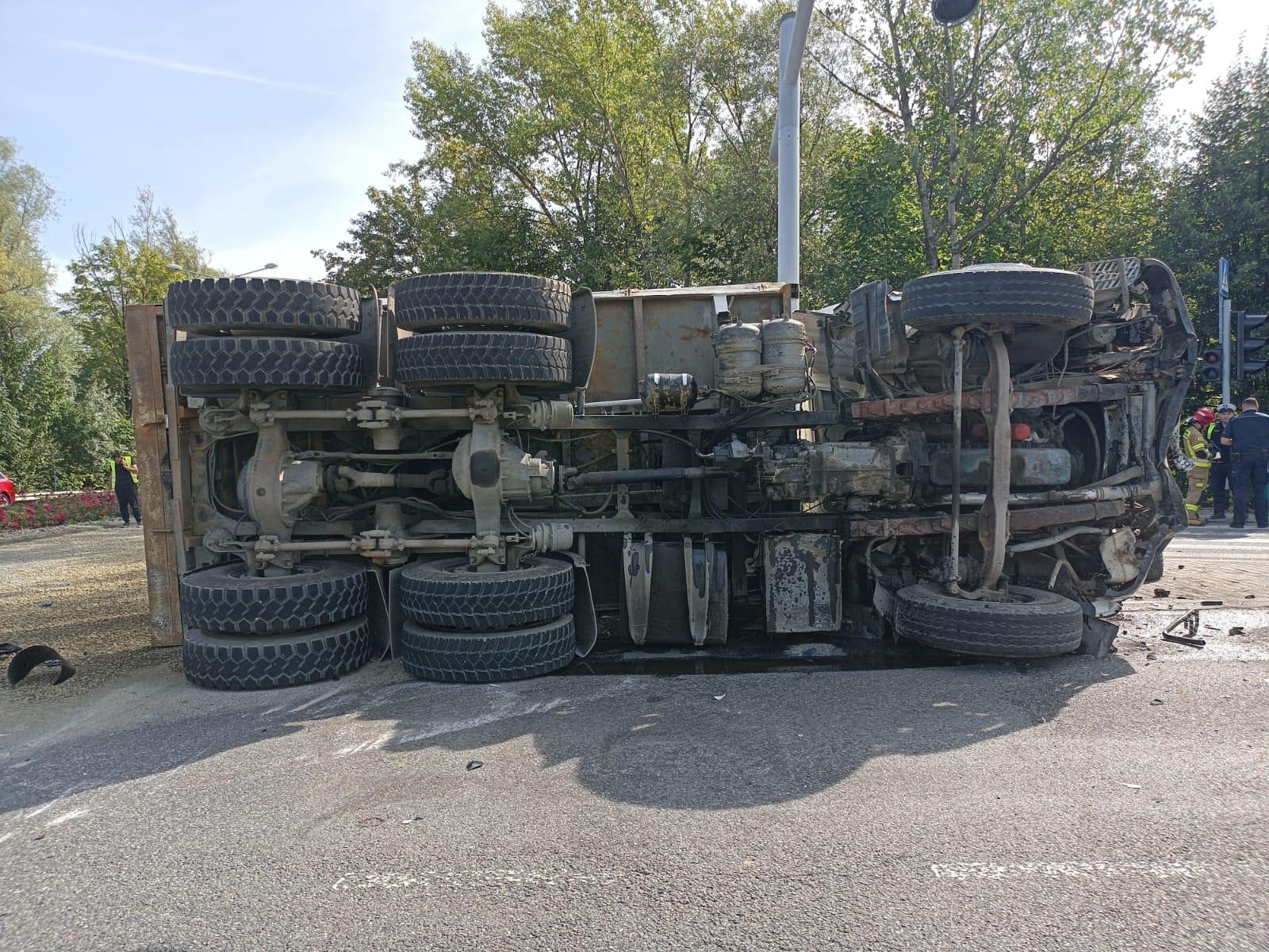 Po dojeździe na miejsce zdarzenia KDR (Kierujący Działaniami Ratowniczymi) w wyniku rozpoznania stwierdził zderzenie samochodu osobowego z samochodem ciężarowym przewożącym kruszywo. Samochód ciężarowy znajdował się na boku na jezdni, a samochód osobowy poza drogą.