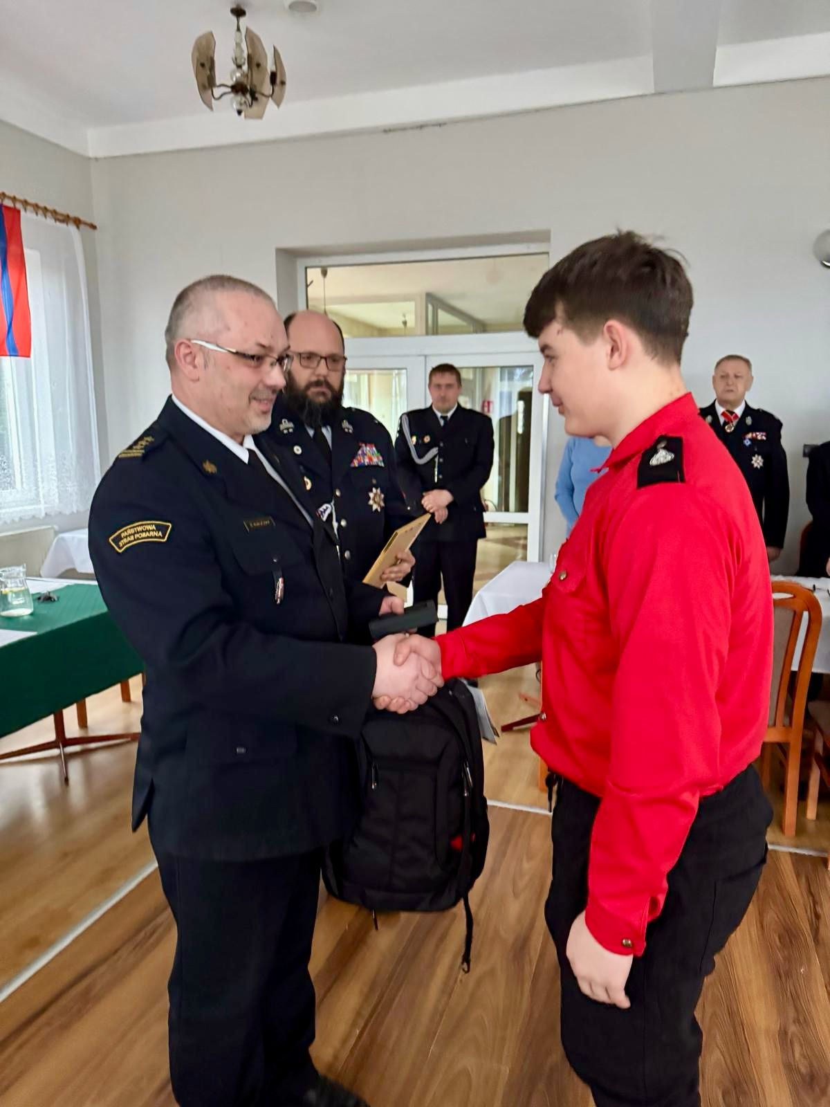 Uroczyste wręczenie odznaczenia Komendanta Głównego Państwowej Straży Pożarnej "Iuvenis Forti" młodemu druhowi z MDP OSP Cieszyn Pastwiska.