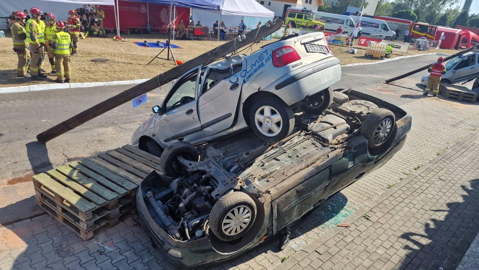Założenie, z którym przyszło zmierzyć się naszym Strażakom polegało na ewakuacji osoby poszkodowanej z samochodu, przygniecionego przez słup energetyczny, znajdującego się na drugim samochodzie który, leżał na dachu