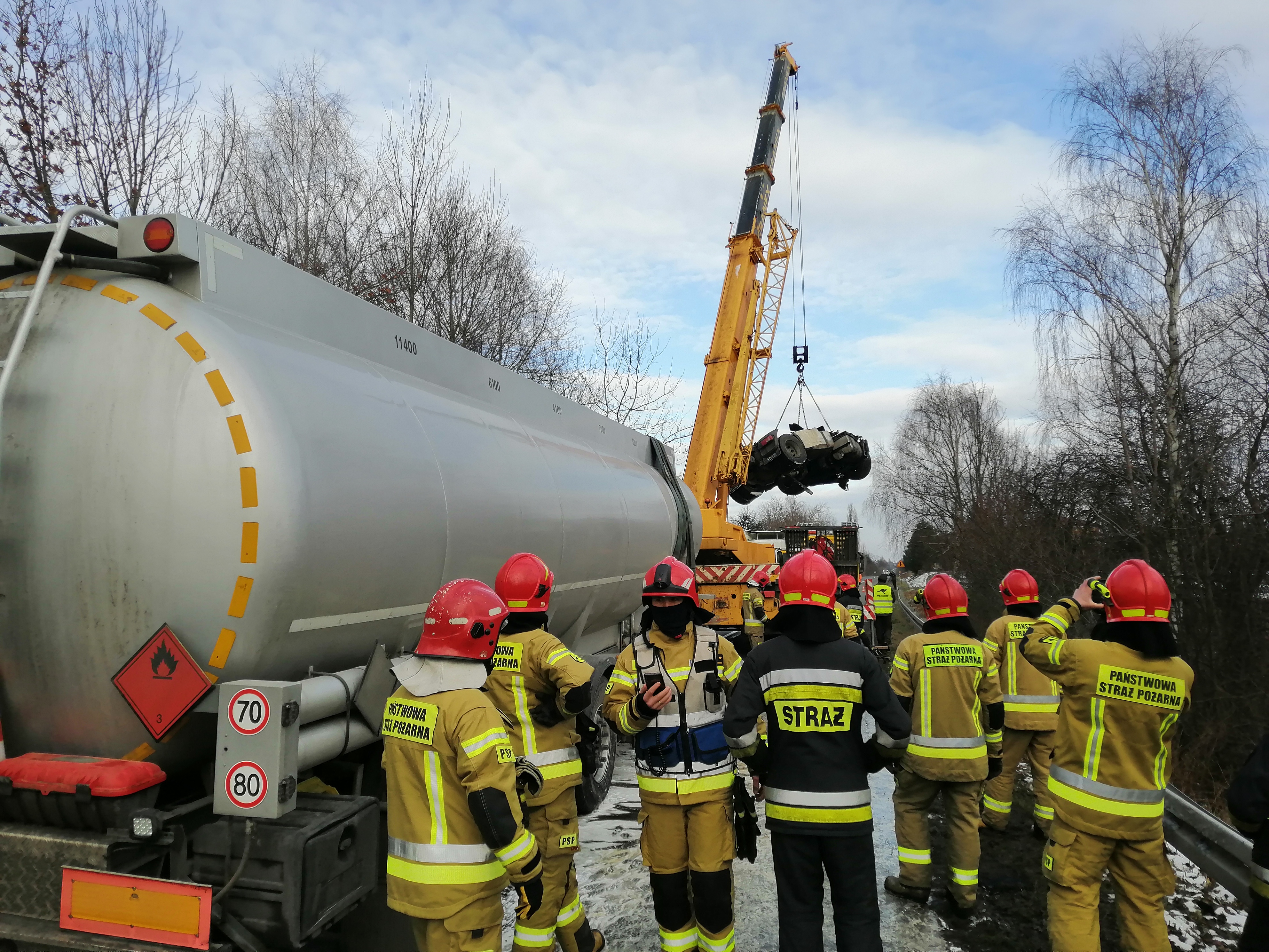 Pierwszy samochód był to tir z naczepą chłodni, drugi samchód - cysterena przewożący łątwopalny "toluen". Kierowcy obu aut uwięzieni byli w kabinach ciągników siodłowych. Droga została całkowicie zablokowana.