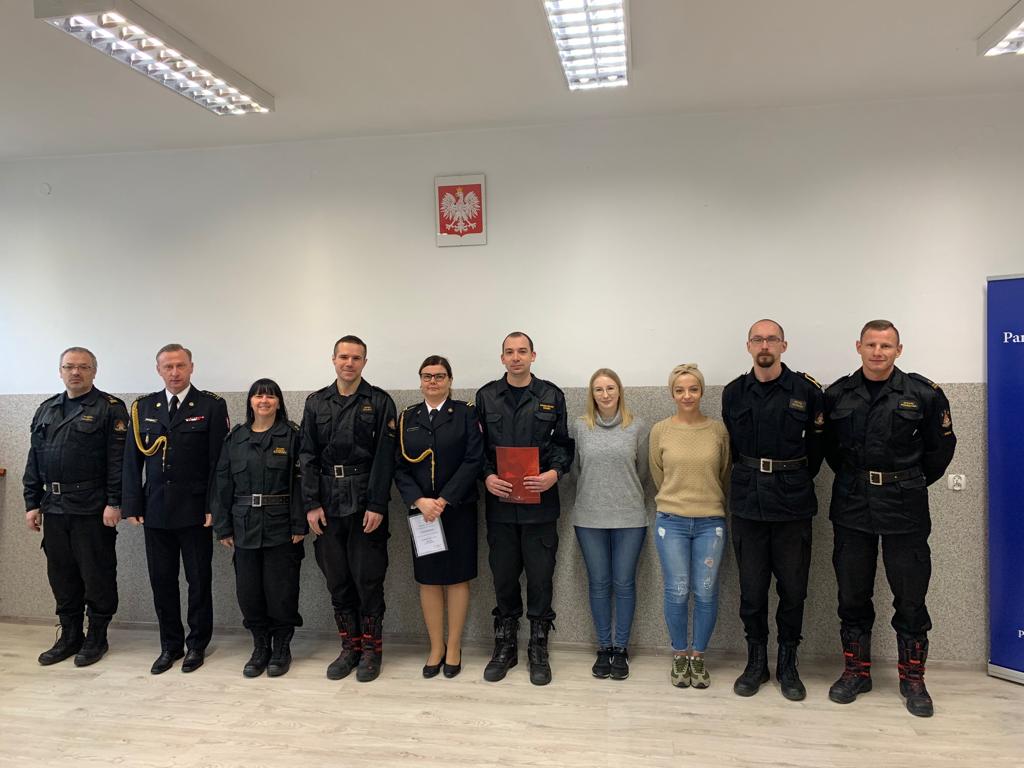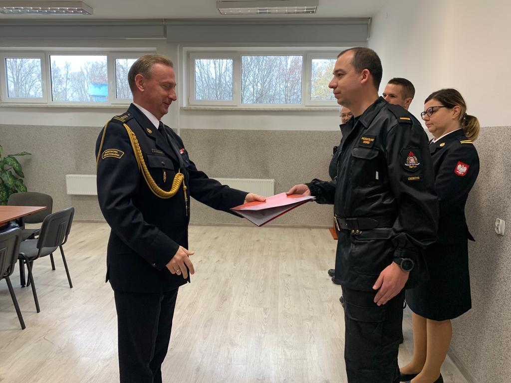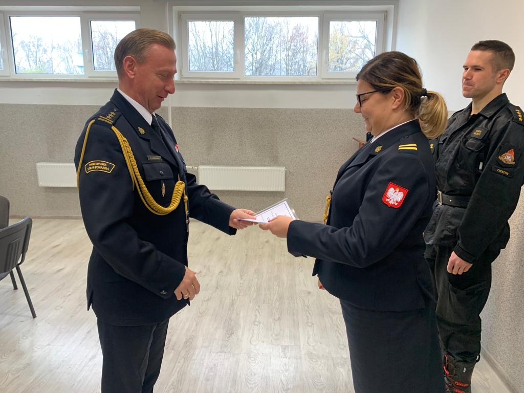 W dniu 18 listopada br. w sali sztabowej Komendy Powiatowej PSP w Cieszynie na zakończenie obchodów Narodowego Święta Niepodległości Komendant Powiatowy Państwowej Straży Pożarnej w Cieszynie st. bryg. Damian Legierski w imieniu Śląskiego Komendanta Wojewódzkiego nadbryg. Jacka Kleszczewskiego wręczył nagrody i awanse w stopniu pozostałym funkcjonariuszkom i funkcjonariuszom .