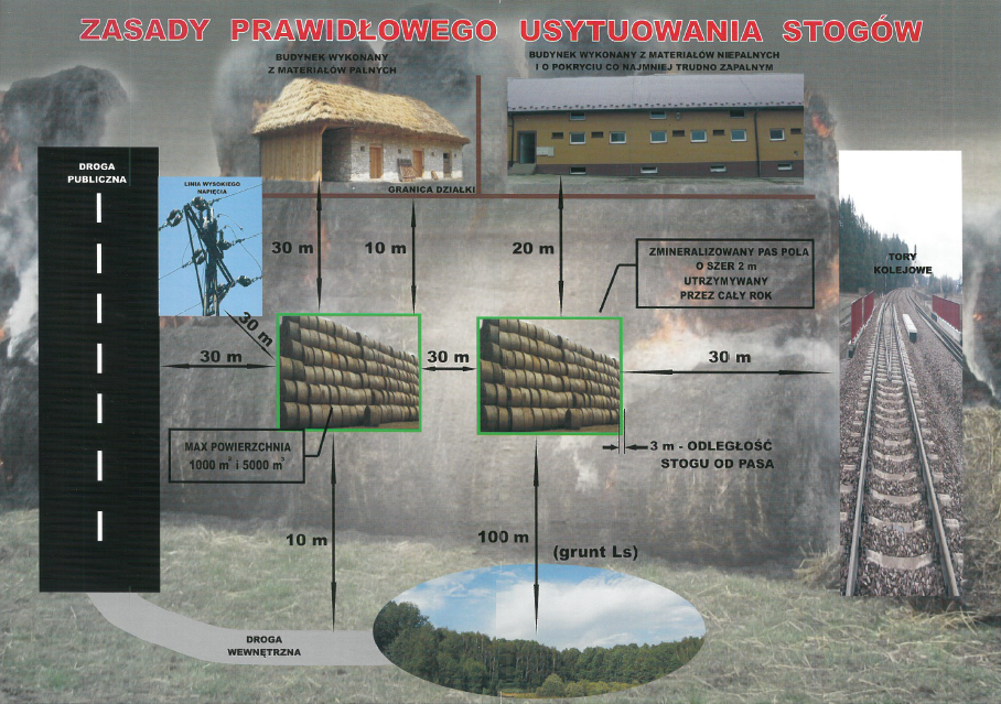 Warto pamiętać aby zabudowania gospodarcze i płody rolne były odpowiednio zabezpieczone przed ewentualną możliwością zaprószenia ognia. Pamiętać należy również o zachowaniu następujących odległości podczas umiejscawiania stert, stogów lub brogów z palnymi produktami roślinnymi o powierzchni nie przekraczającej 1000 m2 oraz max. kubaturze do 5000 m3 na terenie swojego gospodarstwa rolnego tj.: