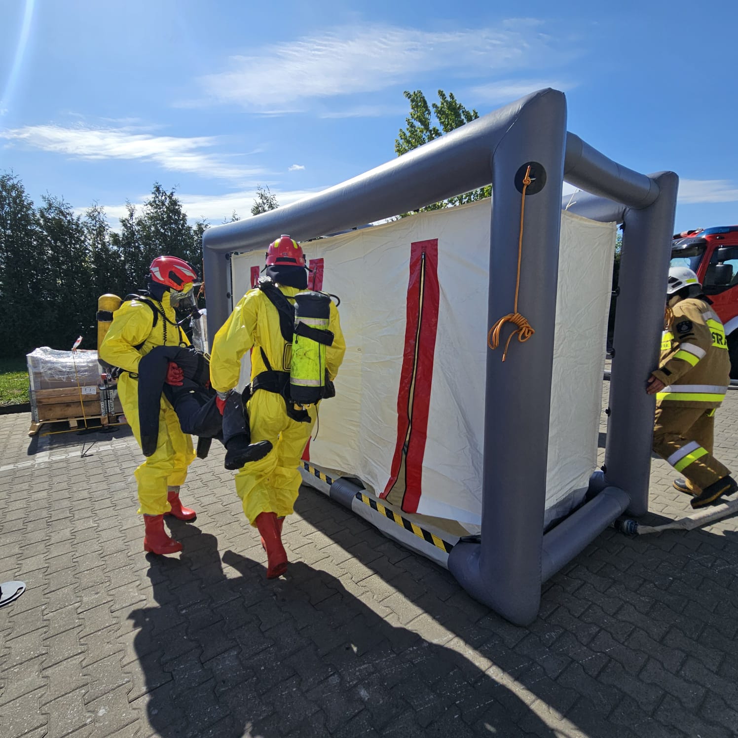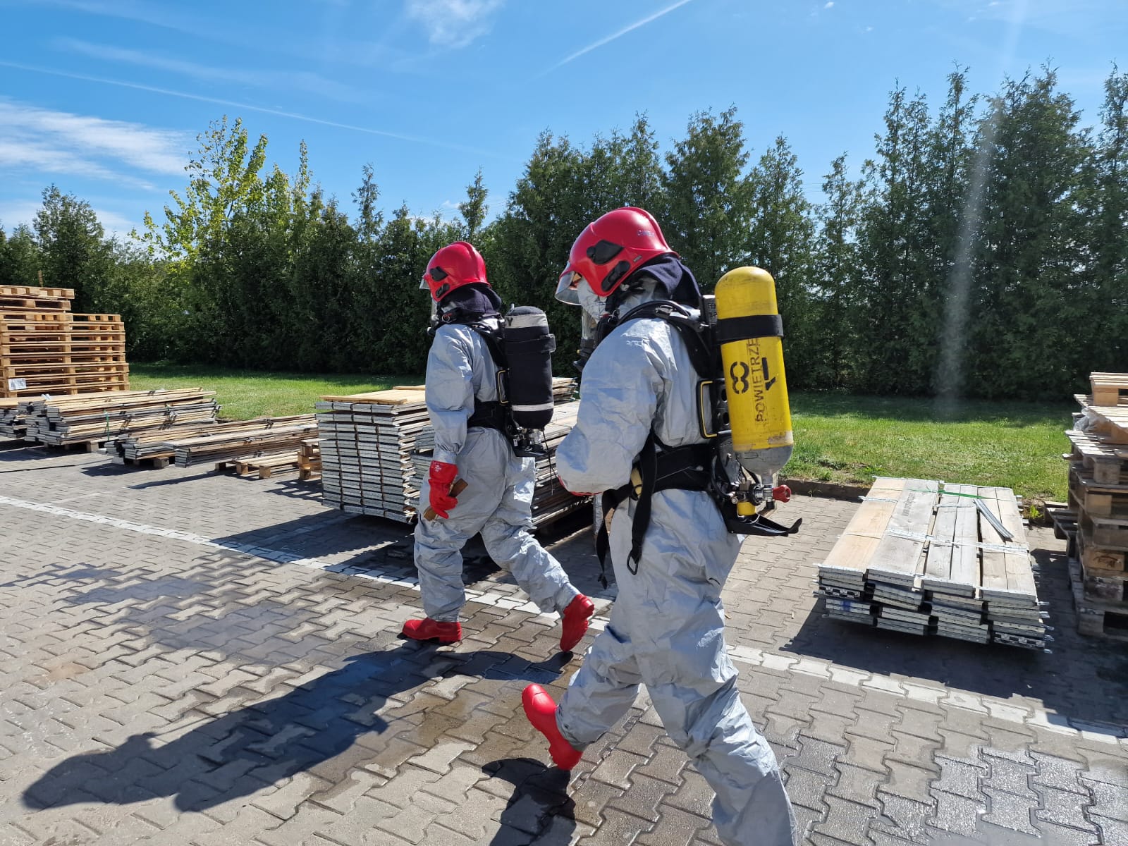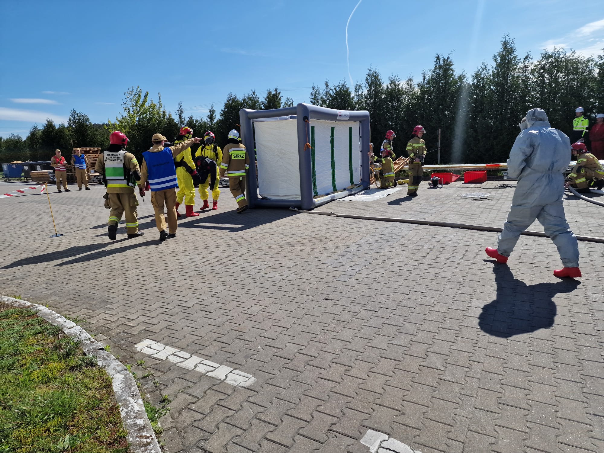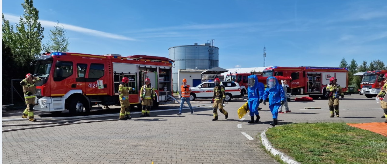 W dniach 28-30 kwietnia 2025 roku odbył się cykl ćwiczeń połączonych z rozpoznaniem operacyjnym obiektów hali anodowni w zakładzie produkcyjnym Hydro Extrusion Poland w Trzciance. W ćwiczeniach brali udział strażacy z Jednostki Ratowniczo-Gaśniczej PSP Nr 2 z Trzcianki; Specjalistycznej Grupy Ratownictwa Chemiczno-Ekologicznego wchodzącej w skład struktury organizacyjnej JRG PSP Nr 1 w Pile oraz druhowie z jednostek Ochotniczych Straży Pożarnych z terenu gm. Trzcianka, w tym m.in. z OSP KSRG w Białej, OSP w Stobnie oraz OSP w Niekursku. W pierwszym dniu ćwiczeń scenariusz przewidywał udzielenie pomocy i ewakuację osobie, która została przejechana przez wózek widłowy w hali magazynowej. W kolejnym dniu zmiana służbowa zmagała się z udzieleniem KPP i ewakuacją z wysokości pracownika, który doznał zawału serca podczas prac konserwacyjnych na dachu obiektu. W ostatnim dniu doskonalenia, plan przewidywał uszkodzenie płaszcza cysterny przez jadący wózek widłowy. W wyniku tego zdarzenia doszło do wycieku substancji żrącej, a poszkodowanych zostało 5 osób. Po przeprowadzeniu ewakuacji przez osobę odpowiedzialną, zadaniem ratowników było zlokalizowanie wycieku, ewakuacja ze strefy zagrożenia osób poszkodowanych oraz udzielenie im kwalifikowanej pierwszej pomocy. Następnie wraz z ratownikami z SGRChem-Eko dalsze działania polegały na uszczelnieniu rozerwanego płaszcza cysterny oraz neutralizacji rozlanej substancji. Każdego dnia po zakończeniu ćwiczeń strażacy przeprowadzili rozpoznania operacyjne obiektu, w trakcie których pozyskiwali istotne informacje na temat procesu technologicznego, oraz ewentualnymi zagrożeniami występującymi na terenie zakładu.