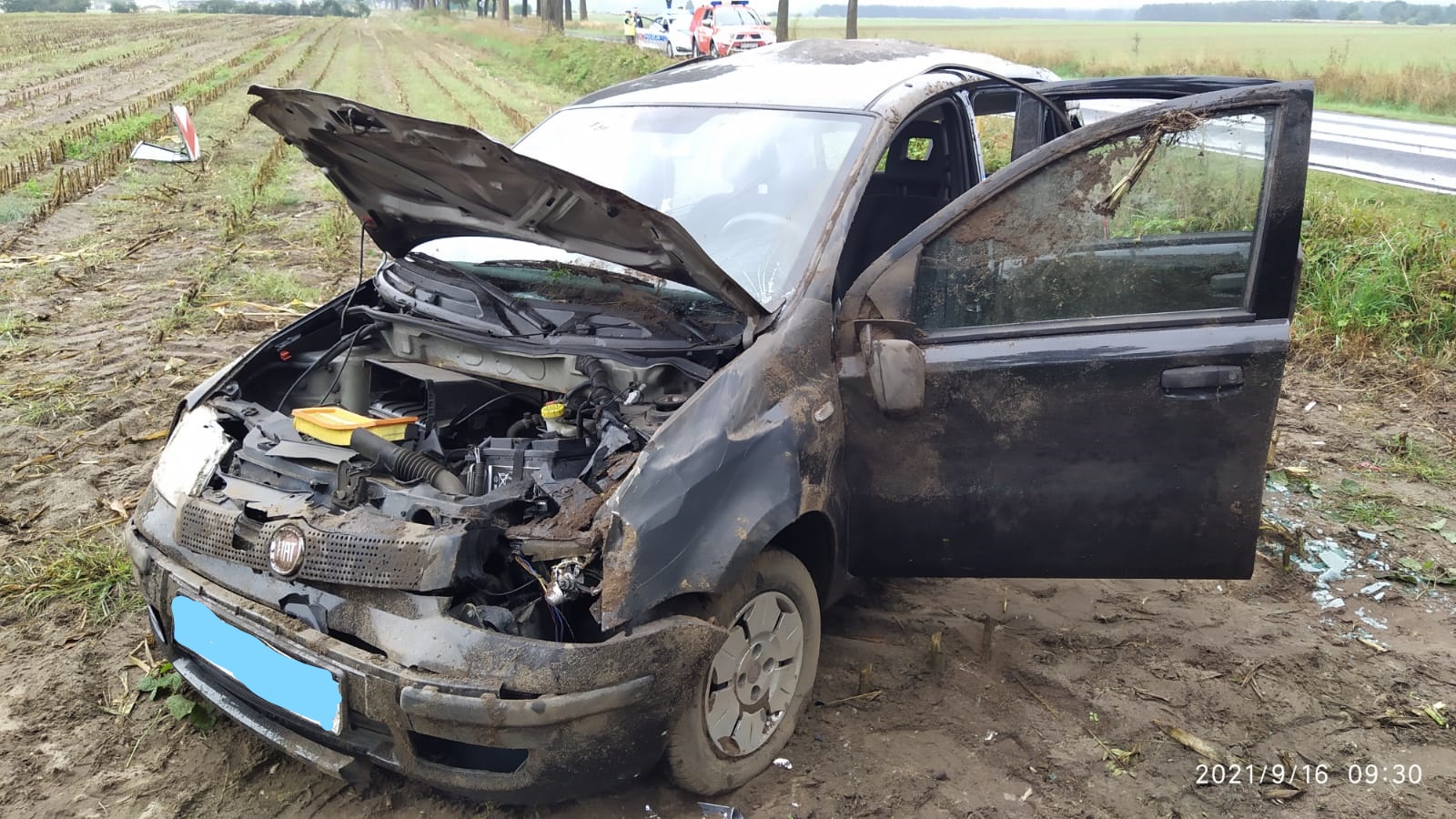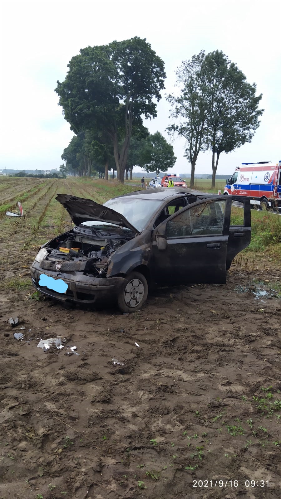 16 września 2021 r. w godzinach rannych Stanowisko Kierowania Komendanta Powiatowego w Czarnkowie otrzymało informację o wypadku na drodze wojewódzkiej nr 181 na trasie Wrzeszczyna - Wieleń, w wyniku którego dachował samochód osobowy. Do zdarzenia zostały zadysponowane zastępy z JRG PSP w Czarnkowie oraz zastępy z OSP KSRG Wieleń. Po dojeździe na miejsce zdarzenia ustalono, że samochód osobowy marki Fiat Panda stoi na kołach po dachowaniu na pobliskim polu. Działania strażaków polegały na zabezpieczeniu miejsca zdarzenia oraz udzieleniu kwalifikowanej pierwszej pomocy podróżującym pojazdem, którzy wcześniej o własnych siłach opuścili pojazd. Następnie przybyli na miejsce ratownicy medyczni zabrali trzech poszkodowanych do Szpitalnego Oddziału Ratunkowego.