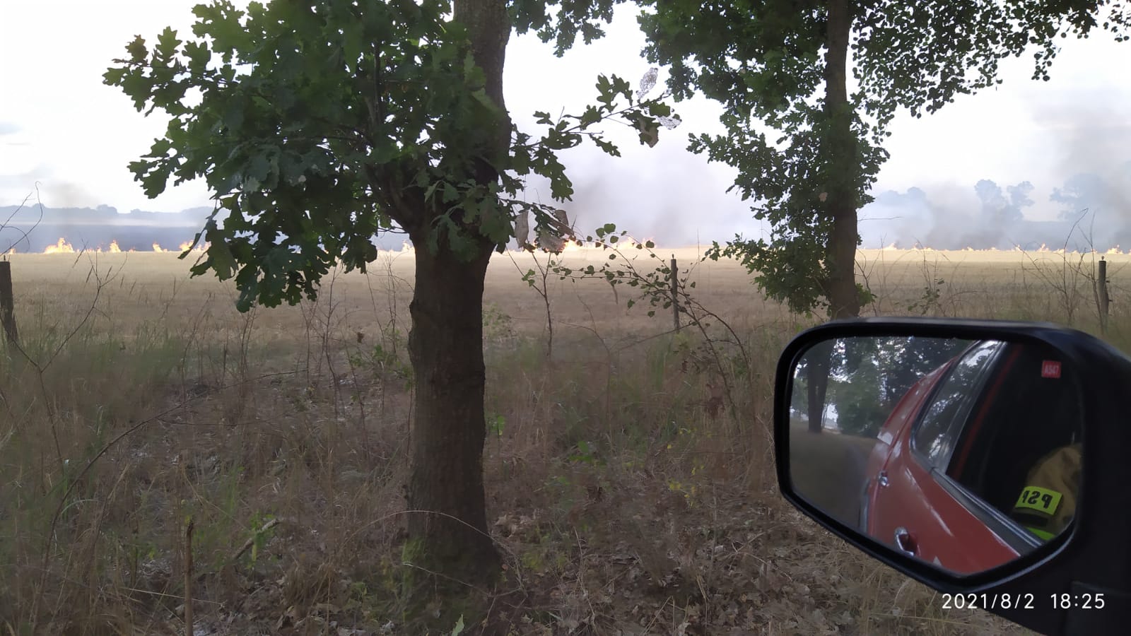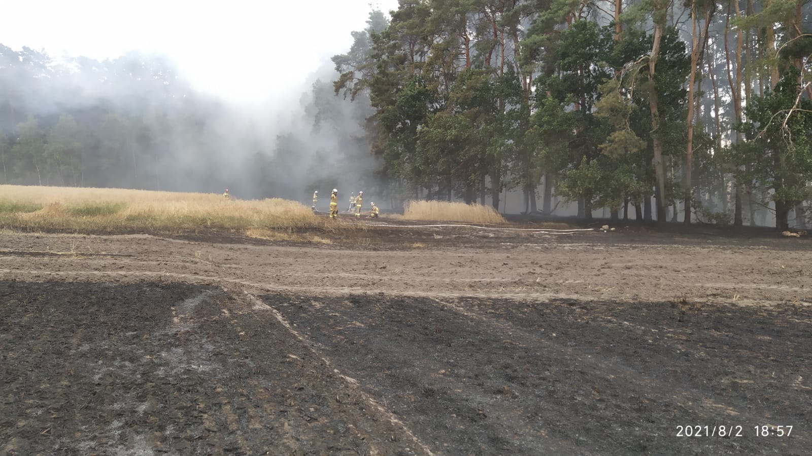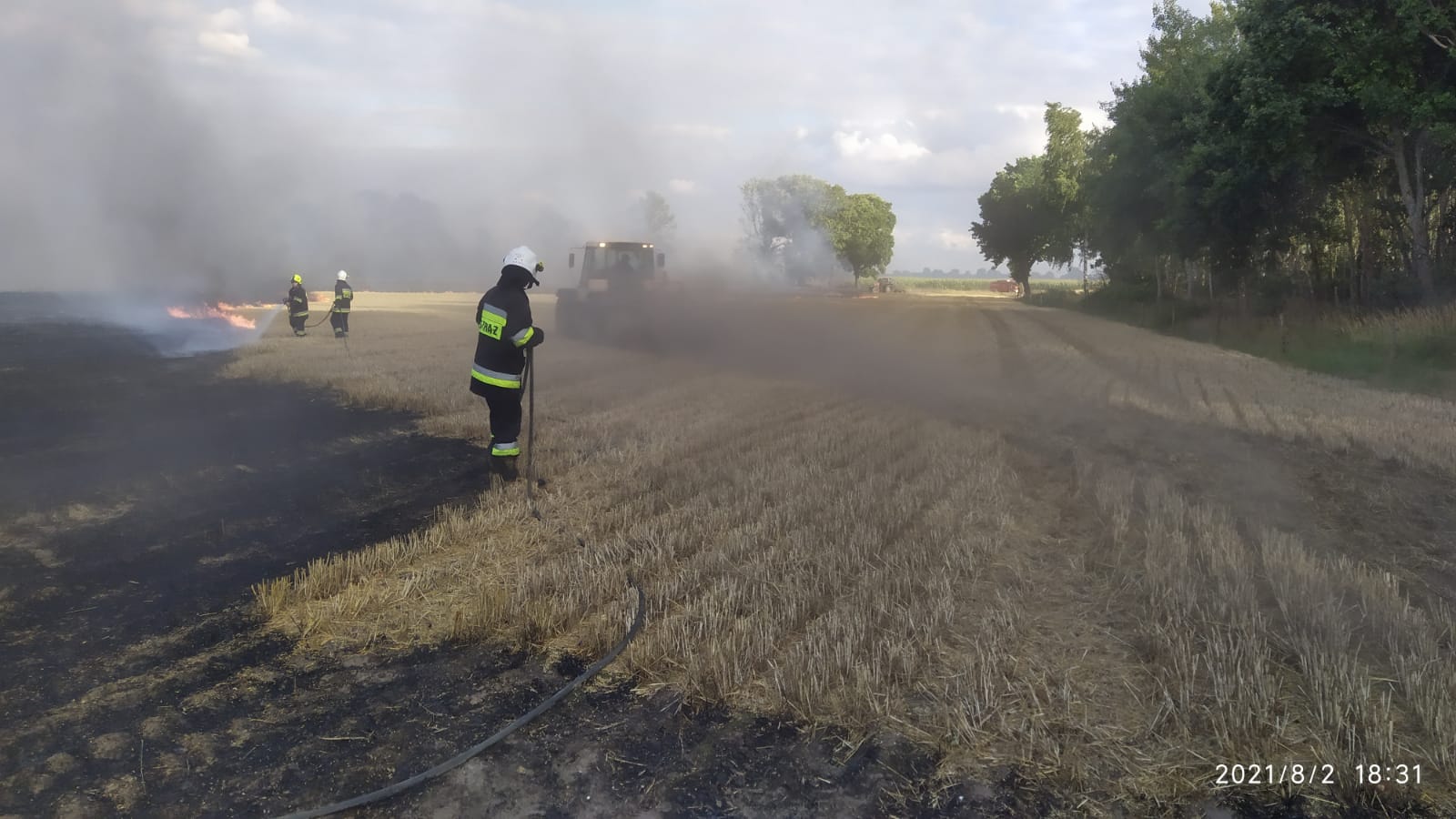 W akcji gaszenia pożaru udział brały dwa samoloty gaśnicze, które dokonały 4 zrzutów wody na ognisko pożaru, znacząco ograniczając intensywność jego rozprzestrzeniania. W chwili przyjazdu na miejsce, pożar zajmował powierzchnię ok 15 ha. Wiejący wiatr i duże zadymienie znacznie utrudniały działania gaśnicze. Miejscowi rolnicy ciągnikami rolniczymi oborywali zboże próbując zmniejszyć intensywność rozprzestrzeniania się pożaru. W trakcie działań podano 15 prądów gaśniczych w natarciu i obronie na palące się zboże, ściołę w lesie i ściernisko. W pożarze spaleniu uległo 30ha ścierniska, 7ha zboża na pniu, 1ha ścioły w lesie. W trakcie działań na miejsce przybyli przedstawiciele Nadleśnictwa Trzcianka wraz