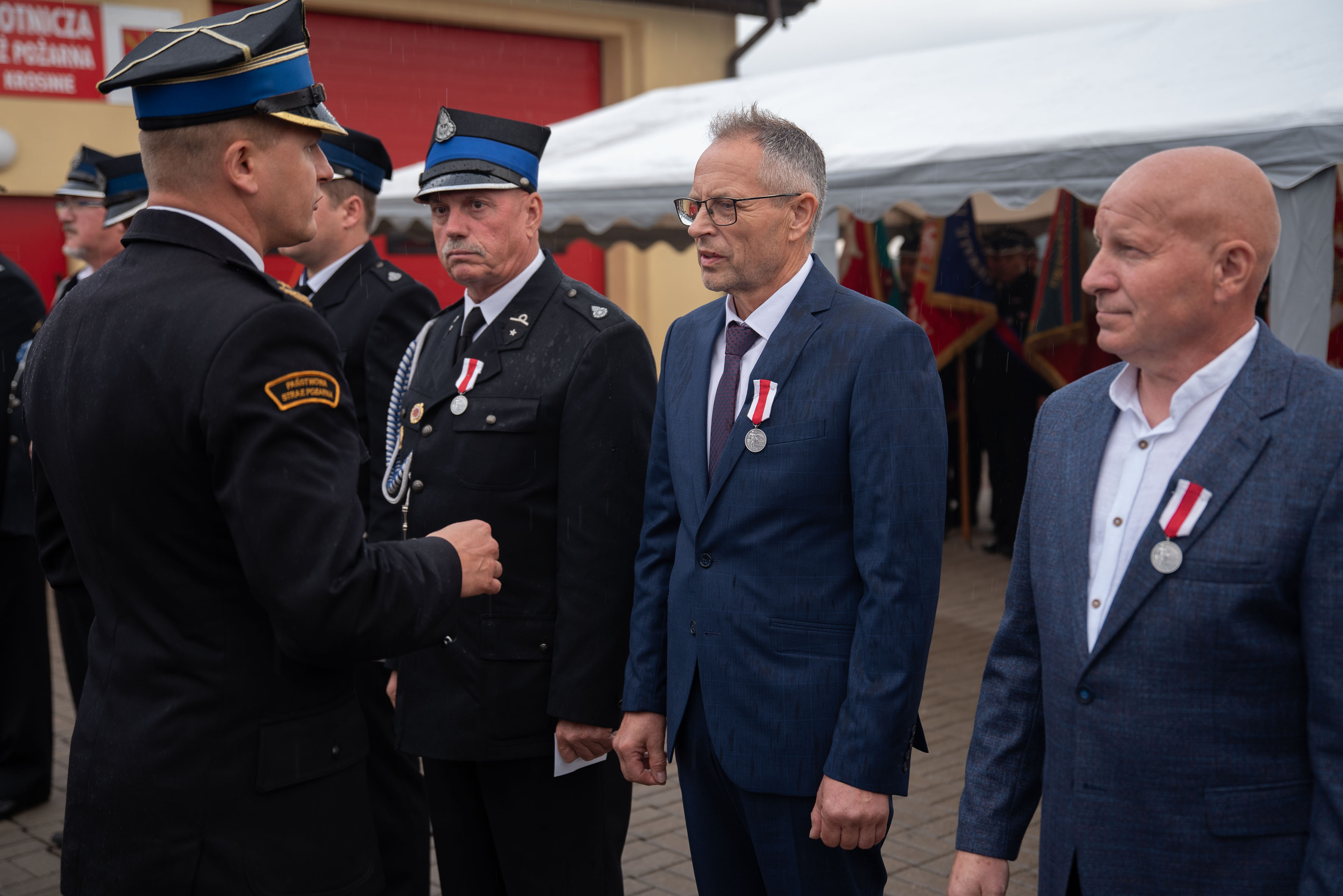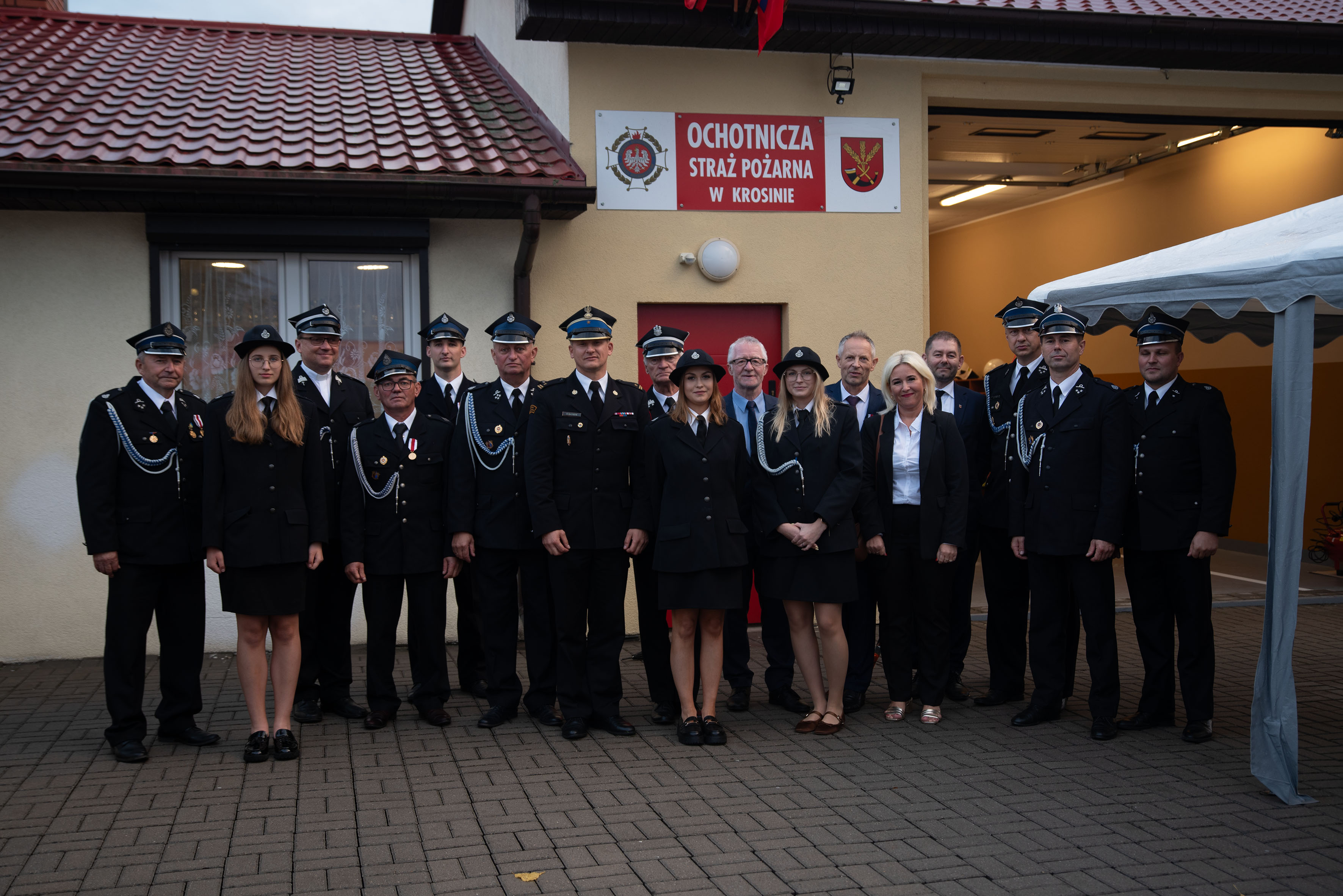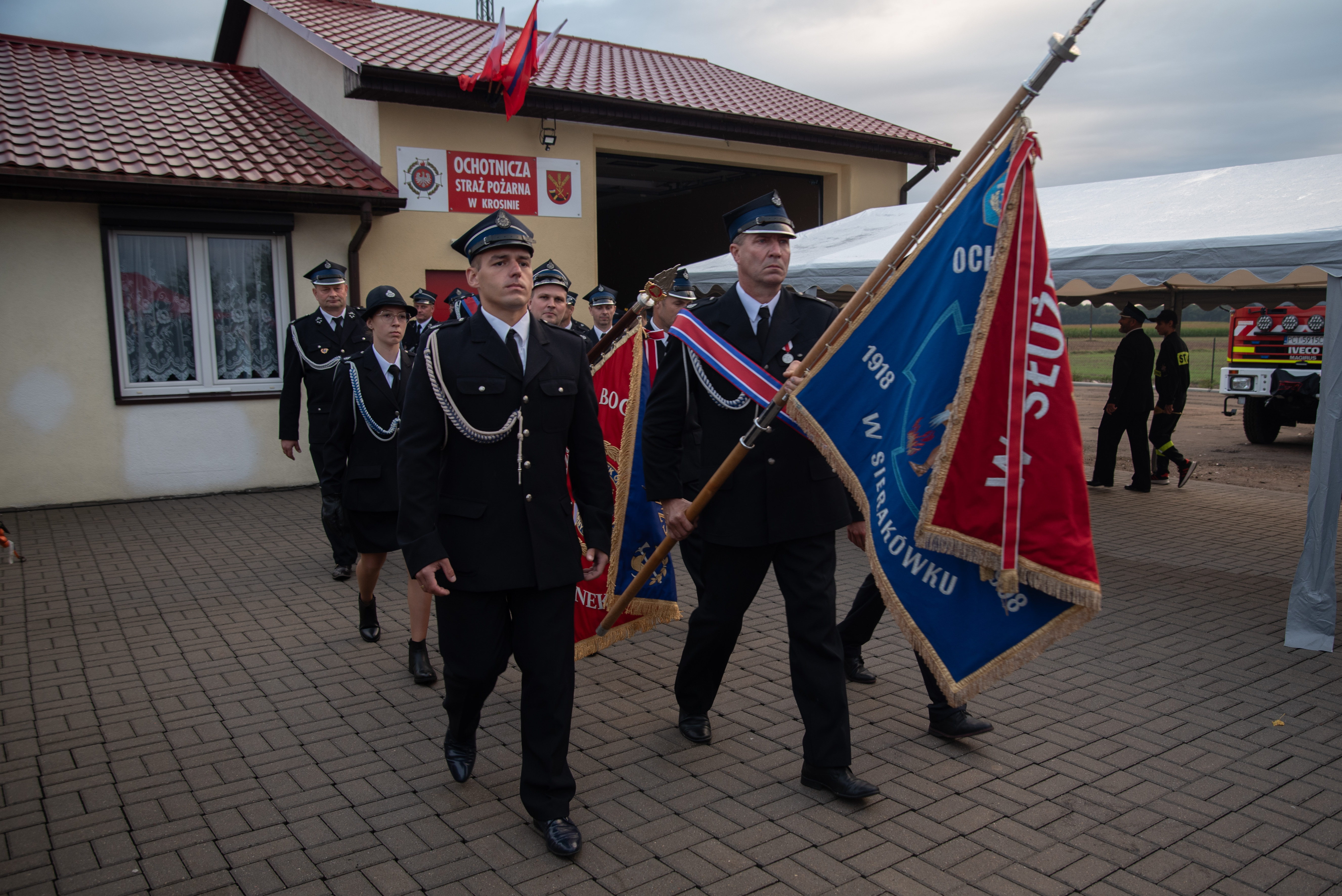 gdzie uroczyście wprowadzono na plac zaproszone poczty sztandarowe jednostek OSP. Następnie dowódca uroczystości zgodnie z Ceremoniałem Pożarniczym rozpoczął jubileusz złożeniem meldunku przez dowódcę uroczystości Prezesowi Zarządu Oddziału Powiatowego ZOSP RP w Czarnkowie – dh Edwardowi Wieczorek, po czym odegrano hymn polski. Po uroczyście odśpiewanym hymnie Przedstawiciel Zarządu OSP w Krosinie przywitał wszystkich zaproszonych gości, w tym samorządowców, radnych, duchownych, komendantów oraz przede wszystkich ochotników i mieszkańców wsi Krosin. Odczytano rys historyczny jednostki OSP z Krosina, w którym uchwycono moment z 30.11.1935 r. dotyczący m.in. zawarcia historycznego wpisu Rejestru Stowarzyszeń i Związków Poznańskiego Urzędu Wojewódzkiego, stanowiący do dzisiaj symboliczny początek powstania OSP w Krosinie. Wręczono również szereg odznaczeń i wyróżnień dla strażaków ochotników po czym przystąpiono do licznych podziękowań i przemówień okolicznościowych.