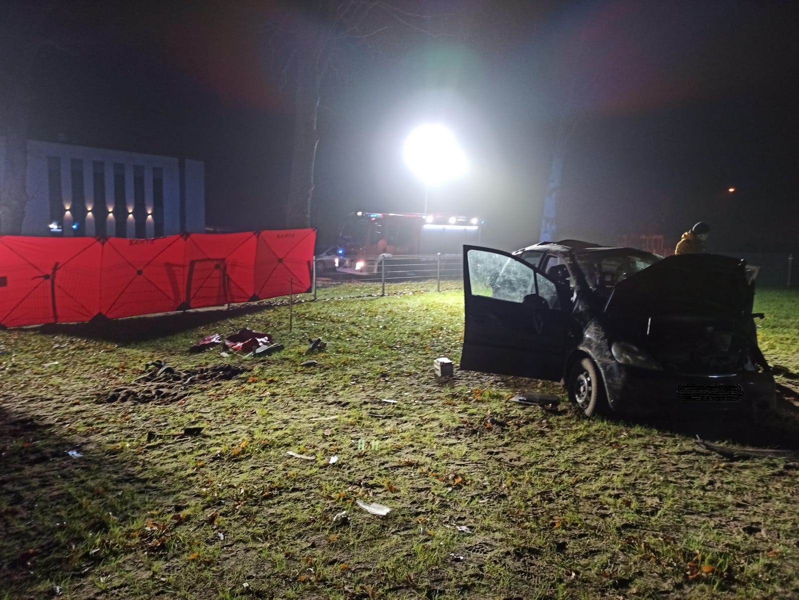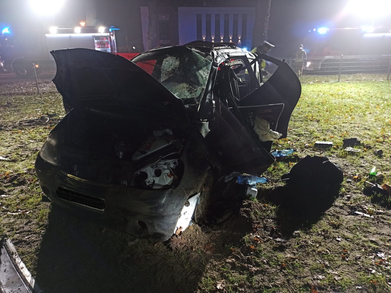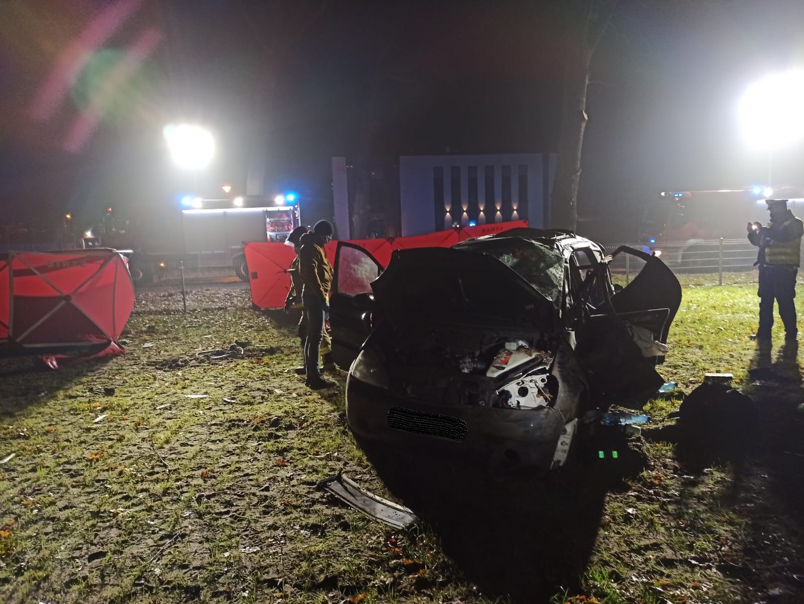 19 grudnia 2020 r, o godzinie 20:18 Dyżurny Stanowiska Kierowania Komendanta Powiatowego PSP w Czarnkowie otrzymał informację o wypadku samochodu osobowego w miejscowości Wizany (gm. Krzyż Wielkopolski). Ze wstępnych informacji wynikało, że dachował samochód osobowy, z którego prawdopodobnie wypadły dwie osoby. Po dotarciu na miejsce pierwszych zastępów stwierdzono, że kierujący samochodem osobowym marki Mercedes na prostym odcinku drogi prawdopodobnie stracił panowanie nad pojazdem, wypadł z drogi i po przejechaniu krótkiej odległości dachował uszkadzając przy tym ogrodzenie i infrastrukturę sportową boiska do piłki nożnej. Podróżujący samochodem dwoje mężczyzn w wieku 23 i 24 lat, mieszkańcy gminy Krzyż Wielkopolski, prawdopodobnie podczas dachowania wypadli z samochodu i znajdowali się niedaleko pojazdu. U jednego z poszkodowanych kierowca innego pojazdu nie biorącego udziału w zdarzeniu rozpoczął resuscytację krążeniowo-oddechową, którą kontynuowali strażacy aż do przekazania poszkodowanego Zespołowi Ratownictwa Medycznego. Kierownik Zespołu po zbadaniu podjął decyzję o odstąpieniu od medycznych czynności ratunkowych. Drugi z poszkodowanych z urazami wielonarządowymi został zabrany przez Zespół Ratownictwa Medycznego do Szpitala Specjalistycznego w Pile. Oprócz czynności medycznych działania zastępów straży pożarnej polegały na zabezpieczeniu i oświetleniu terenu akcji. Droga na czas działań była całkowicie zablokowana. W działaniach brały udział: zastępy Państwowej Straży Pożarnej z Trzcianki oraz Ochotniczych Straży Pożarnej z Kuźnicy Żelichowskiej i Krzyża Wielkopolskiego, dwa Zespoły Ratownictwa Medycznego, prokurator wraz z funkcjonariuszami Policji w Czarnkowie. Na miejsce przybył również Oficer w dyspozycji Komendanta Powiatowego PSP w Czarnkowie.