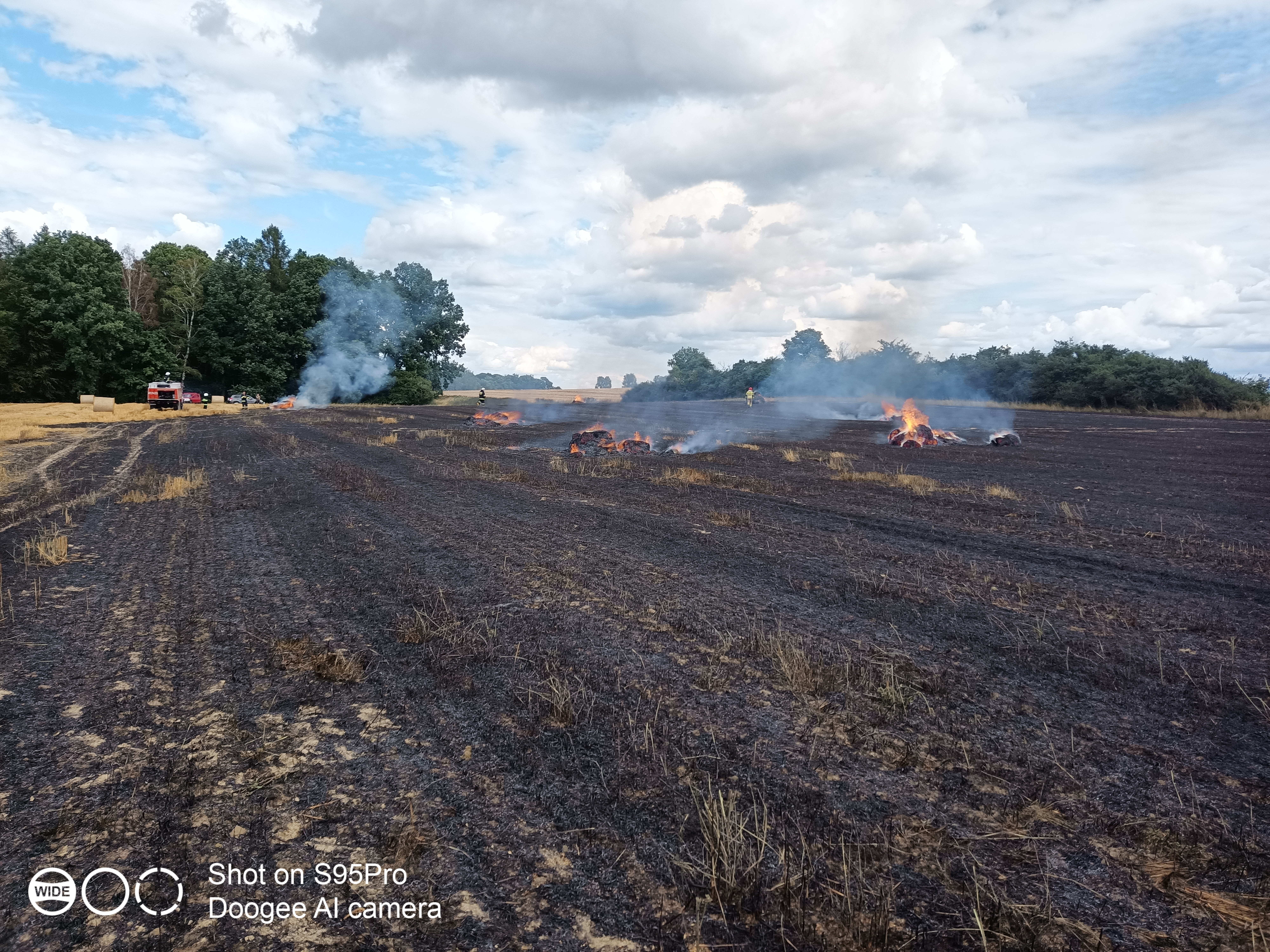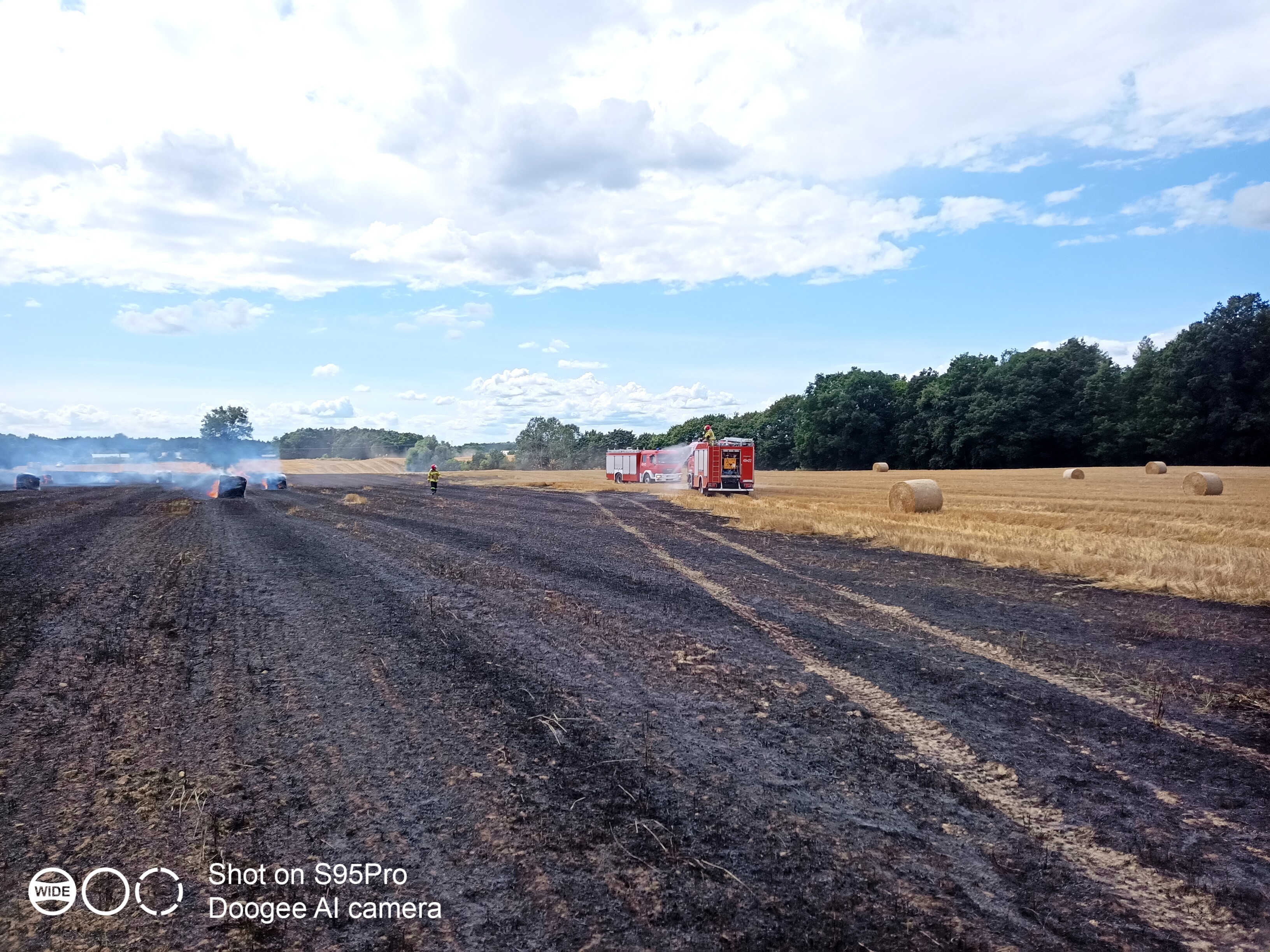 4 prądów wody w natarciu okrążającym na palące się ściernisko. Równocześnie pozostali strażacy za pomocą podręcznego sprzętu gaśniczego tj. tłumice, łopaty gasili pożar. Właściciel pola zorganizował ciągnik rolniczy z pługiem w celu oborania pożarzyska. Działania utrudniał porywisty wiatr oraz bliskość lasu. Łącznie spaliło się ok. 3 ha ścierniska oraz 13 balotów słomy.