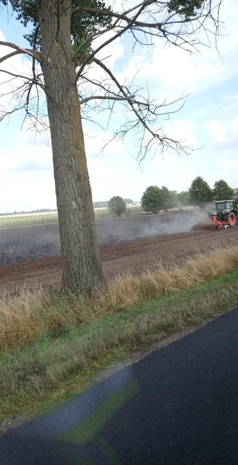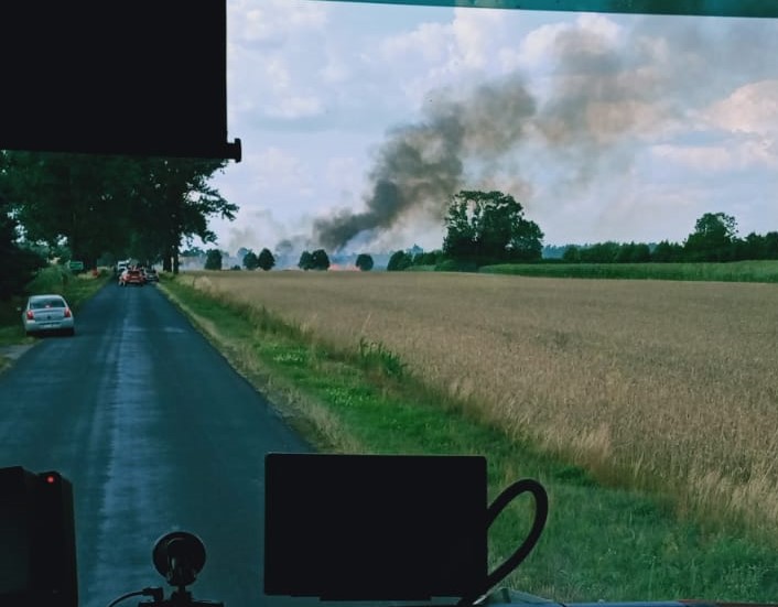 na podaniu 3 prądów wody na palące się zboże. Równocześnie pozostali strażacy za pomocą podręcznego sprzętu gaśniczego tj. tłumice, łopaty gasili pożar. Właściciel pola zorganizował 2 ciągniki rolnicze z agregatami uprawowymi w celu oborania pożarzyska. Działania utrudniał porywisty wiatr. Łącznie spaliło się ok. 1 ha oraz pozostałości roślinne.