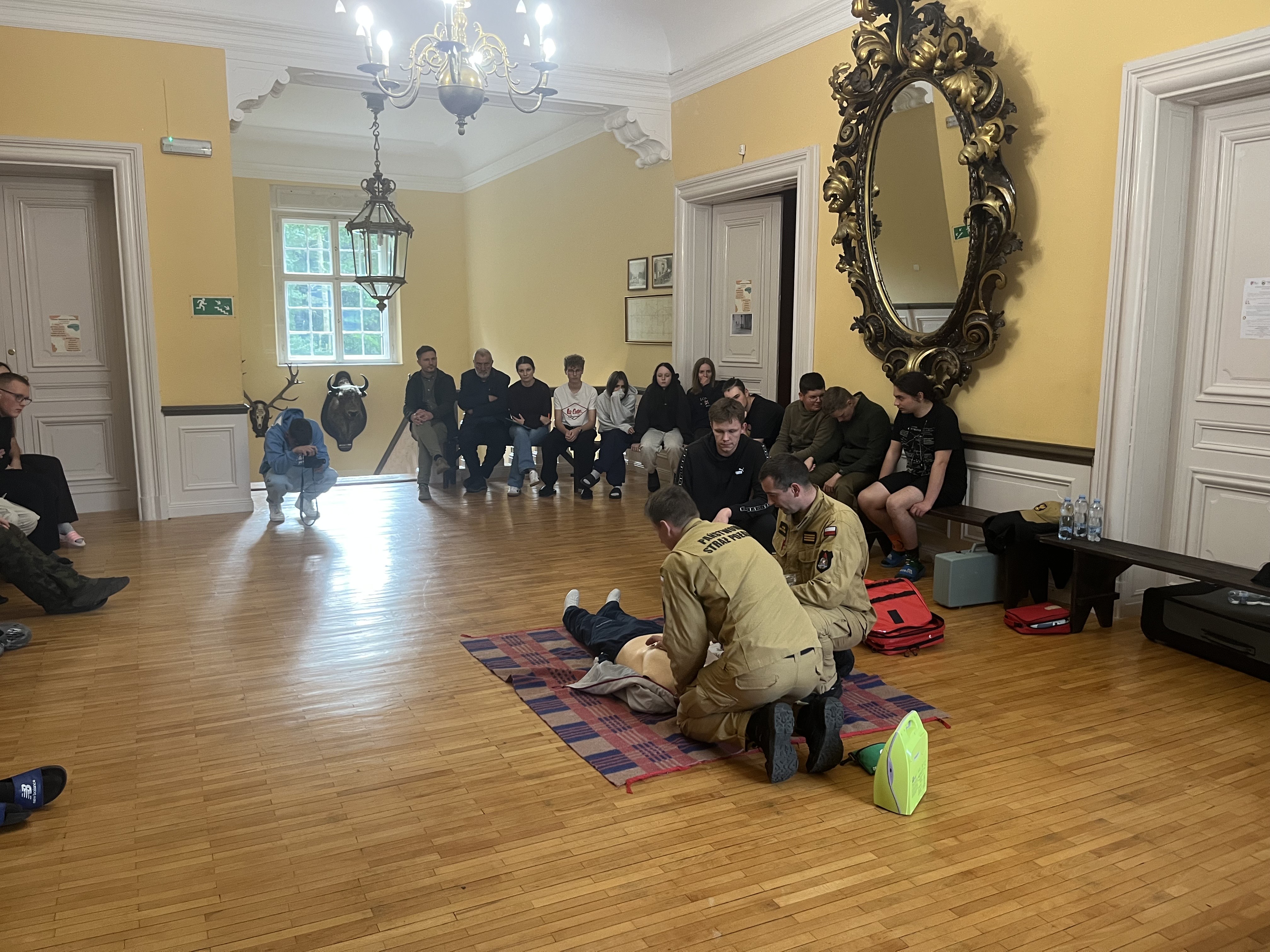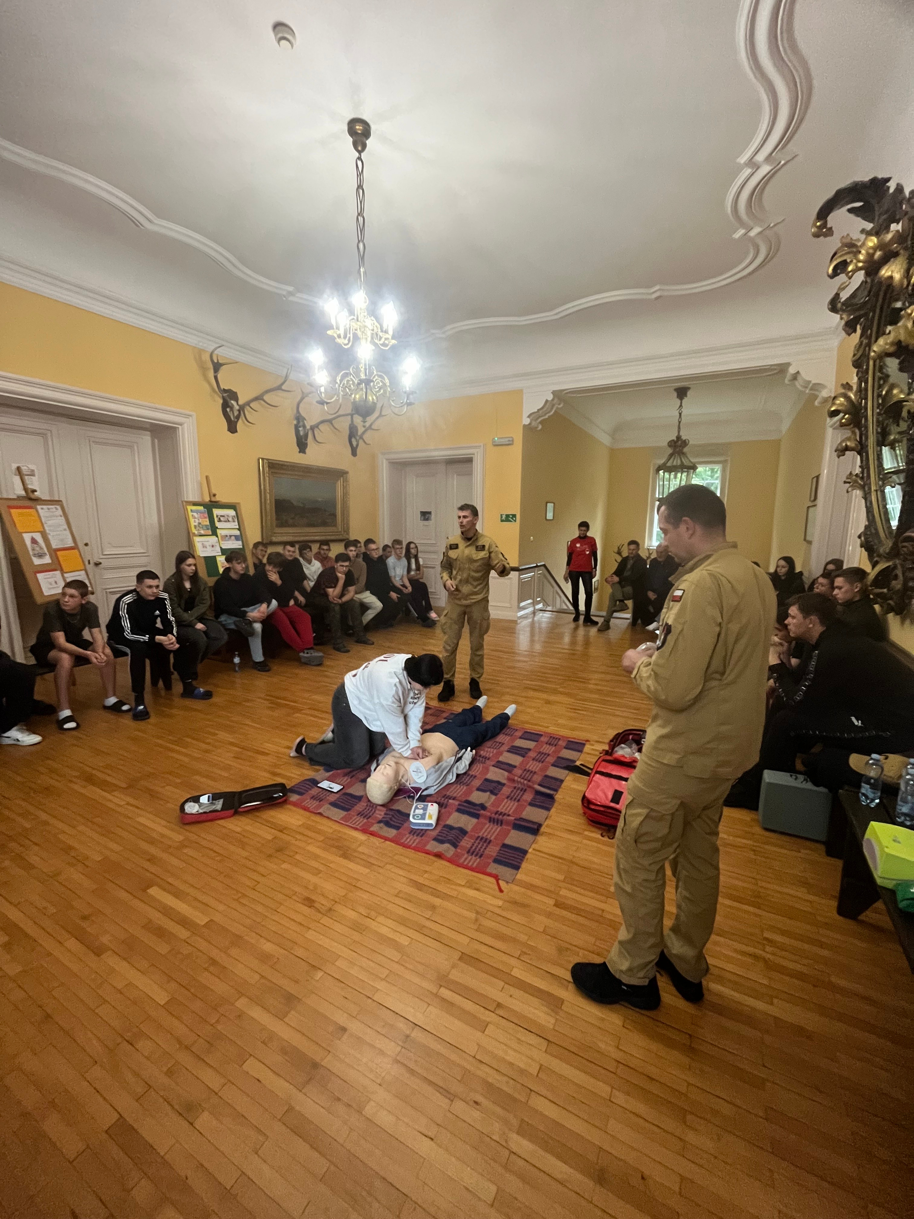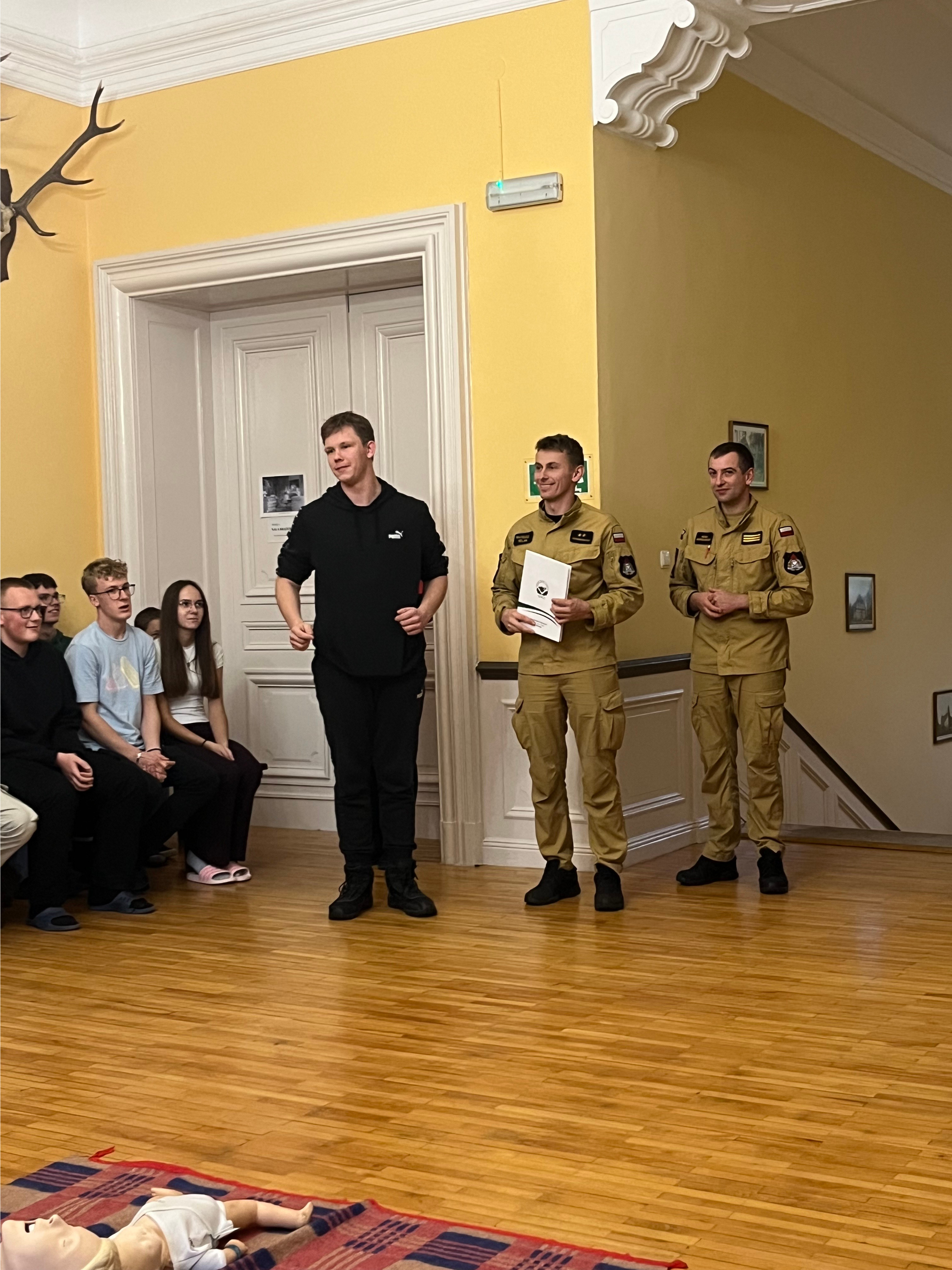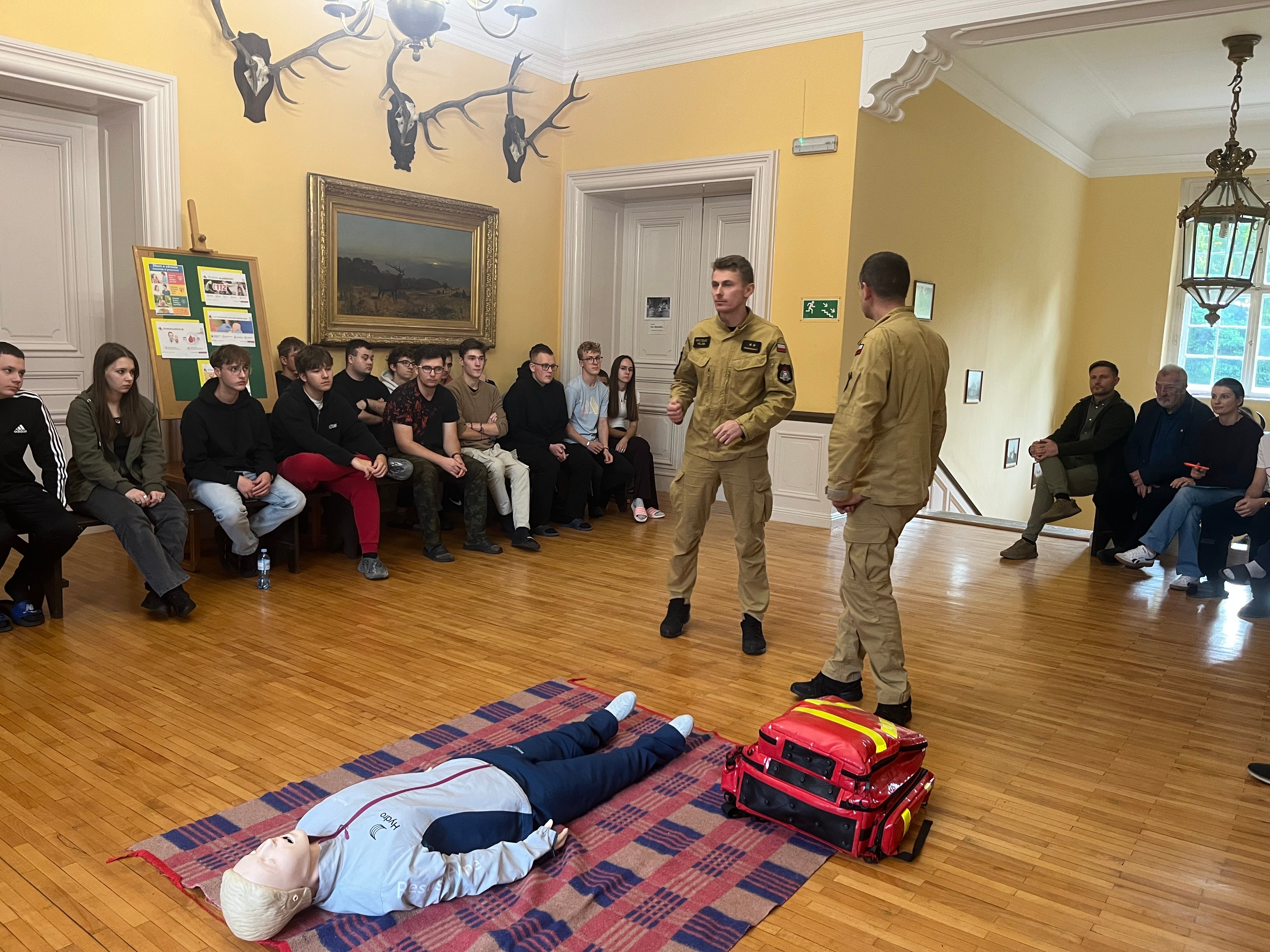 Podczas spotkania strażacy omówili zasady udzielania pierwszej pomocy przedmedycznej, prezentując podstawowe czynności ratujące życie w sytuacjach zagrożenia. Uczestnicy mieli możliwość zapoznania się z prawidłowym sposobem postępowania w przypadku utraty przytomności, zatrzymania krążenia oraz innych nagłych zdarzeń zdrowotnych. Funkcjonariusze opowiedzieli również o codziennych obowiązkach strażaków, przybliżając specyfikę służby w Państwowej Straży Pożarnej oraz pokazali i omówili wykorzystywany sprzęt do ratownictwa medycznego podczas akcji ratowniczo-gaśniczych. Zwrócili także uwagę na to, jak postępować w razie zagrożenia, jak wezwać pomoc oraz co zrobić, aby uniknąć niebezpiecznych sytuacji. Na zakończenie przypomniano wszystkim uczestnikom o obecnych numerach alarmowych 998 i 112, w tym o zasadach prawidłowego zgłaszania zdarzeń, jednocześnie podkreślając jak ważna jest szybka i precyzyjna informacja w sytuacjach kryzysowych.