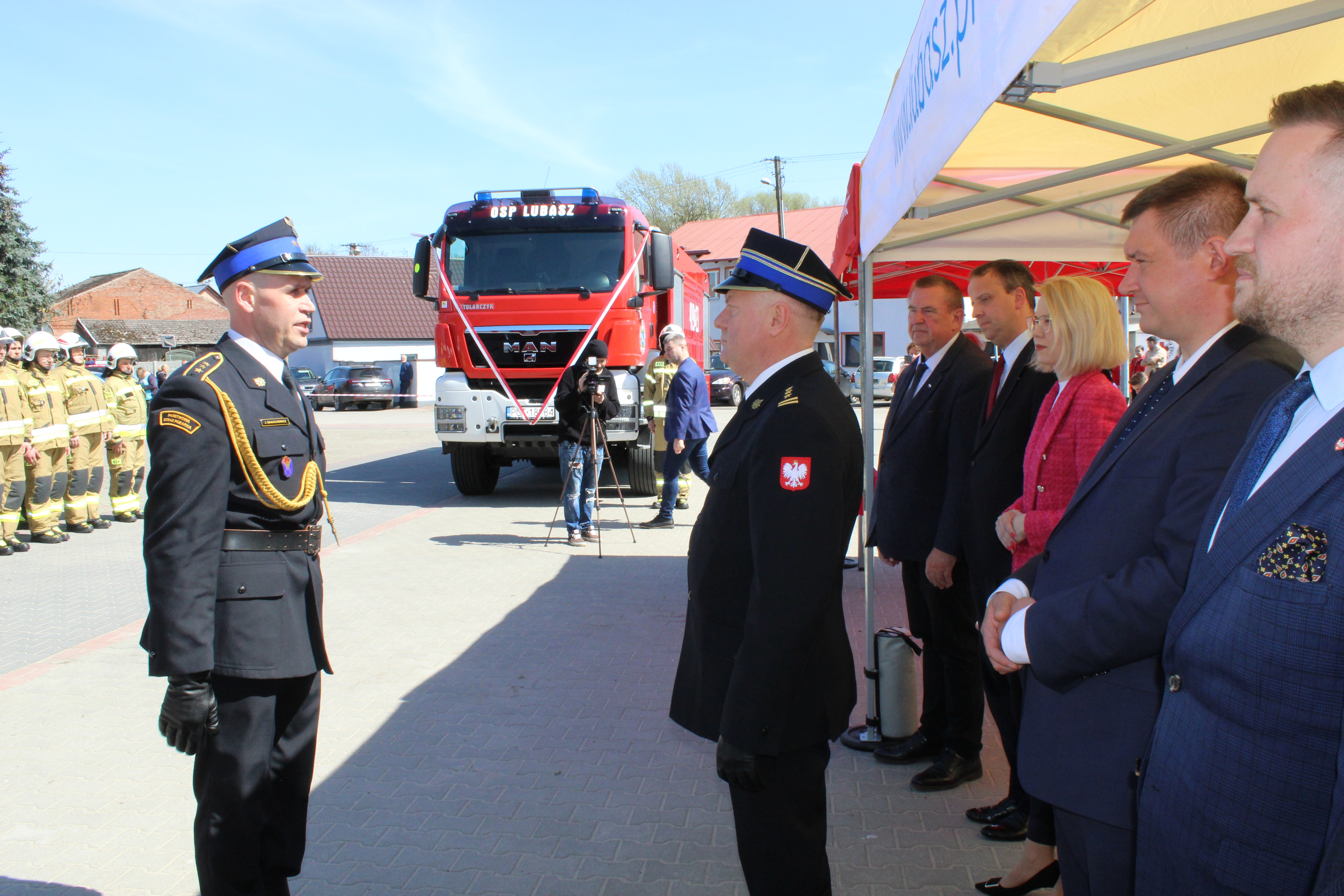 Po powitaniu gości odbyło się oficjalne wręczenie kluczyków oraz dowodu rejestracyjnego samochodu pożarniczego druhom z OSP KSRG w Lubaszu. Przekazania dokonali: