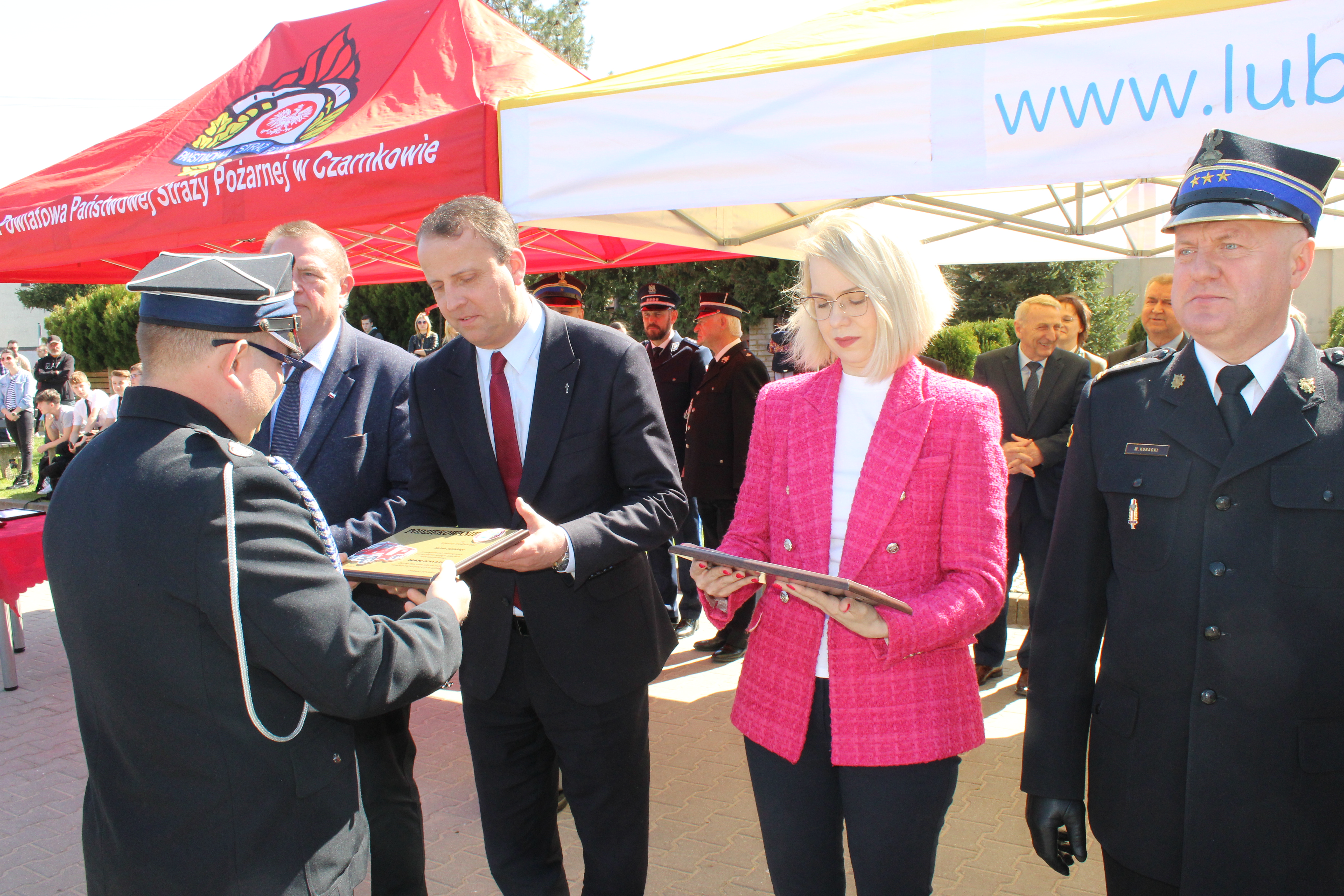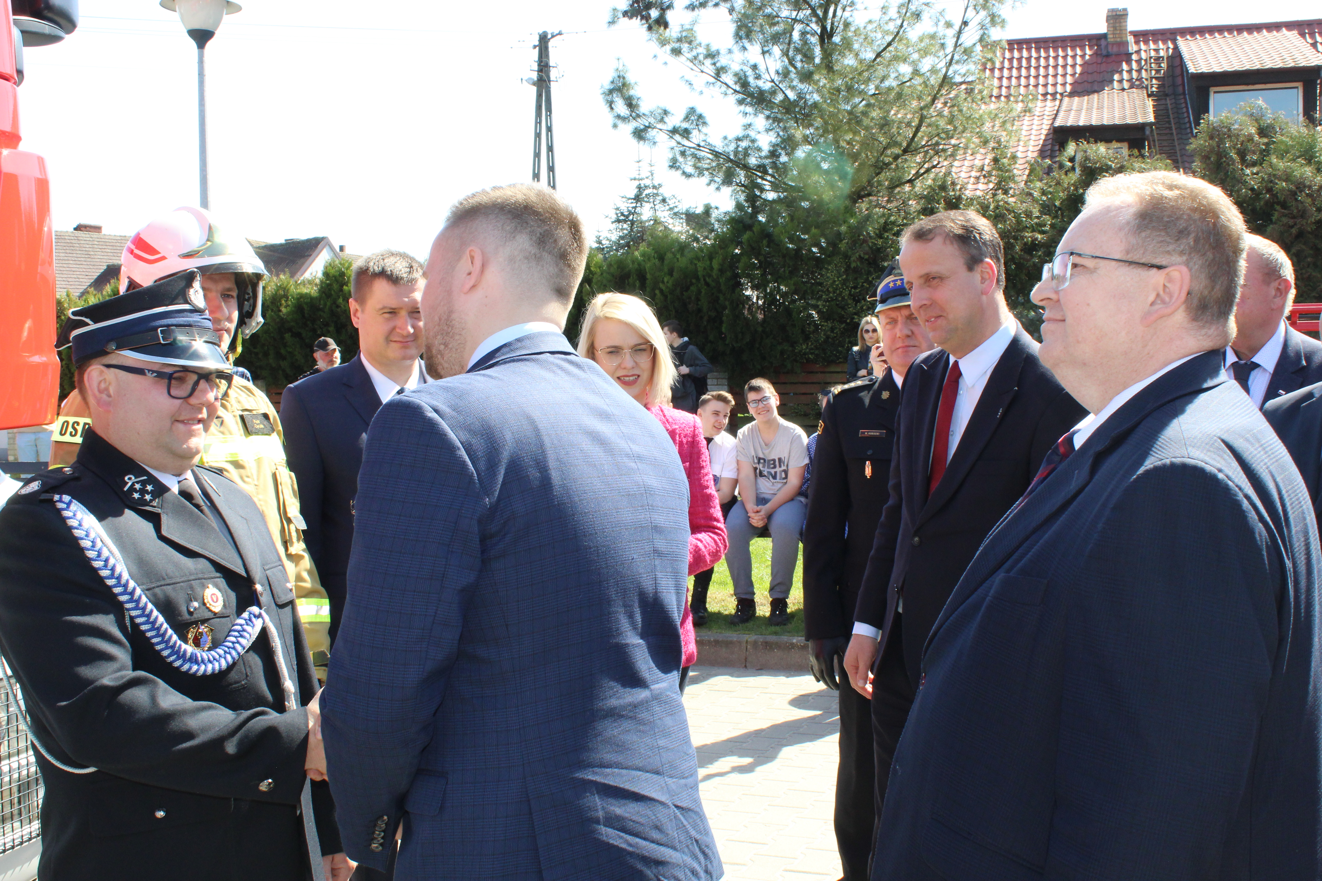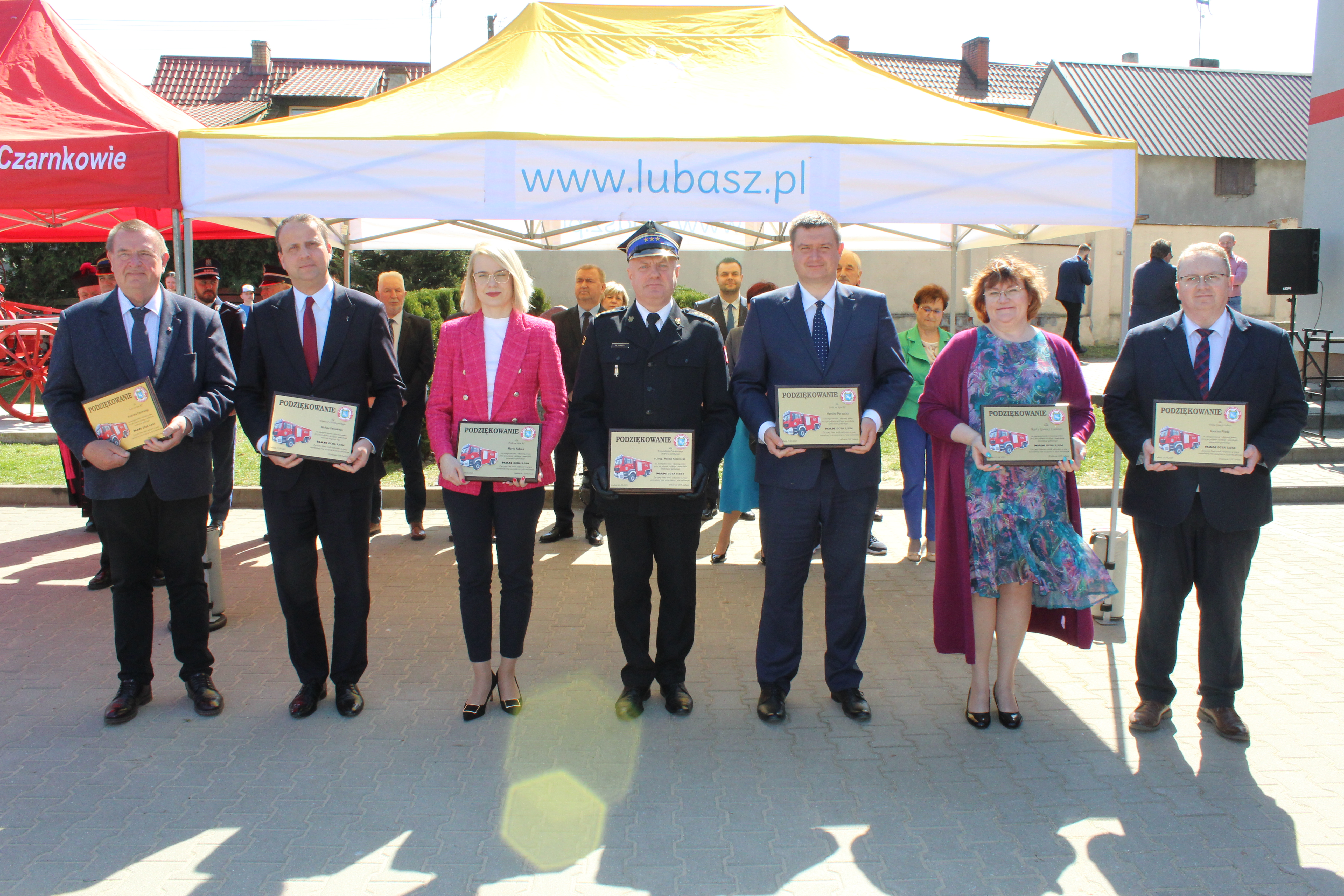 Wojewoda Wielkopolski Pan Michał Zieliński w asyście Komendanta Powiatowego PSP w Czarnkowie st. bryg. Macieja Kubackiego, Pani Poseł Marta Kubiak, Pan Poseł Krzysztof Czarnecki, Pan Poseł Marcin Porzucek, Adam Bogrycewicz – Radny Sejmiku Wielkopolskiego, Członek Zarządu powiatu czarnkowsko-trzcianeckiego Pan Jan Pertek, Wójt Gminy Lubasz Pan Marcin Filoda.