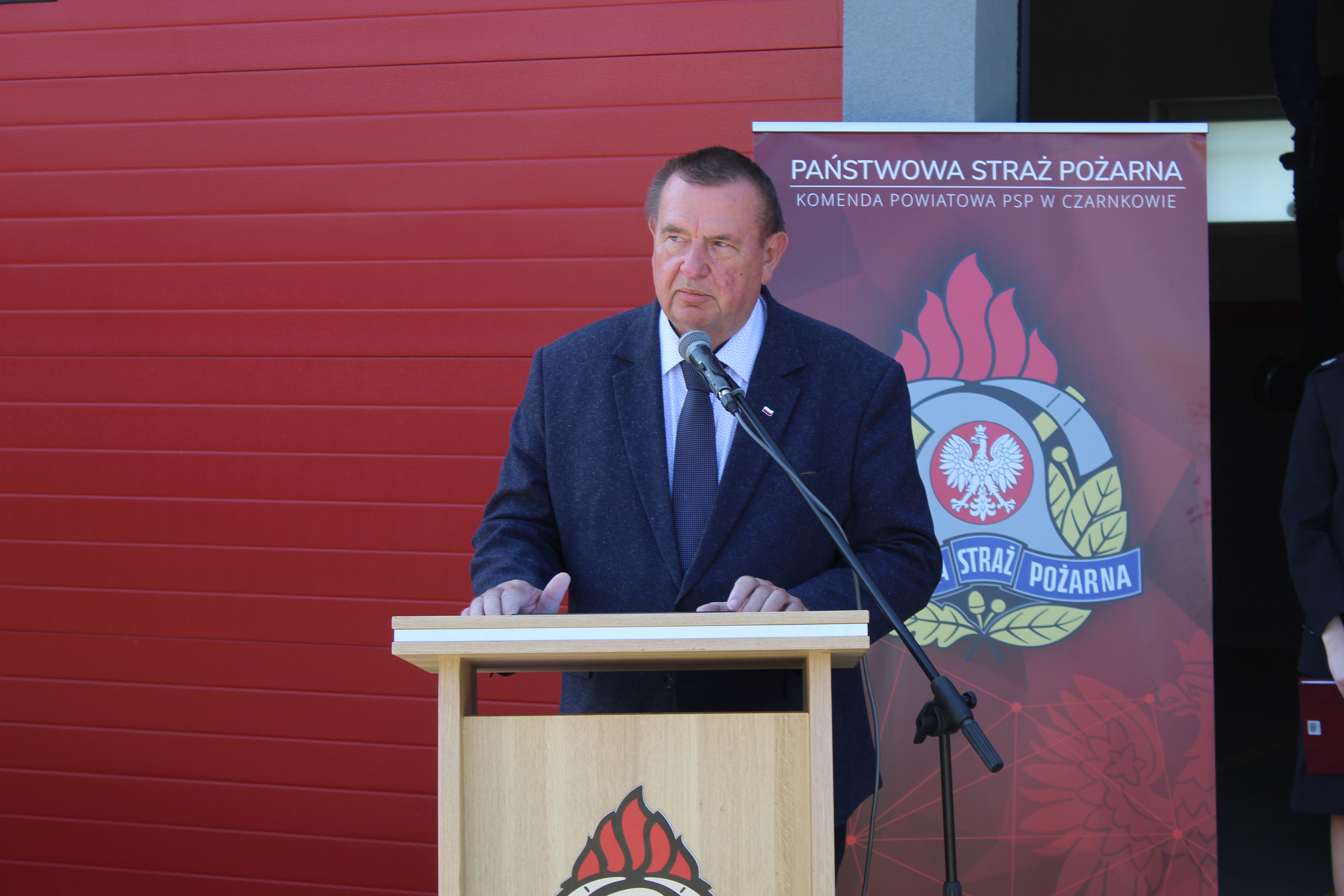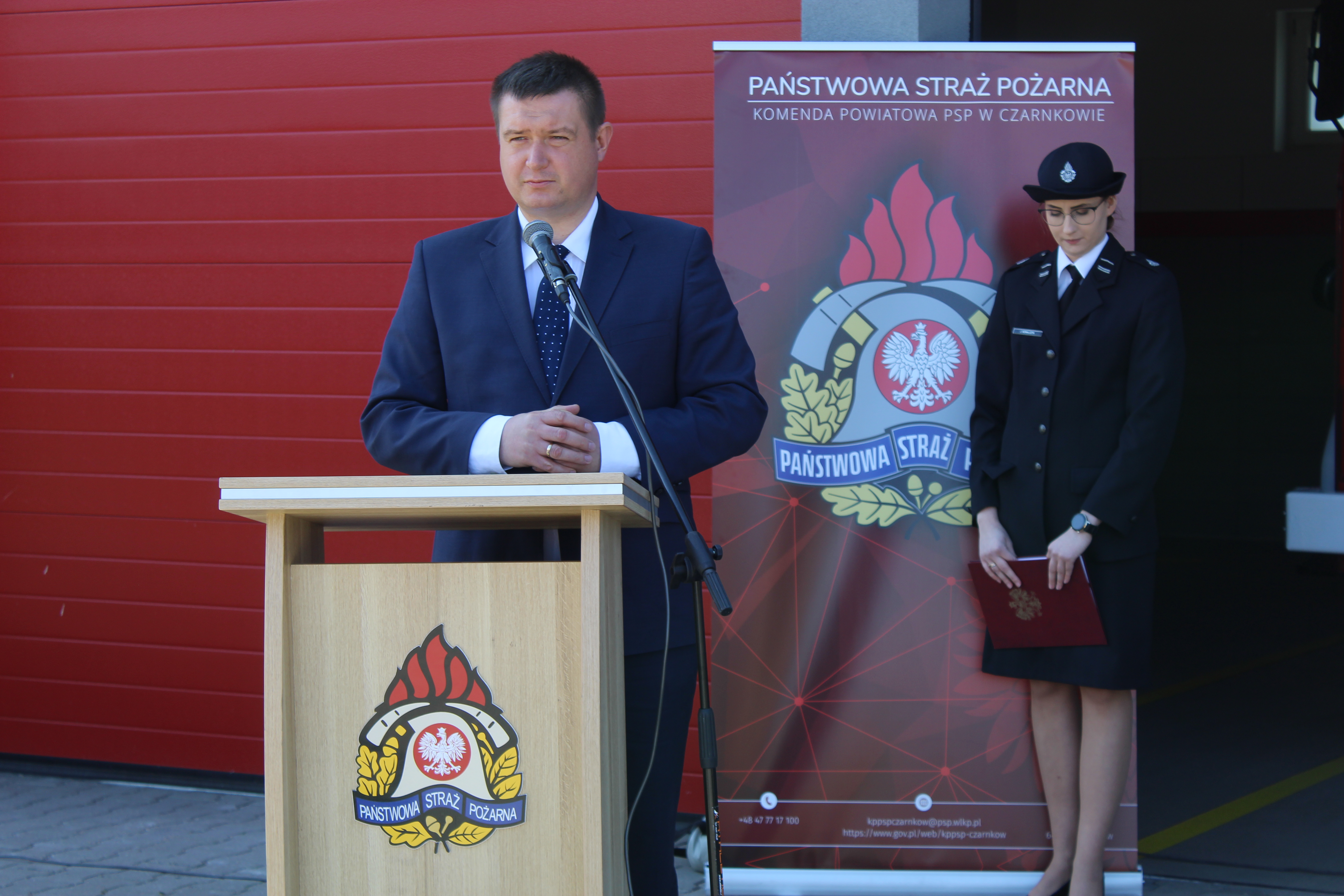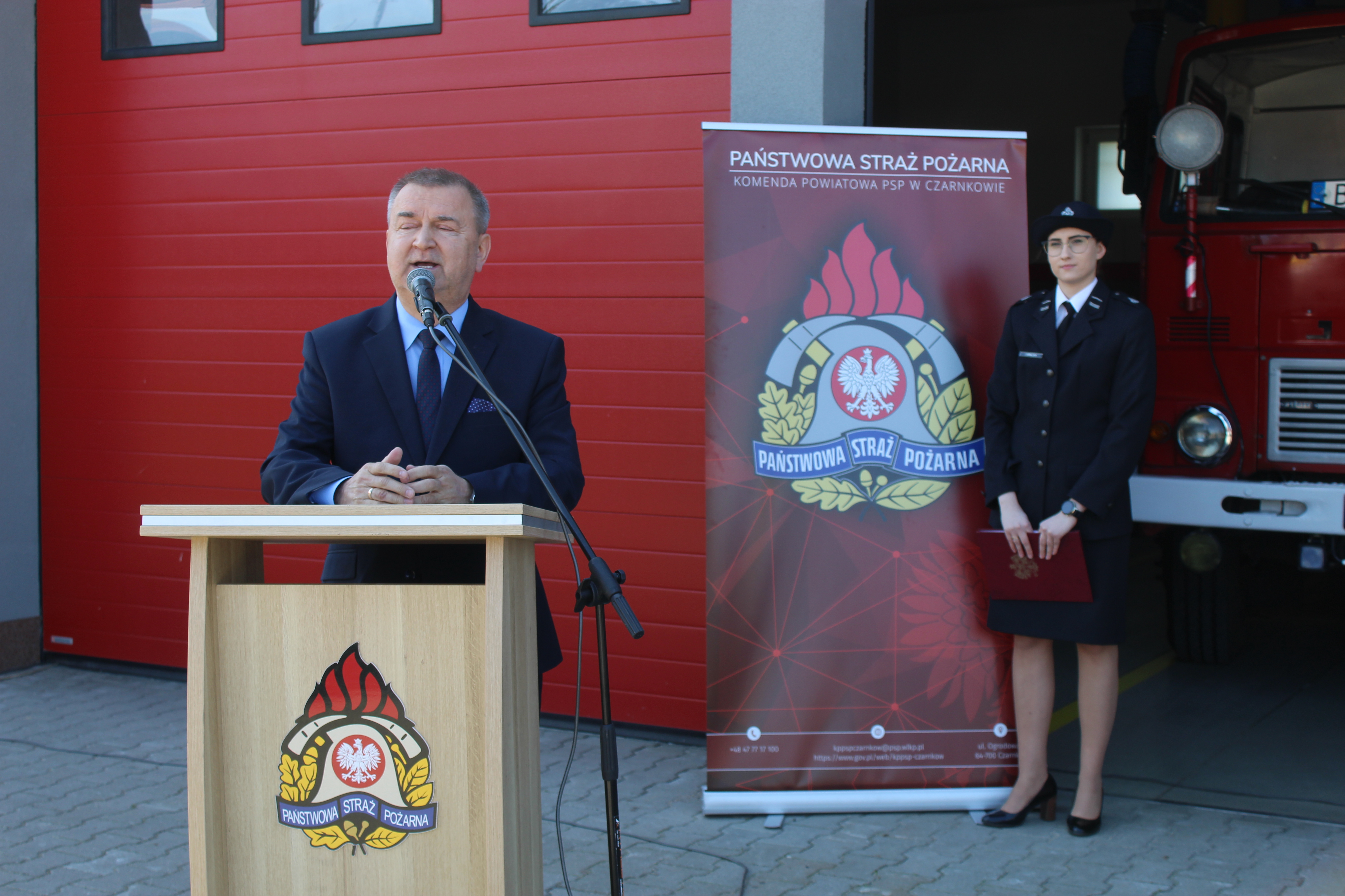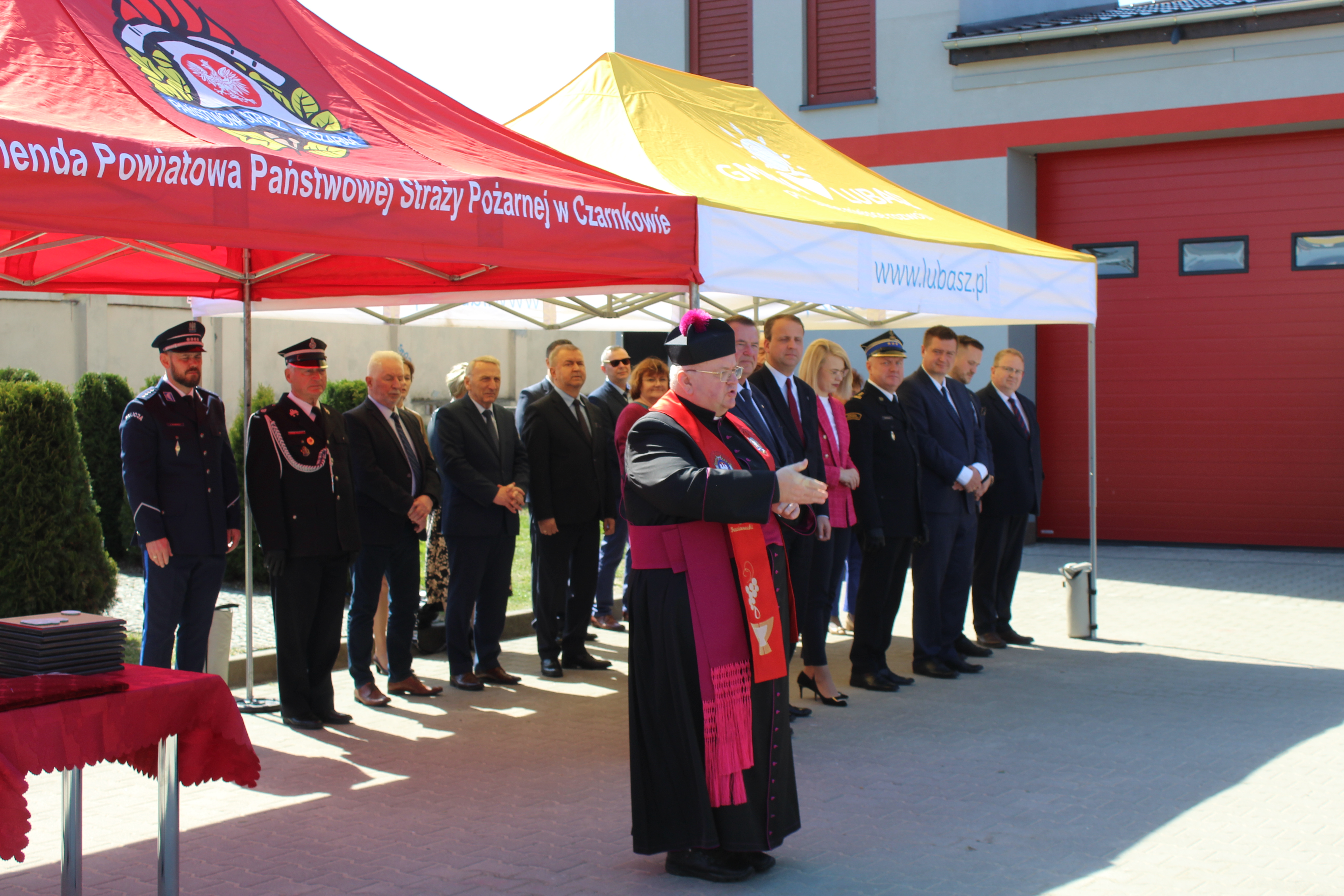 Wojewoda Wielkopolski Pan Michał Zieliński w asyście Komendanta Powiatowego PSP w Czarnkowie st. bryg. Macieja Kubackiego, Pani Poseł Marta Kubiak, Pan Poseł Krzysztof Czarnecki, Pan Poseł Marcin Porzucek, Adam Bogrycewicz – Radny Sejmiku Wielkopolskiego, Członek Zarządu powiatu czarnkowsko-trzcianeckiego Pan Jan Pertek, Wójt Gminy Lubasz Pan Marcin Filoda.