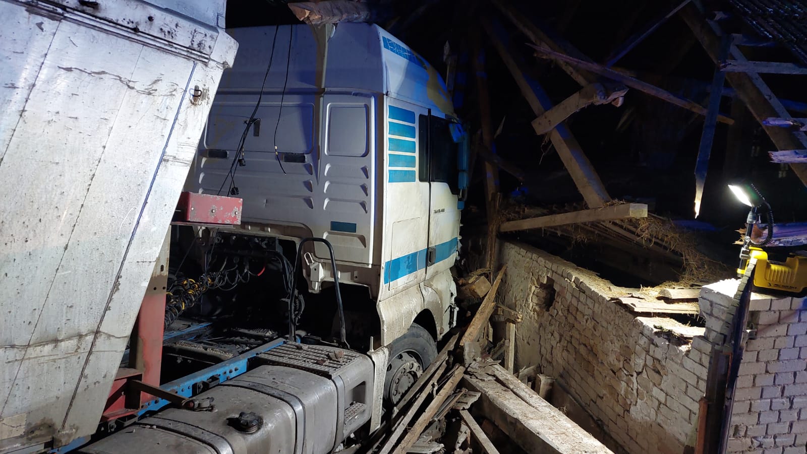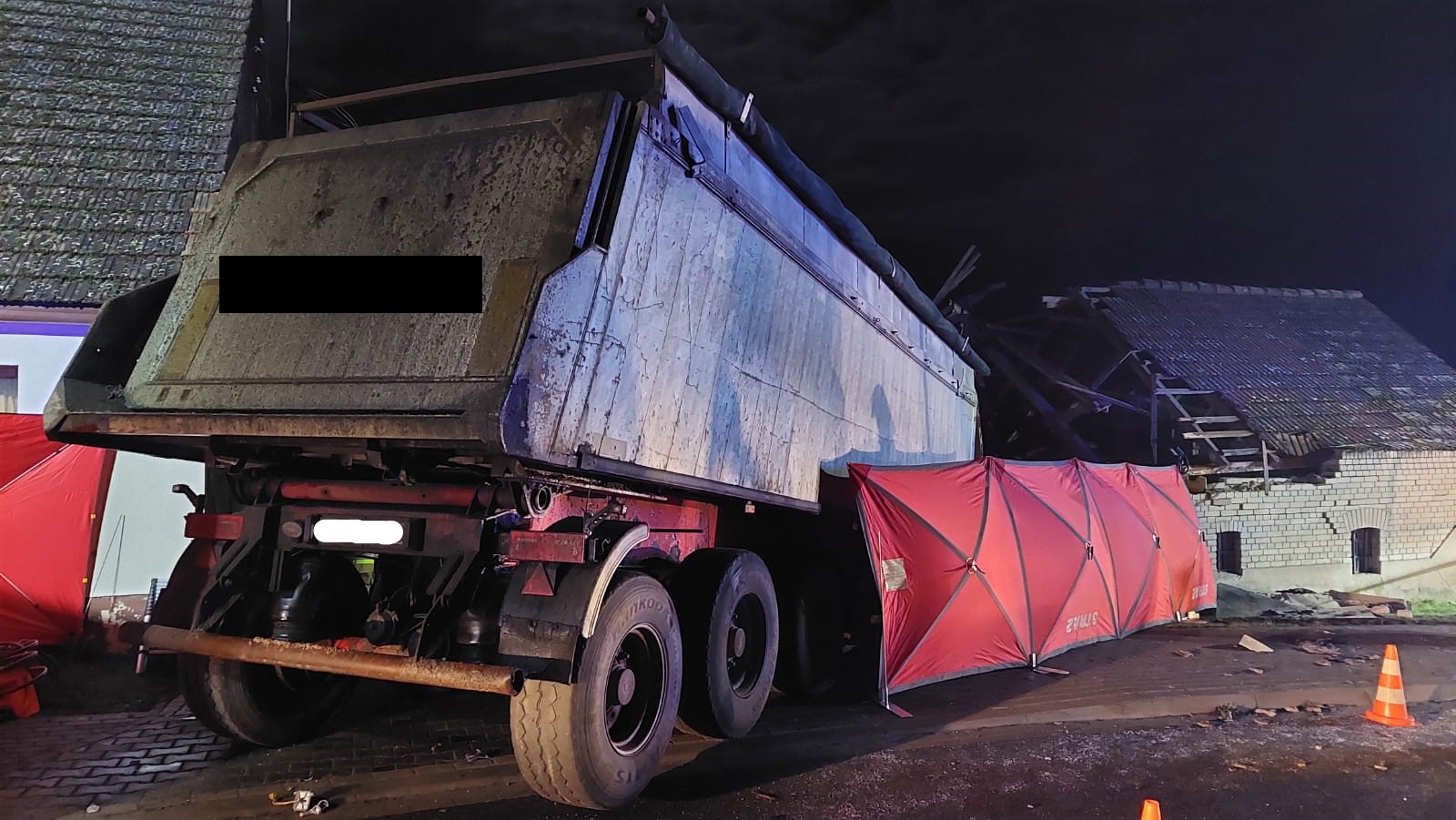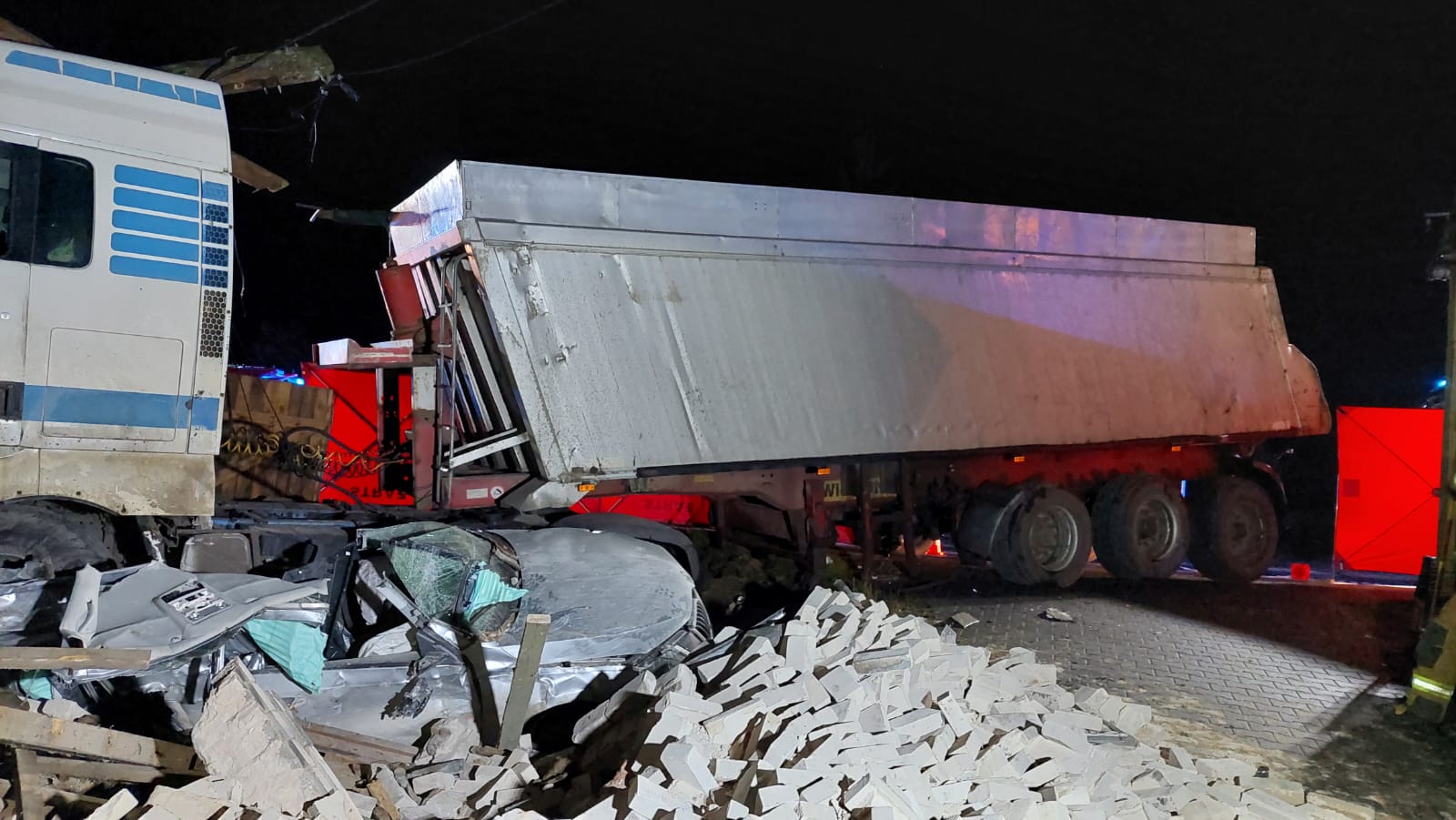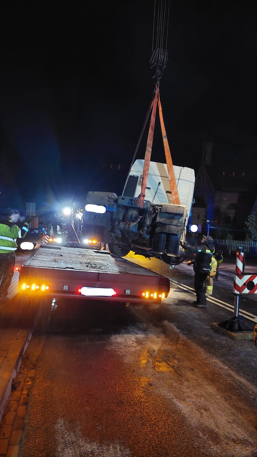 Po zakończeniu działań dochodzeniowych przez przybyłe na miejsce służby przystąpiono do wydobycia z gruzów zawalonego budynku obu pojazdów. Ze względu na znaczny tonaż ciągnika siodłowego i przewożonego ładunku zadanie to zostało zrealizowane przy użyciu ciężkiego pojazdu ratownictwa technicznego z ramieniem ratowniczym, wyciągarkami i ciężkim żurawiem hydraulicznym typu "rotator" oraz specjalistycznego dźwigu o nośności 40 ton.
