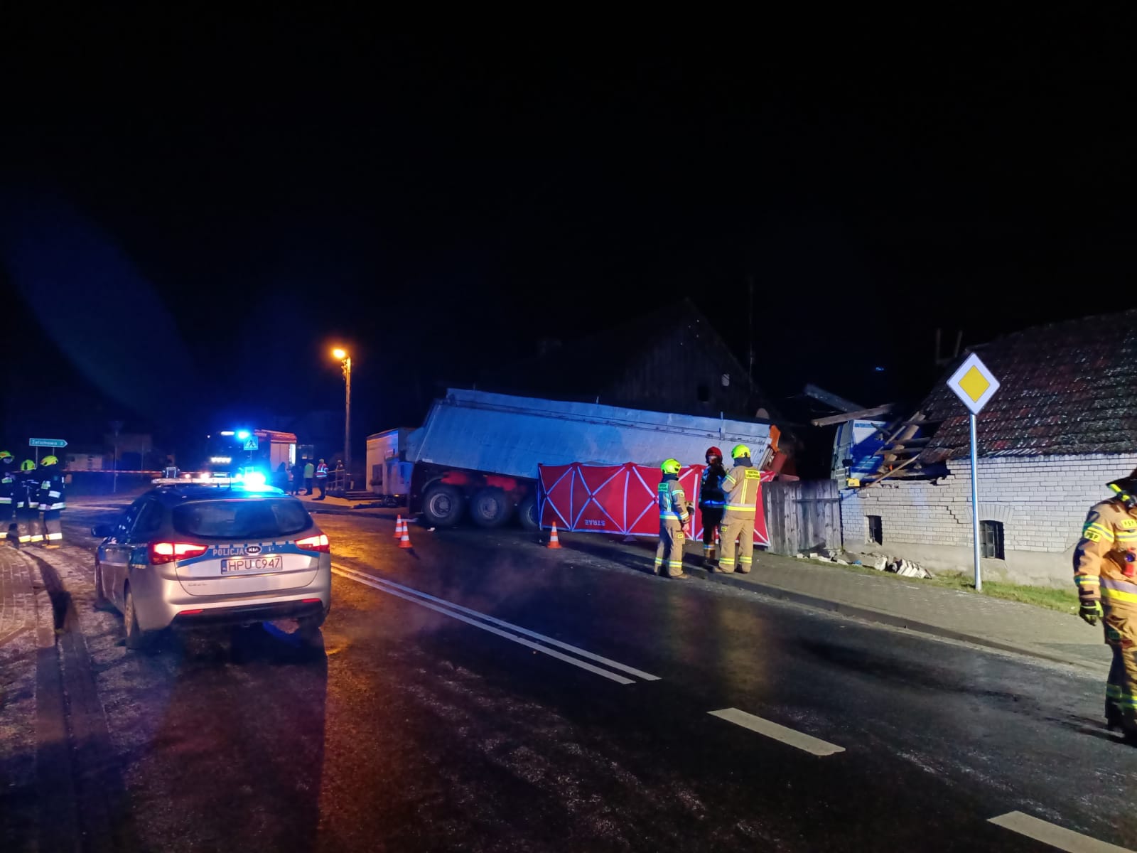 Działania straży pożarnej w pierwszej fazie polegały na zabezpieczeniu miejsca zdarzenia oraz próbie dotarcia do kierującego znajdującego się w pojeździe przygniecionego przez samochód ciężarowy. Niestety przybyły na miejsce Zespół Ratownictwa Medycznego stwierdził zgon przygniecionego mężczyzny.