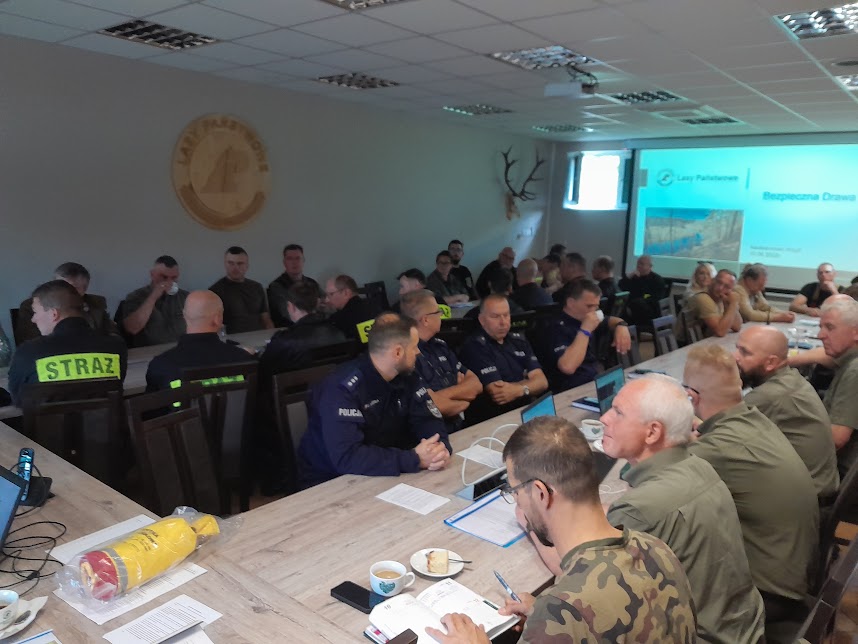 10 czerwca 2022 roku odbyła się V Edycja ćwiczeń na rzece Drawa, organizowanych przez pana Wojciecha Rybarczyka oraz Nadleśnictwo Krzyż. W spotkaniu uczestniczyło około 60 osób z różnych instytucji m.in. przedstawiciele Nadleśnictwa Krzyż, Gusko, Smolarz, Dyrekcji Narodowego Parku Drawieńskiego, Wód Polskich, Komend Powiatowych Policji i Państwowych Straży Pożarnych z Czarnkowa i Strzelec Krajeńskich, WOPR, członkowie Ochotniczych Straży Pożarnych z powiatów czarnkowsko-trzcianeckiego i strzelecko-drezdeneckiego oraz firm kajakowych działających na rzece Drawa. Celem głównym spotkania było omówienie zasad współpracy oraz metod działania między służbami ratowniczymi ościennych powiatów przez, które przepływa rzeka Drawa. Po krótkiej prezentacji na temat zasad bezpieczeństwa oraz dyskusji na ich temat w Nadleśnictwie Krzyż nastąpił czas na praktykę, w tym celu kolumna samochodów przemieściła się do leśnictwa Dębina, gdzie nastąpiło zwodowanie kajaków oraz łodzi. Podczas spływu ratownicy mieli za zadanie podjąć osobę poszkodowaną z wody różnymi technikami oraz udzielić jej Kwalifikowanej Pierwszej Pomocy.