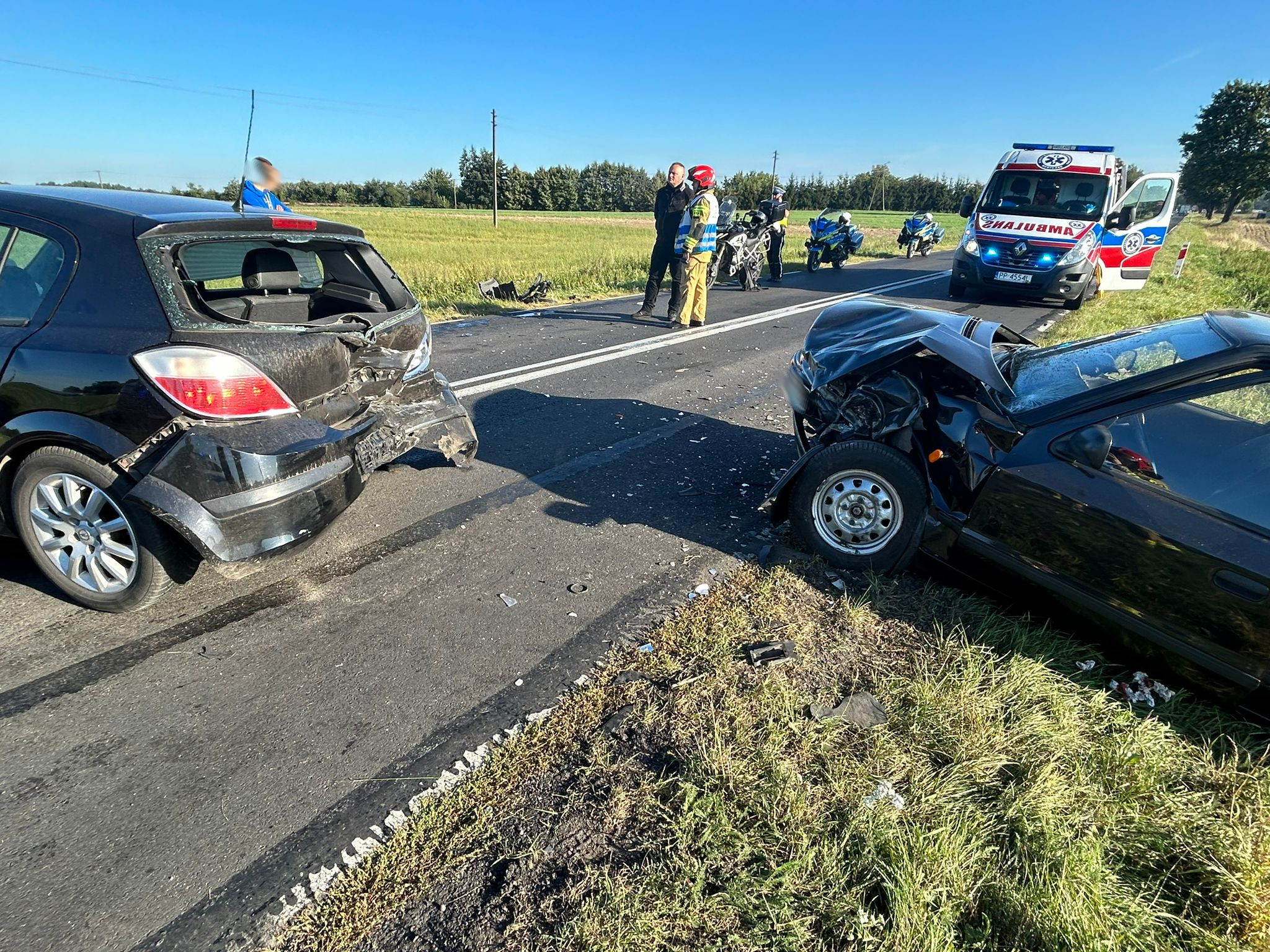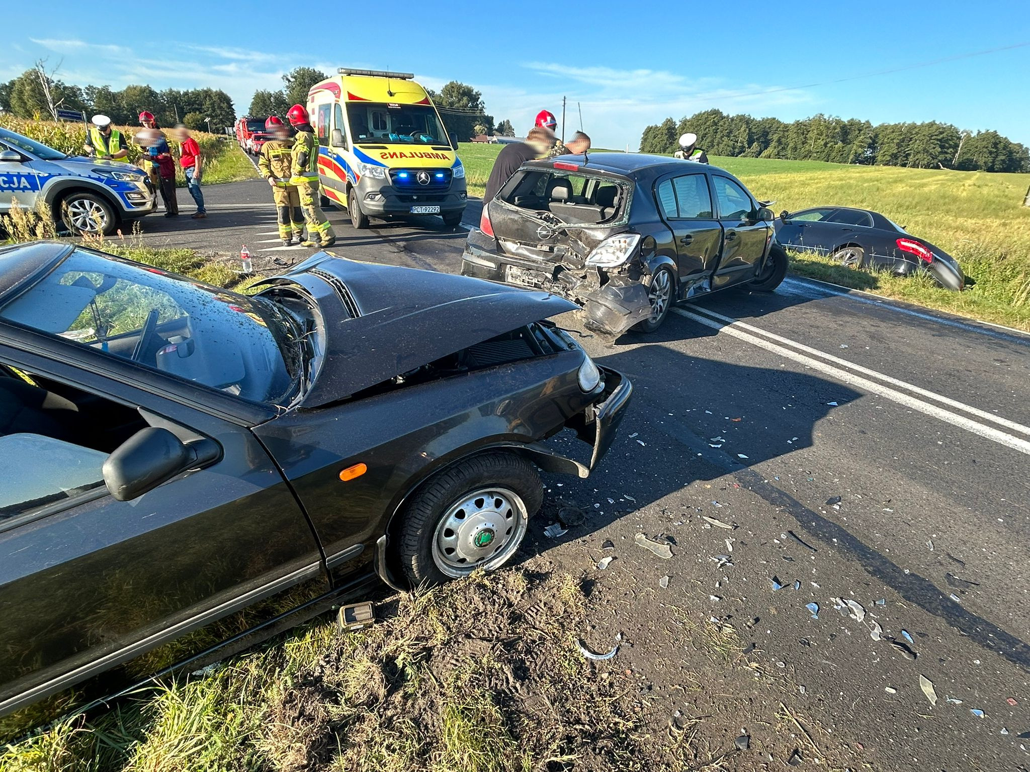 Po przybyciu na miejsce zdarzenia stwierdzono, że pojazdami podróżowało łącznie siedem osób; pięć z nich opuściło auta o własnych siłach przed przybyciem straży pożarnej, dwie osoby podróżujące samochodem marki Skoda pozostały w pojeździe uskarżając się na ból w klatce piersiowej. Działania zastępów straży pożarnej polegały na zabezpieczeniu miejsca zdarzenia, odłączenia zasilania i stabilizacji pojazdów. Jednocześnie ratownicy udzielili kwalifikowanej pierwszej pomocy 7 osobom przed przekazaniem Zespołom Ratownictwa Medycznego z Czarnkowa i Ujścia. Po wykonaniu czynności dochodzeniowych przez policjantów dokonano sorbcji rozlanych płynów eksploatacyjnych i przemieszczono pozostałości powypadkowe z jezdni.