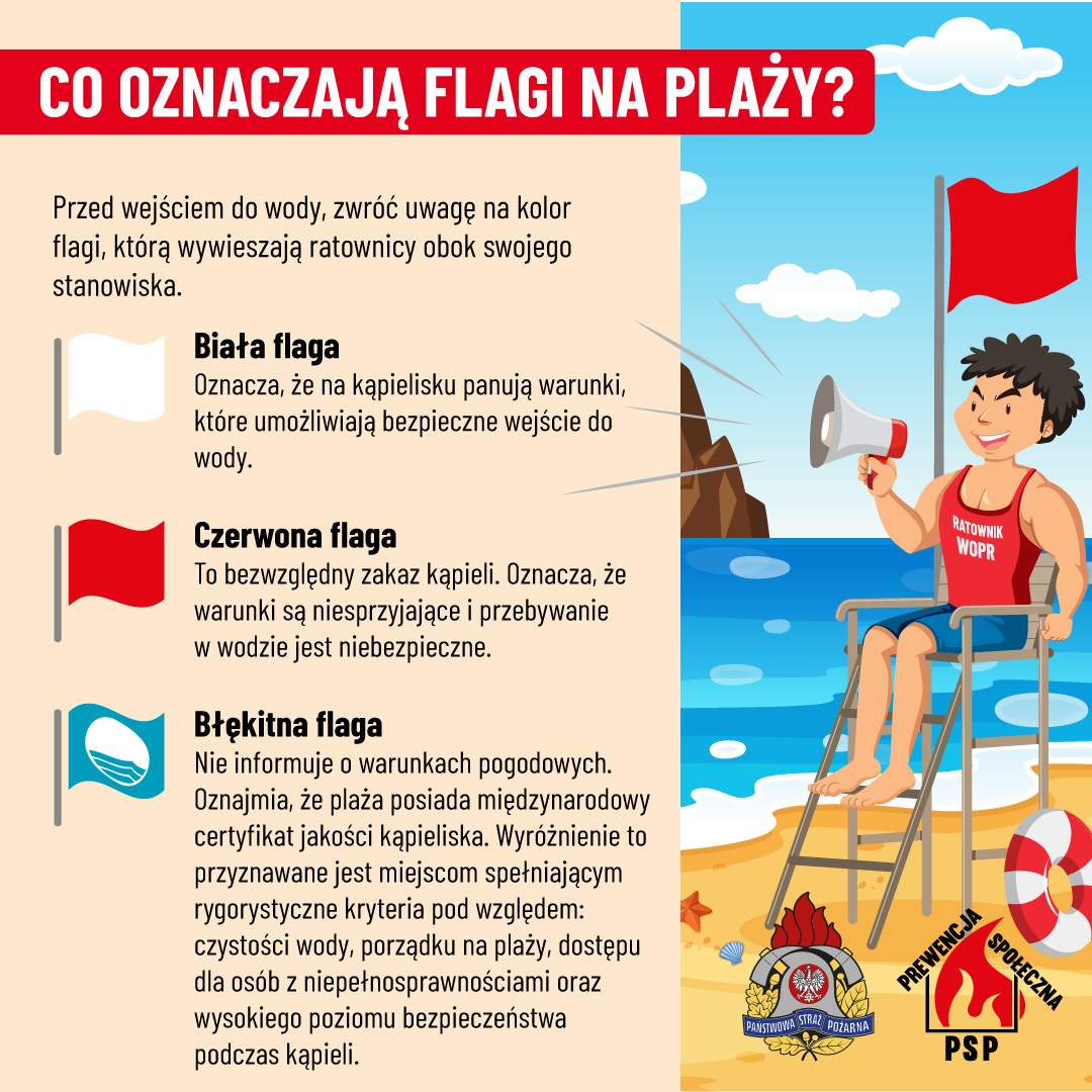 - Dobrze jest znać oznaczenia obowiązujące na kąpielisku: biała flaga – kąpiel dozwolona, czerwona flaga – kąpiel zabroniona, brak flagi – nie ma dyżuru ratowników.
