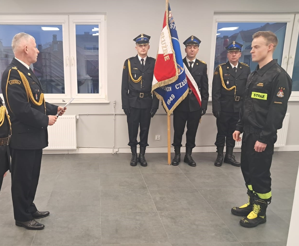 Podczas uroczystej zbiórki w obecności funkcjonariuszy KP PSP w Człuchowie oraz rodziny nowego funkcjonariusza, ślubowanie str. Jaromira Kiedrowicza przyjął Zastępca Komendanta Powiatowego Państwowej Straży Pożarnej w Człuchowie bryg. Dariusz Dwulit.