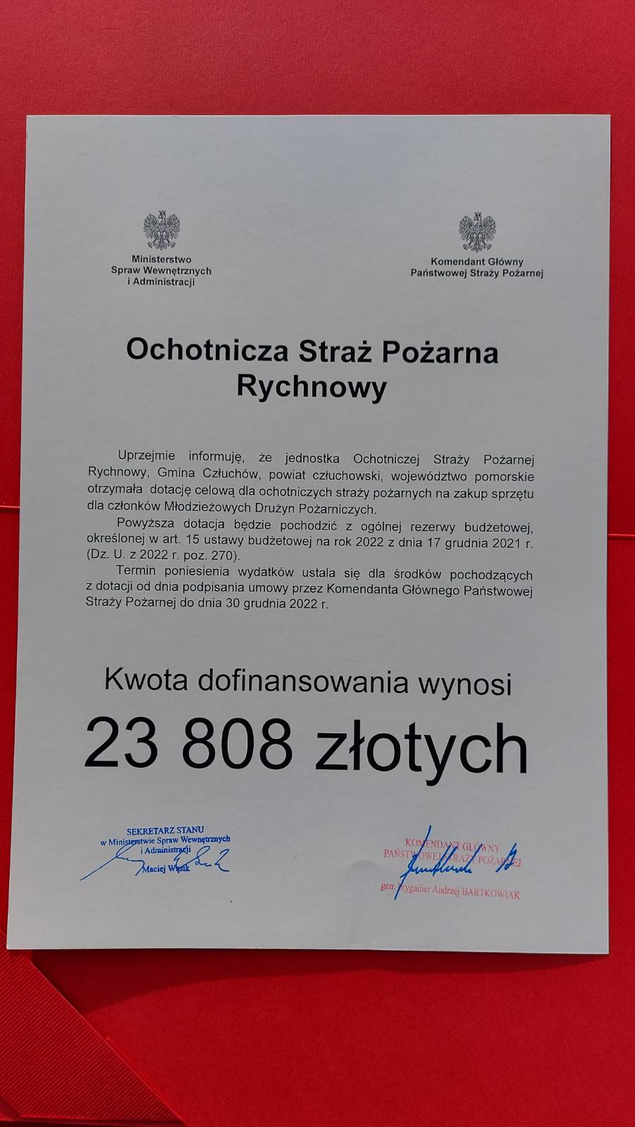 W dniu 29 października 2022 roku, na placu przed remizą Ochotniczej Straży Pożarnej w Tuchomiu o godzinie 11, odbyła się uroczystość wręczenia promes dla Młodzieżowych Drużyn Pożarniczych z powiatu bytowskiego, chojnickiego i człuchowskiego. Środki finansowe trafiły do 54 Jednostek i zostaną przeznaczone na zakup sprzętu, umundurowania i wyposażenia osobistego oraz sprzętu teleinformatycznego wykorzystywanego w procesie szkolenia członków drużyn działających w Ochotniczej Strażach Pożarnych.
