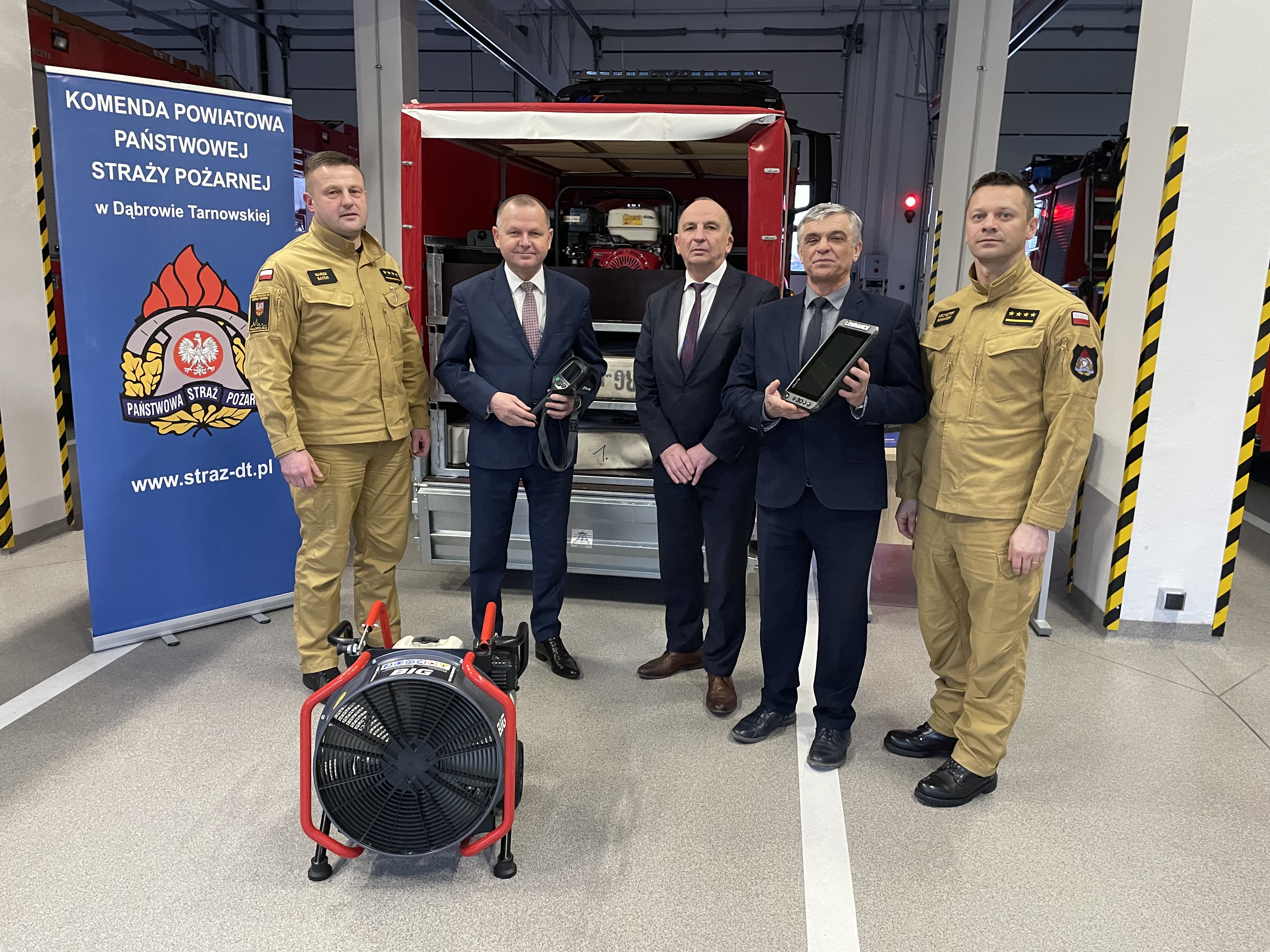 Dzięki wsparciu Starostwa Powiatowego w Dąbrowie Tarnowskiej oraz Gminy Bolesław strażacy z Jednostki Ratowniczo-Gaśniczej w Dąbrowie Tarnowskiej otrzymali nowo zakupiony sprzęt, który będzie wykorzystywany podczas działań ratowniczych. Jest to m.in. kamera termowizyjna, echosonda oraz wentylator oddymiający. Dodatkowo za otrzymane środki finansowe została wykonana zabudowa przyczepki wężowej, która jest niezbędna podczas prowadzenia działań ratowniczo-gaśniczych, gdy zachodzi potrzeba dostarczania wody na duże odległości. W uroczystym przekazaniu udział wziął Starosta Powiatu Pan Lesław Wieczorek wraz z Wicestarostą Krzysztofem Brykiem, Wójt Gminy Bolesław Pan Kazimierz Olearczyk oraz Komendant Powiatowy PSP w Dąbrowie Tarnowskiej st. kpt. Marek Bator wraz z zastępcą st. kpt. Krzysztofem Romańskim. Serdecznie dziękujemy za okazane wsparcie. Zakupiony sprzęt z pewności wpłynie na poprawę bezpieczeństwa mieszkańców powiatu dąbrowskiego.