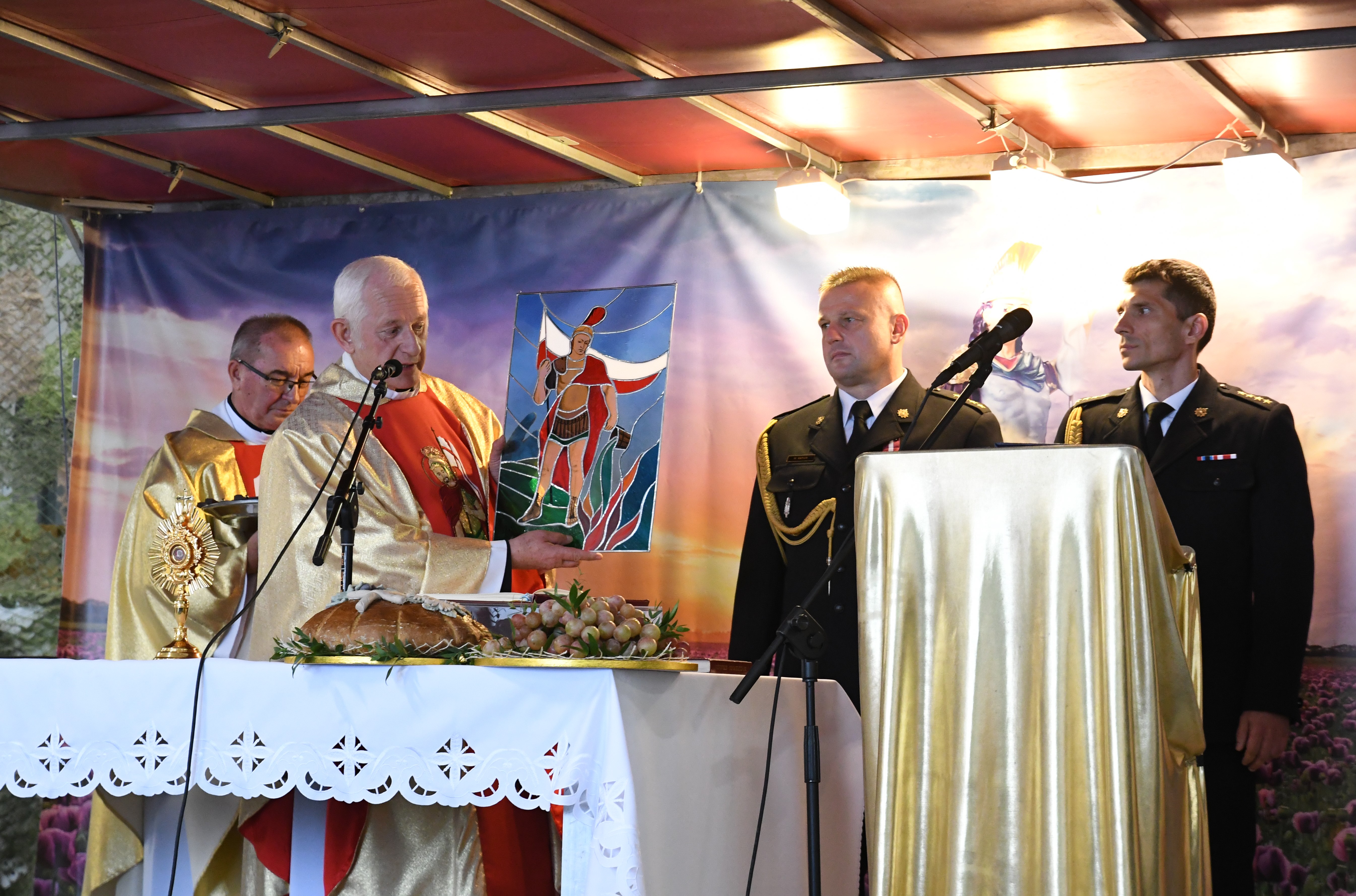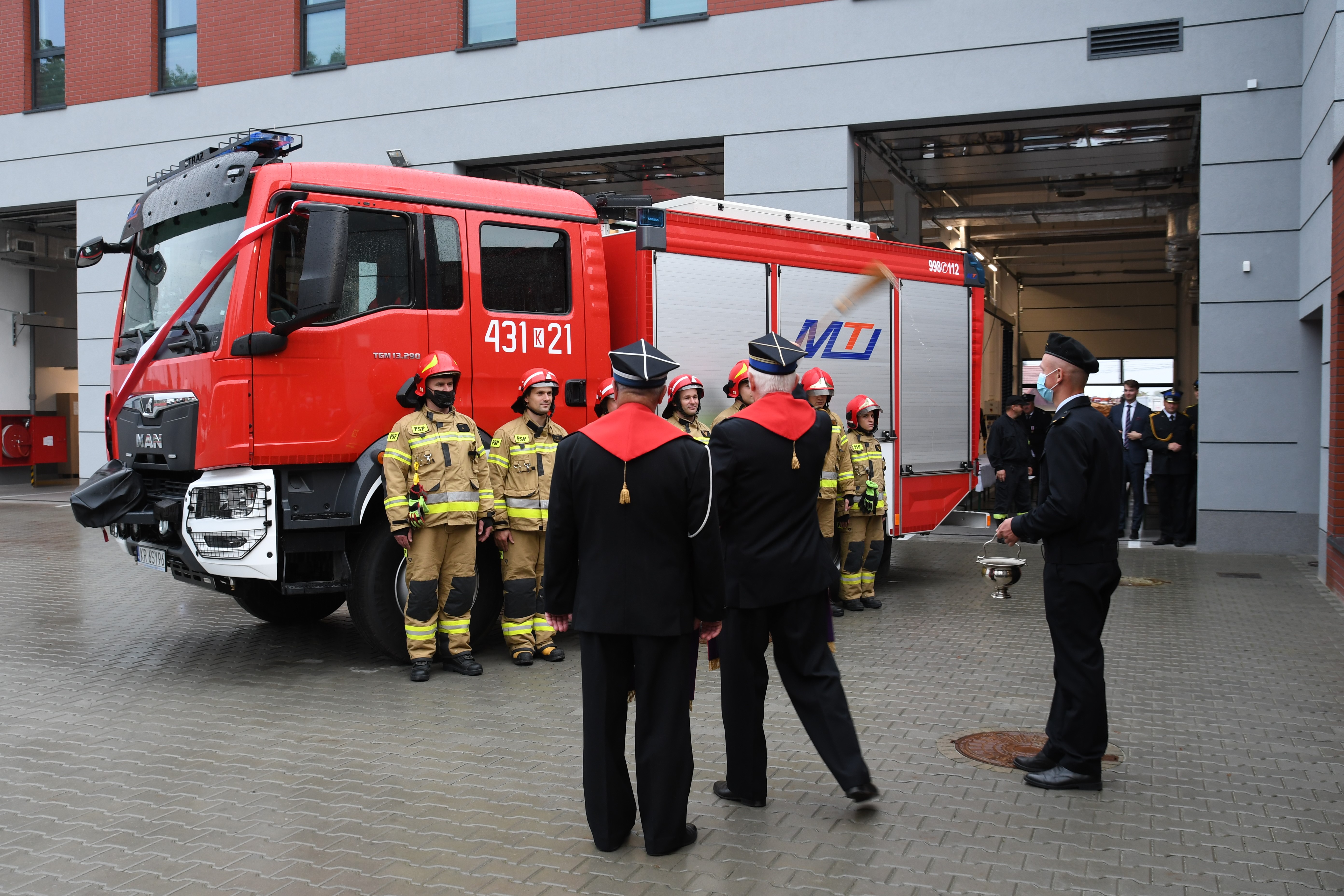 Po zakończonych aktach przekazania, kapelan małopolskich strażaków wraz z kapelanem powiatowym dokonali poświęcenia strażnicy i nowych samochodów.