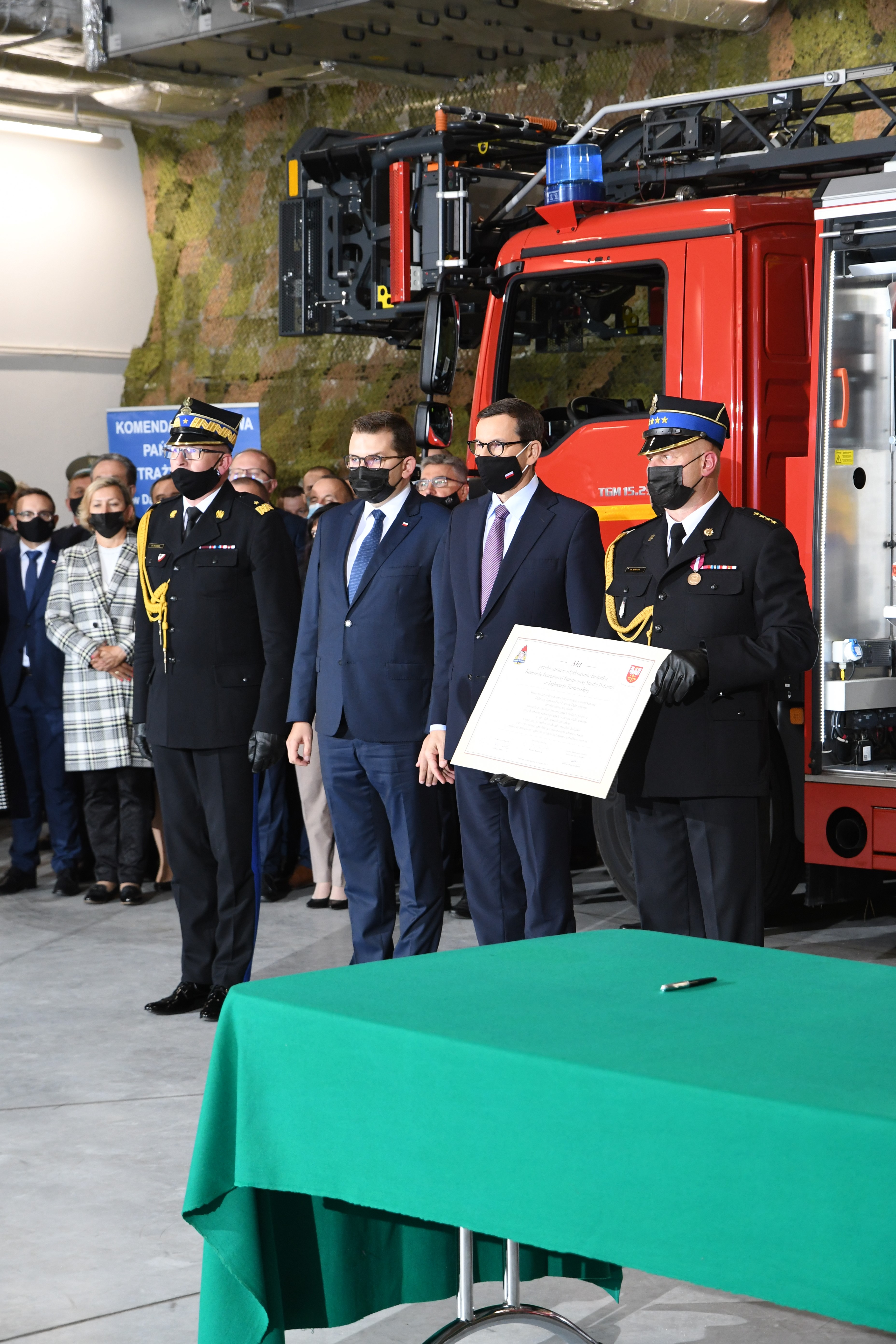 Uroczystość oddania nowej strażnicy była również doskonałą okazją do oficjalnego przekazania nowego samochodu ratowniczo – gaśniczego (GBA) i specjalnego (SD30) dla dąbrowskich strażaków. Pojazdy zostały zakupione w 2021 r. w ramach projektów „Usprawnienie systemu ratownictwa na drogach oraz „Zwiększenie skuteczności prowadzenia długotrwałych akcji ratowniczych” w Programie Infrastruktura i Środowisko.
