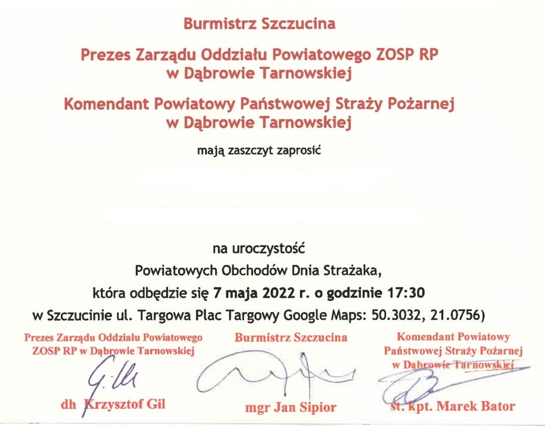 Serdecznie zapraszamy mieszkańców powiatu dąbrowskiego, strażaków, druhów Ochotniczych Straży Pożarnych oraz sympatyków pożarnictwa, na Powiatowe Obchody Dnia Strażaka, które odbędą się w dniu 7 maja 2022 r. w Szczucinie.