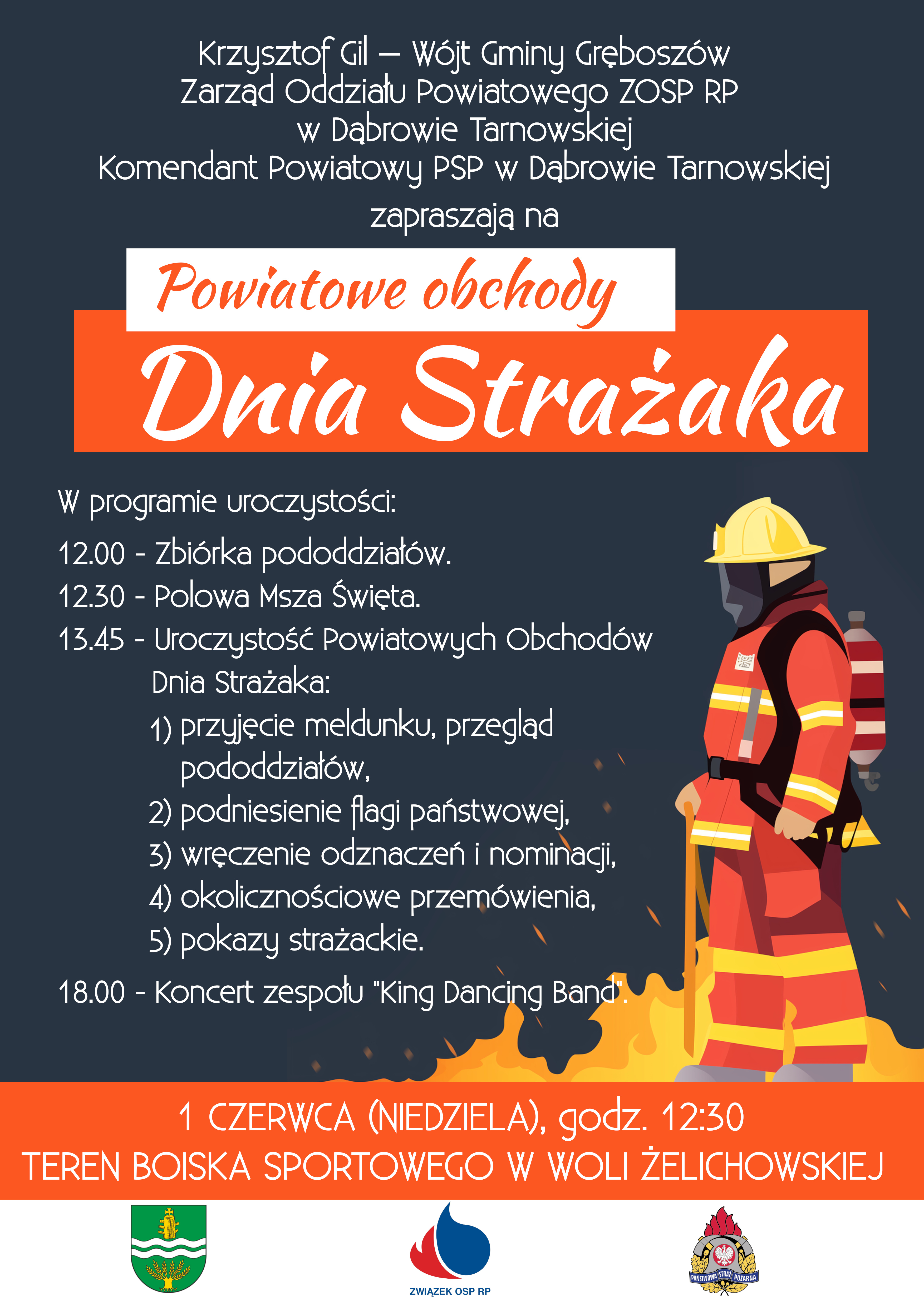 Komendant Powiatowy Państwowej Straży Pożarnej w Dąbrowie Tarnowskiej wraz z Zarządem Oddziału Powiatowego ZOSP RP w Dąbrowie Tarnowskiej oraz Wójtem Gminy Gręboszów zapraszają na Powiatowe Obchody Dnia Strażaka, które odbędą się w dniu 1 czerwca (niedziela) 2025 r. godz. 12:30. Boisko Sportowe w Woli Żelichowskiej.