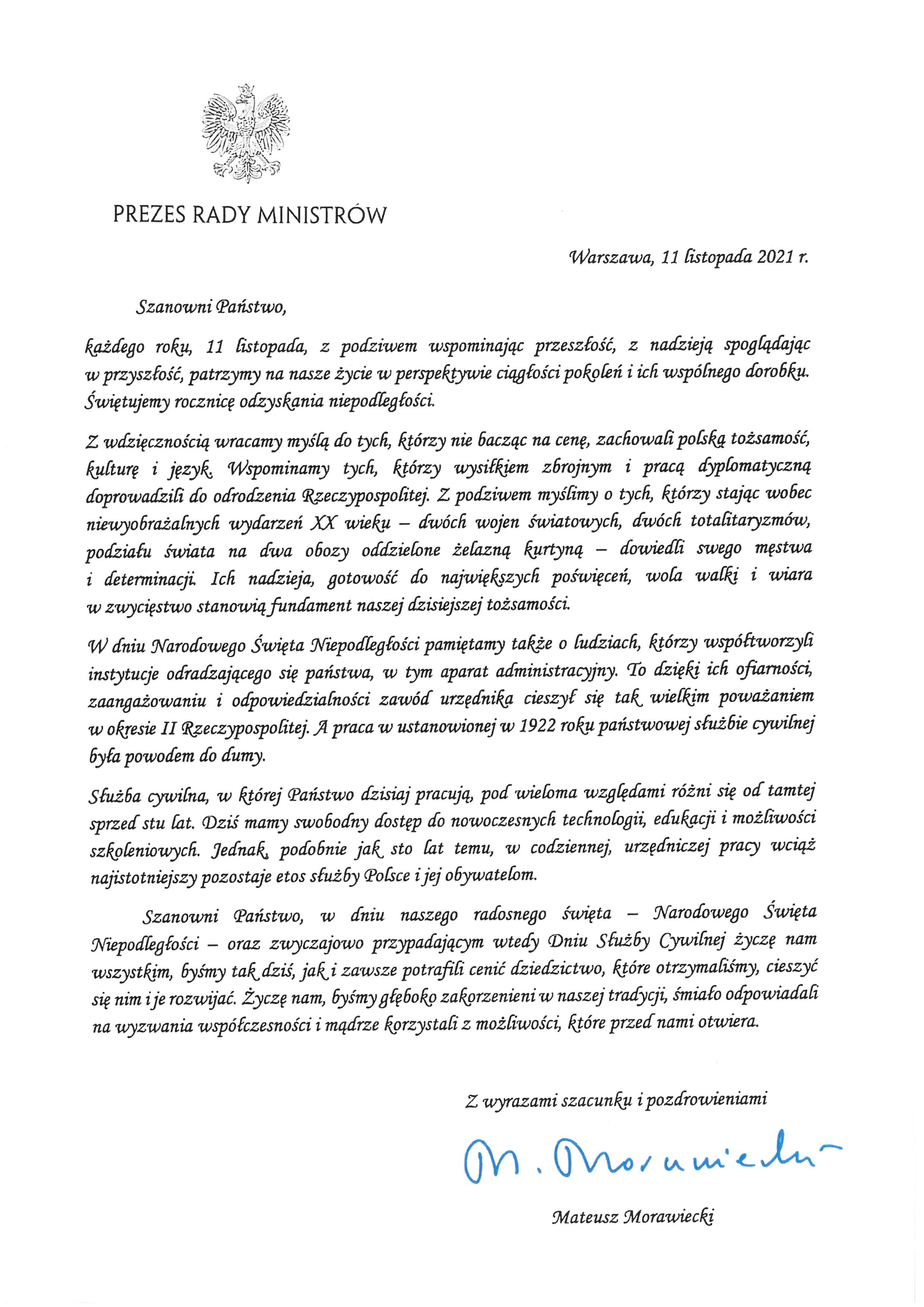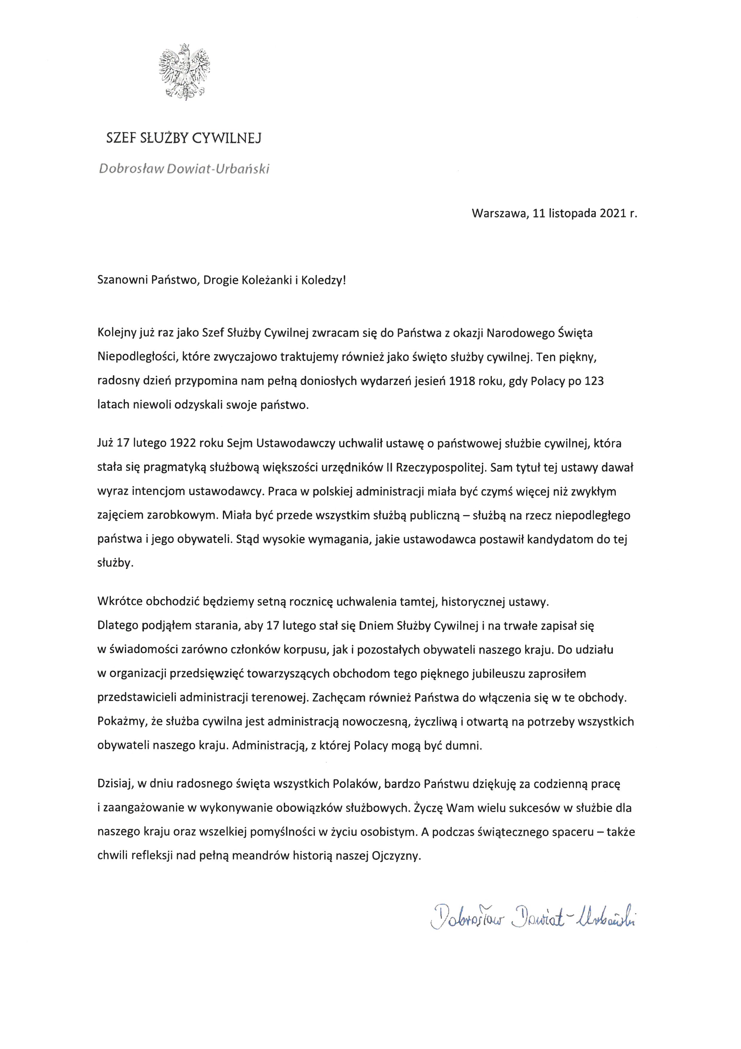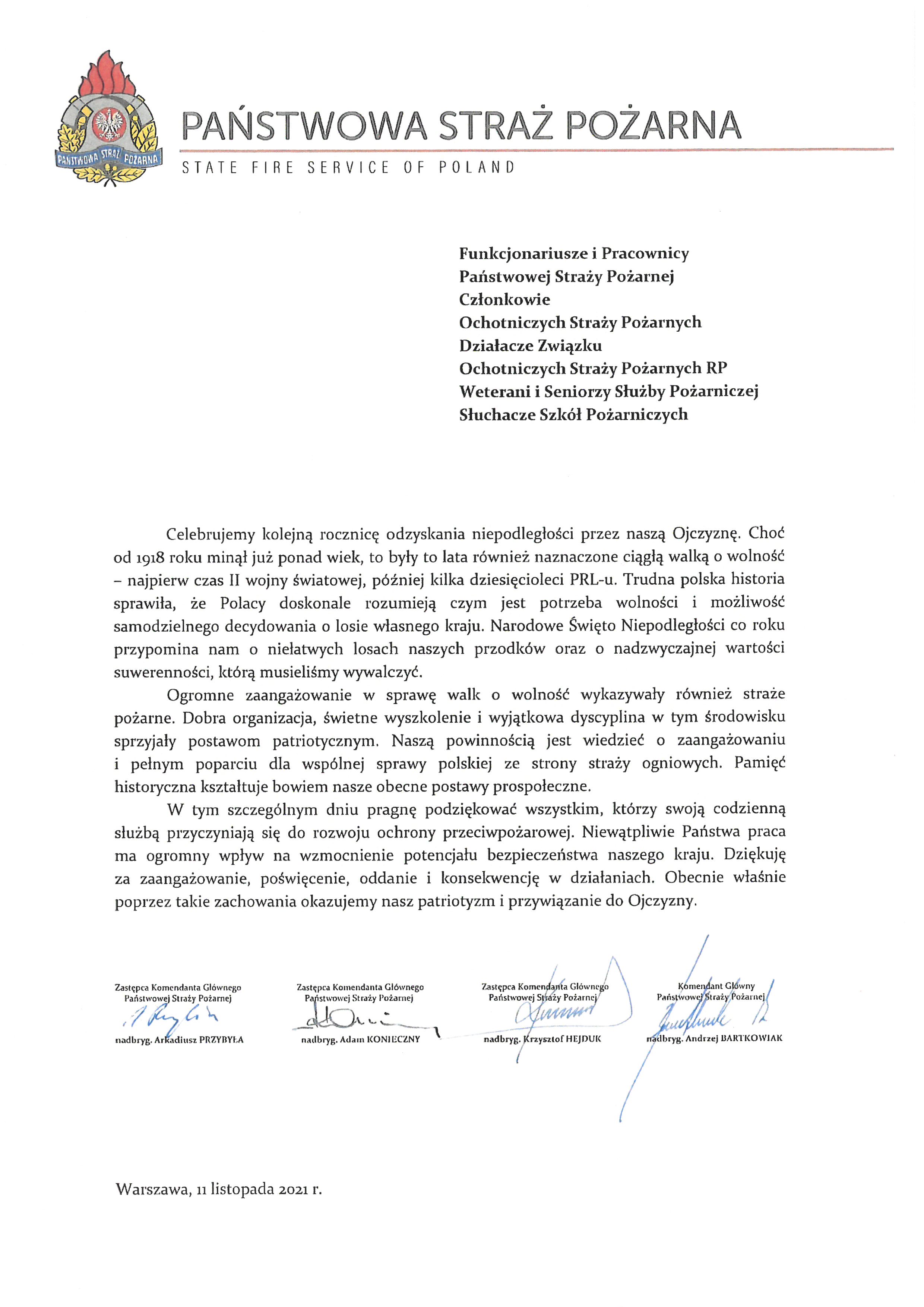 Z okazji Narodowego Święta Niepodległości listy do funkcjonariuszy Państwowej Straży Pożarnej oraz pracowników Korpusu Służby Cywilnej wystosowali: prezes Rady Ministrów Mateusz Morawiecki, Szef Służby Cywilnej Dobrosław Dowiat - Urbański oraz Kierownictwo Komendy Głównej PSP.
