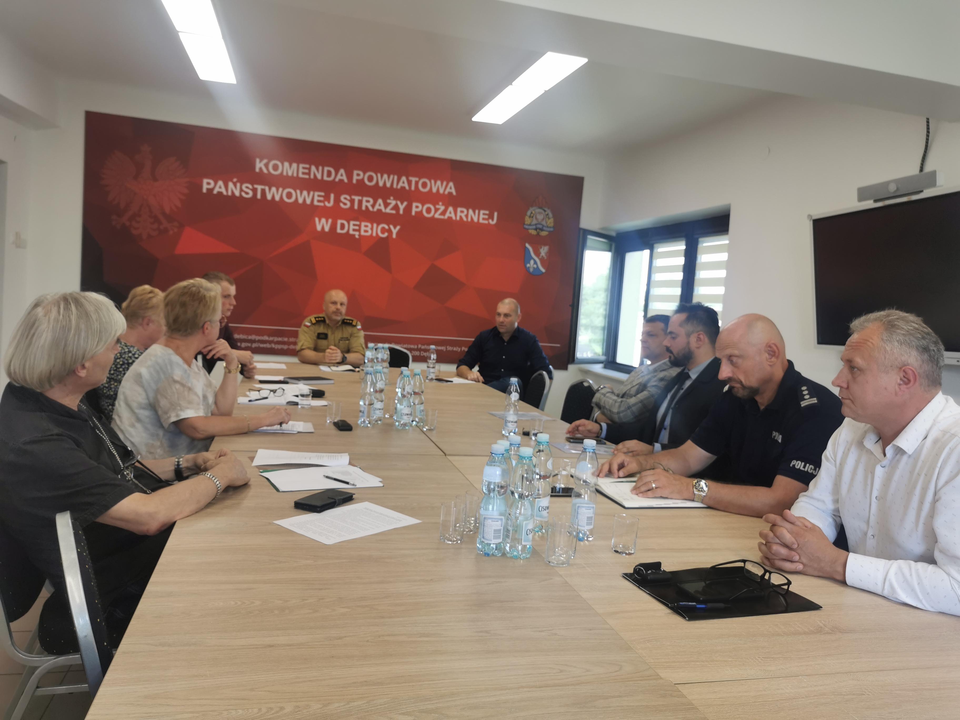 21.06.2024 r. w siedzibie Komendy Powiatowej PSP w Dębicy miało miejsce spotkanie poświęcone omówieniu prognozowanej sytuacji meteorologiczno-hydrologicznej wskazującej na powstanie bardzo silnego frontu burzowego. Przez teren naszego powiatu może przemieszczać się strefa aktywnych burz z ulewnymi opadami deszczu oraz bardzo silne porywy wiatru mogące powodować straty i szkody w infrastrukturze oraz dobytku i mieniu mieszkańców. W spotkaniu uczestniczyli Starosta powiatu dębickiego, Komendant Powiatowy PSP w Dębicy, Komendant Powiatowy Policji w Dębicy oraz przedstawiciele samorządów z terenu powiatu. W trakcie spotkania omówiono bieżącą sytuację związaną z prognozowanymi zjawiskami atmosferycznymi a także stan przygotowania poszczególnych służb i podmiotów do reagowania podczas tego typu zdarzeń.