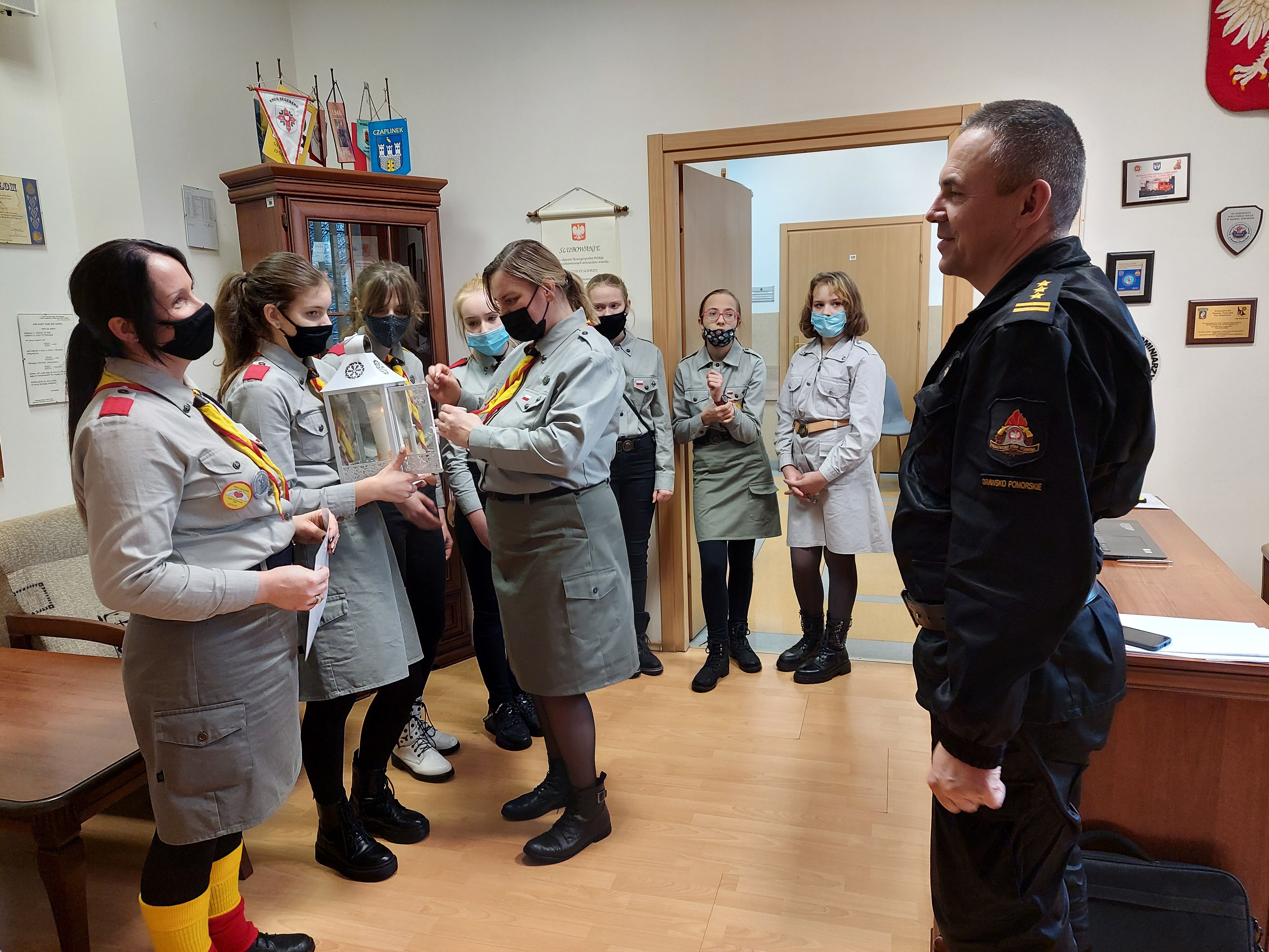 22 grudnia 2021 r. harcerze z 8 WDH „OGNIKI” wręczyli Komendantowi Państwowej Straży Pożarnej w Drawsku Pom. str. bryg. Pawłowi Dymeckiemu „ Betlejemskie Światło Pokoju” wraz z życzeniami świątecznymi.