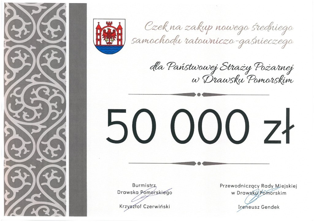Niezwykle miłym akcentem, było przemówienie Burmistrza Drawska Pomorskiego Pana Krzysztofa Czerwińskiego, który obok życzeń przekazał na ręce Komendanta Powiatowego Państwowej Straży Pożarnej w Drawsku Pomorskim bryg. Pawła Dymeckiego promesę w wysokości 50 000 zł stanowiącą znaczną część wkładu finansowego na zakup nowego samochodu ratowniczo – gaśniczego dla Komendy Powiatowej Państwem Straży Pożarnej w Drawsku Pomorskim.
