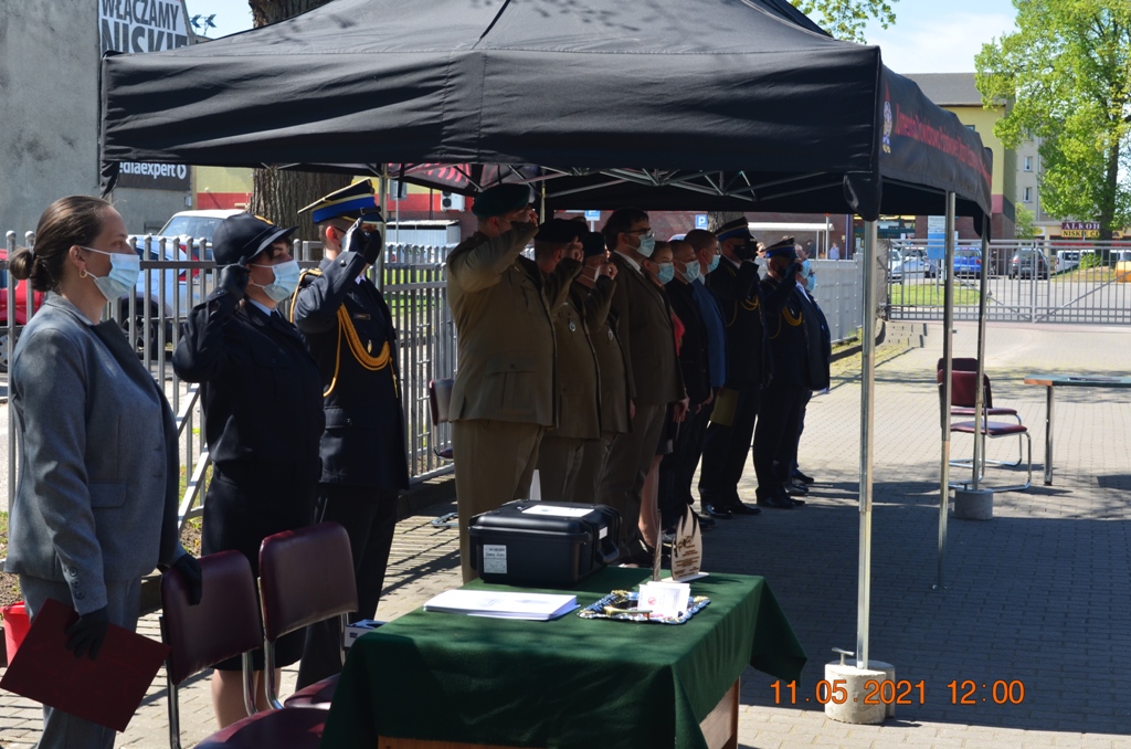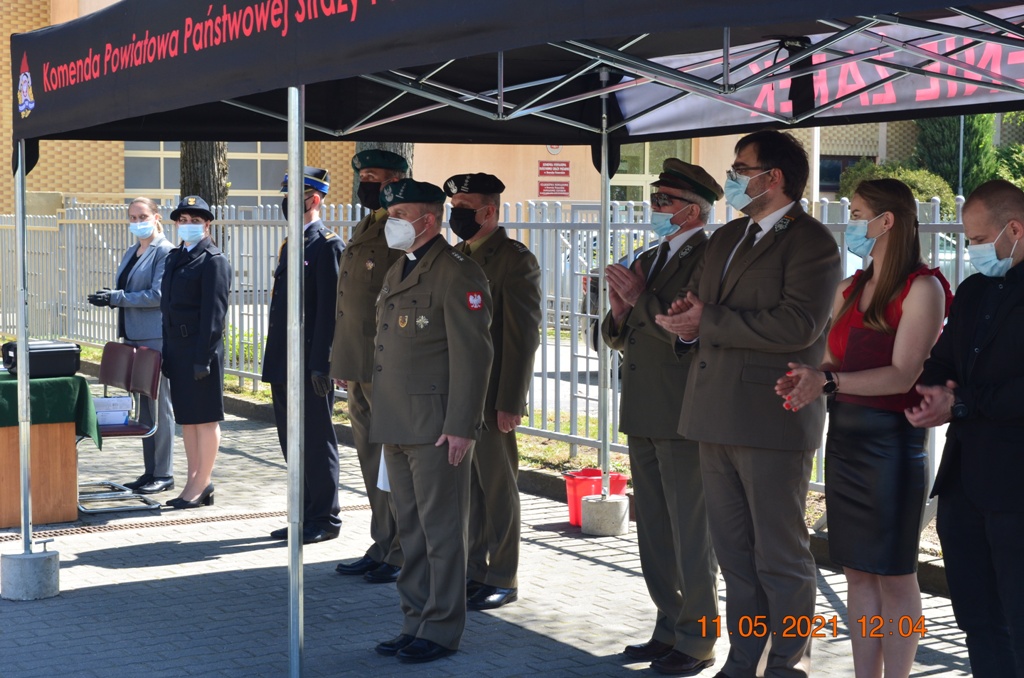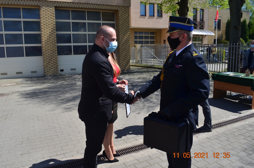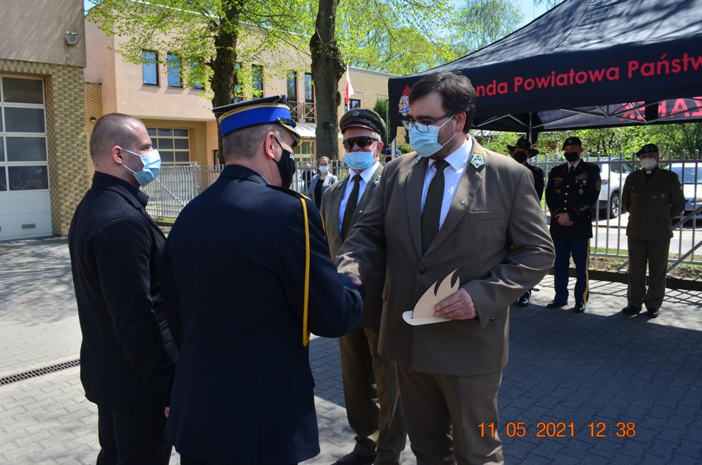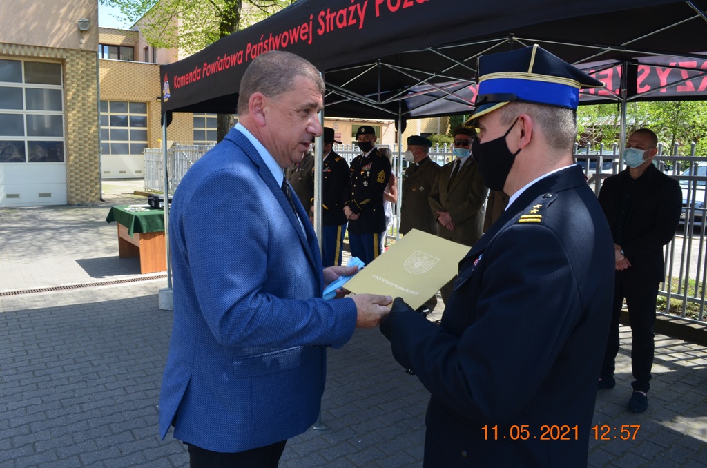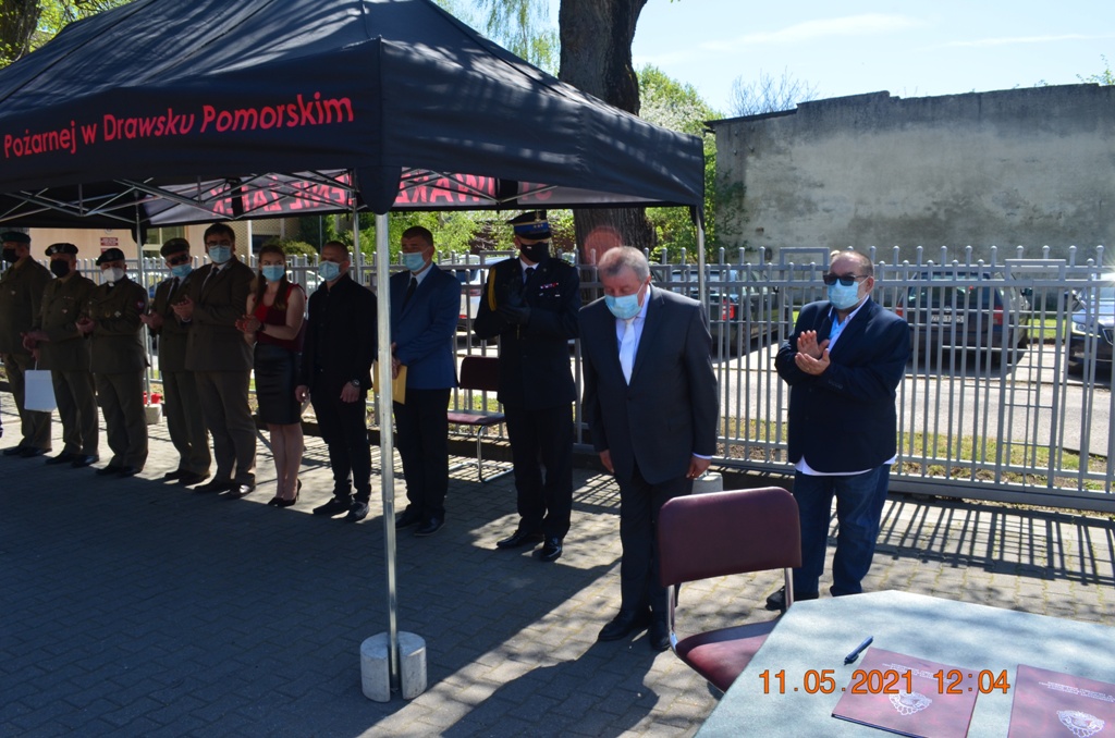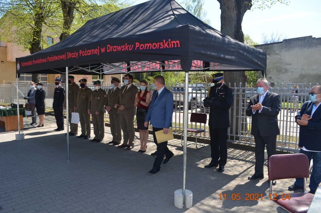 Starosta Drawski Pan Stanisław Cybula w swym wystąpieniu obok życzeń złożył również podziękowania dla strażaków KP PSP w Drawsku Pomorskim za zaangażowanie w walkę z pandemią COVID-19. Jak zauważył, w okresie największego strachu, gdy wszelkie środki ochronne były towarem deficytowym drawscy strażacy udzielili wsparcia dla władz samorządowych, instytucji i ludności cywilnej szyjąc maseczki ochronne, wytwarzając środki do dezynfekcji oraz prowadząc szeroko zakrojoną kampanię informacyjną w zakresie przeciwdziałania COVID-19. Jak zaznaczył Starosta Drawski Pan Stanisław Cybula między innymi dzięki takiej postawie strażaków oraz społeczeństwa Powiat Drawski przez bardzo długi czas nie miał stwierdzonych zachorowań.